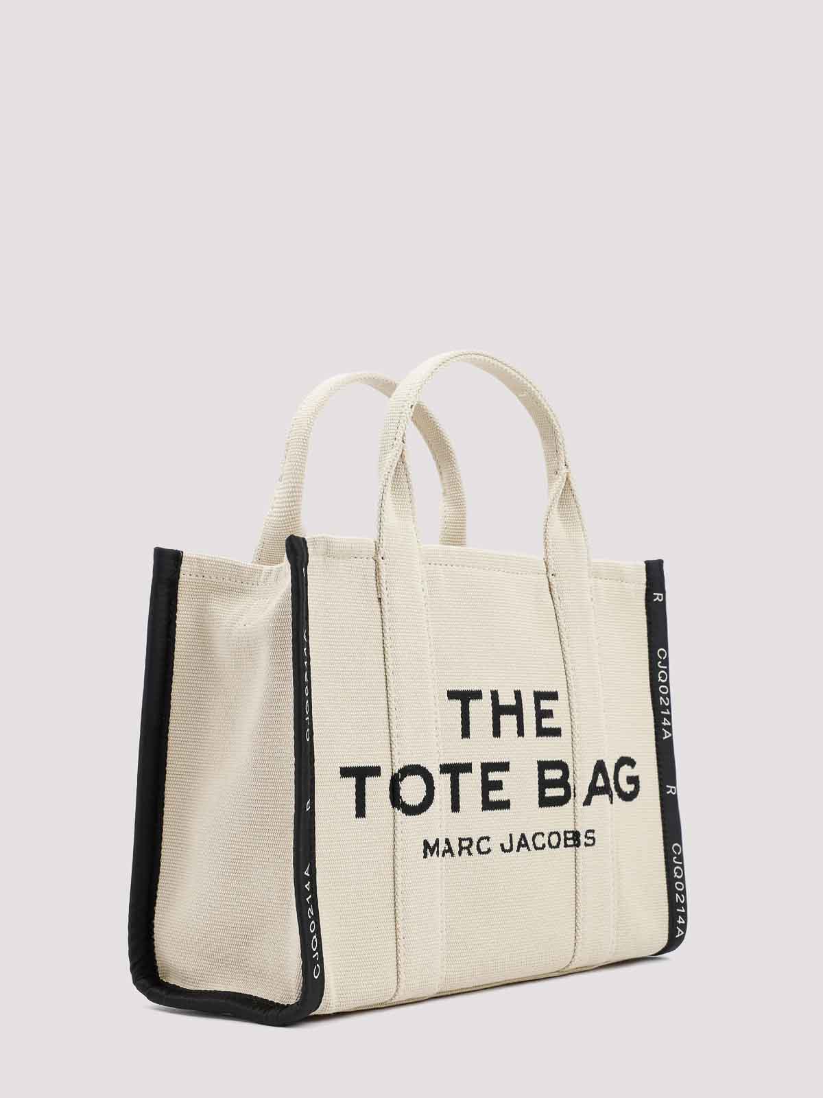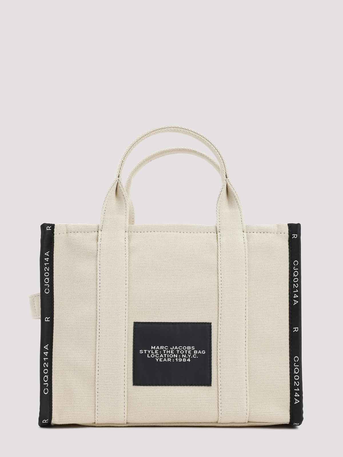 Die mittelgroße Tragetasche von Marc Jacobs aus Baumwolle in Beige. Beigefarbene Baumwolle, schwarze Randverzierung, Reißverschluss oben, Henkel an der Oberseite. verstellbarer schwarzer Schultergurt, 1 Innentasche mit Reißverschluss, 2 Einschubfächer, 1 Kartenfach. Vollständig gefüttert, die Tragetasche ist auf der Vorderseite schwarz bedruckt.