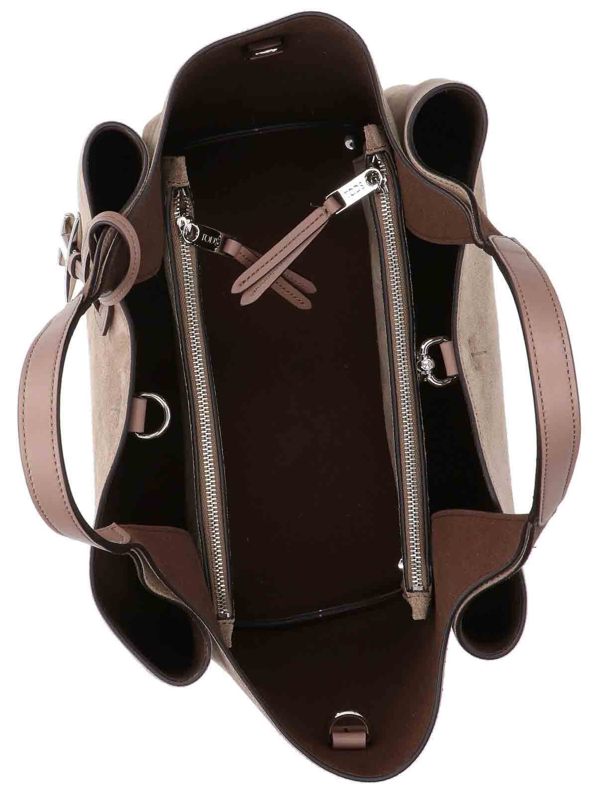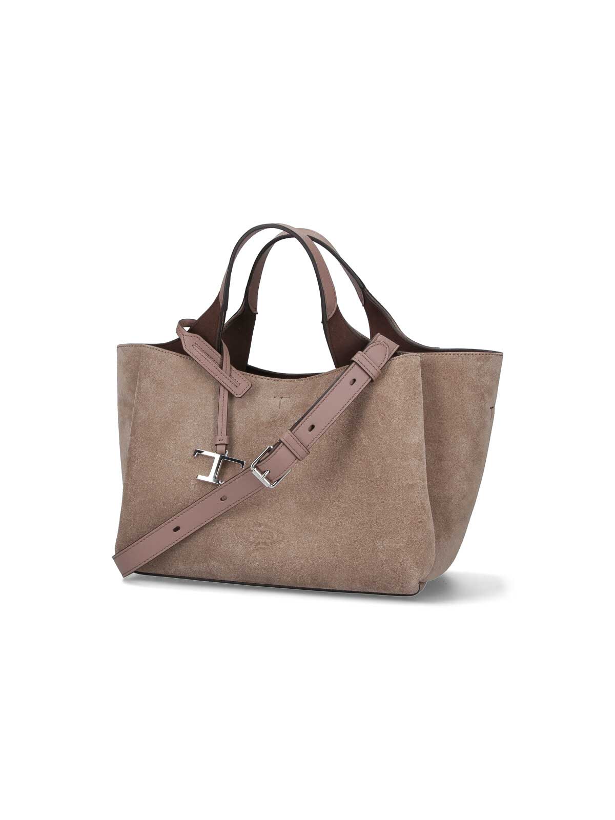 T-Timeless Mini-Tragetasche von Tod's aus taupefarbenem Veloursleder, zwei Tragegriffe an der Oberseite, verstellbarer und abnehmbarer Schultergurt, Anhänger mit t-Timeless-Logo aus silberfarbenem Metall auf der Vorderseite, zwei flache Innentaschen mit Reißverschluss, drei einzelne Innenfächer.