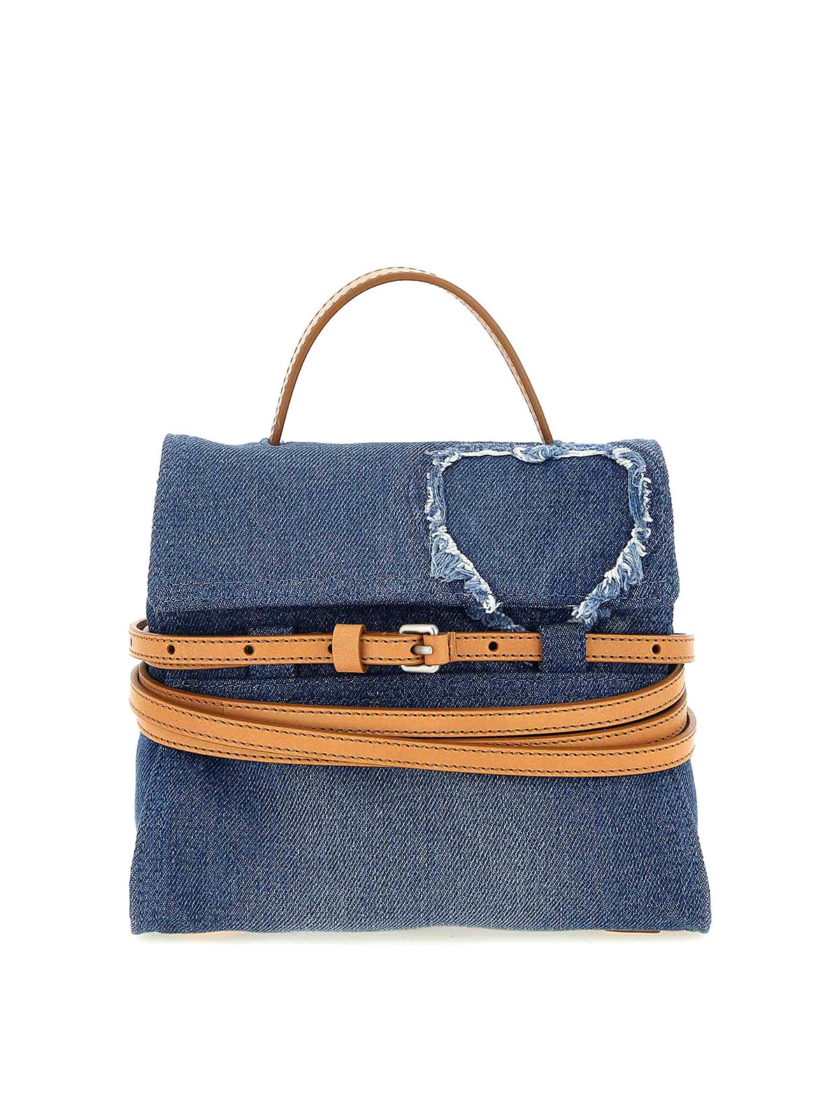 Tie Me' Handtasche aus Denim und Leder, zerstörte Details, fester Griff und verstellbarer und abnehmbarer Schulterriemen aus Leder, Knopfverschluss, Schnallenriemendetail.