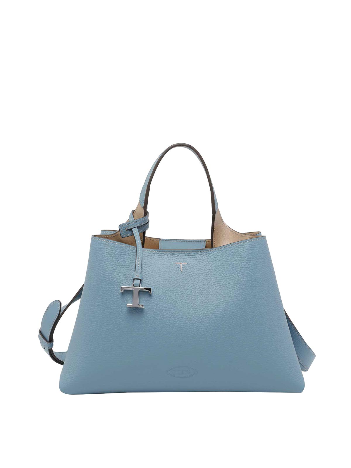 Kleine hellblaue Lederhandtasche, Hakenverschluss, 2 Fächer, 2 Taschen mit Reißverschluss, verstellbarer Riemen, T-Charm-Logo auf der Vorderseite