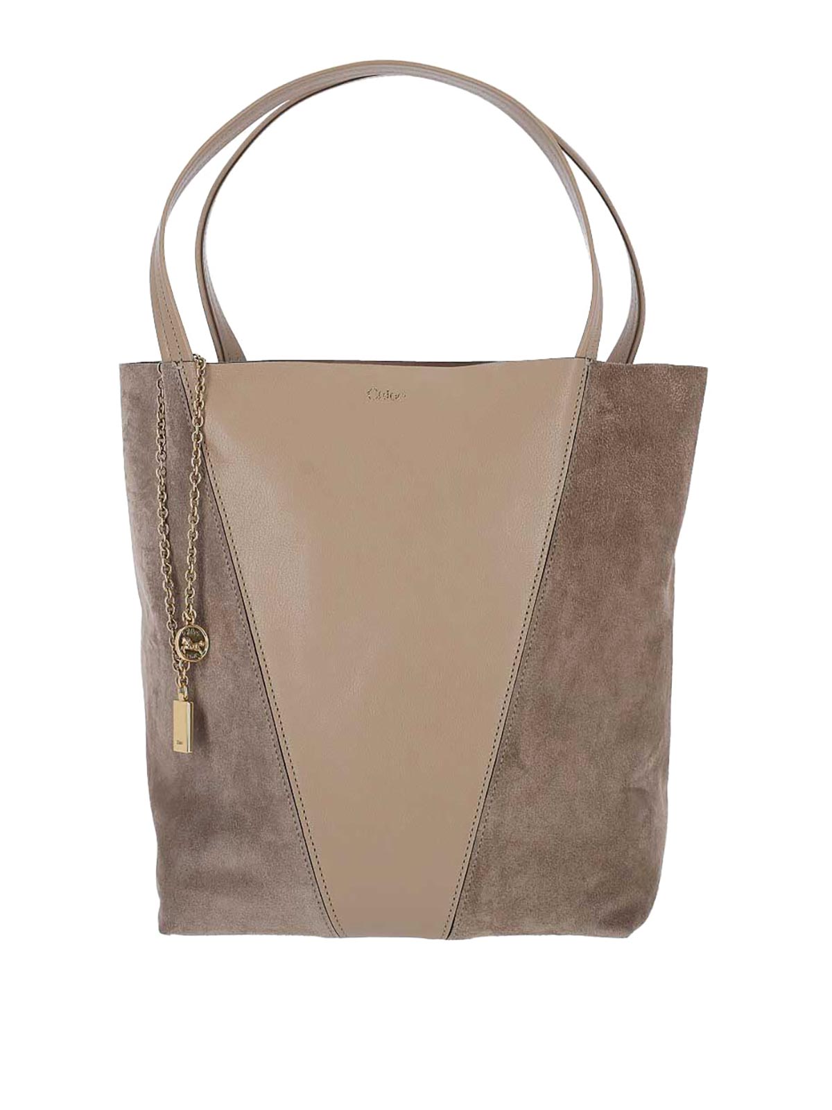 Spin Chlo Tragetasche aus braunem genarbtem Leder, hellfarbenes, getäfeltes Design, zwei Henkel, goldenes Metallkettendetail mit Logo-Anhänger, verstellbar mit goldenem Metallring, goldener Logoprägung auf der Vorderseite, ein Innenfach.
