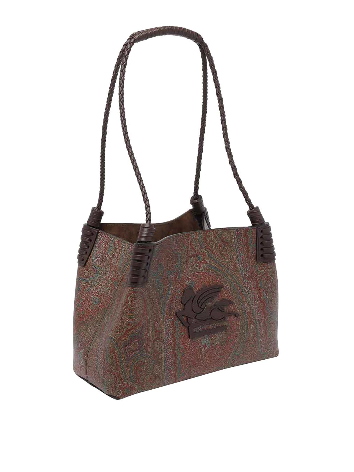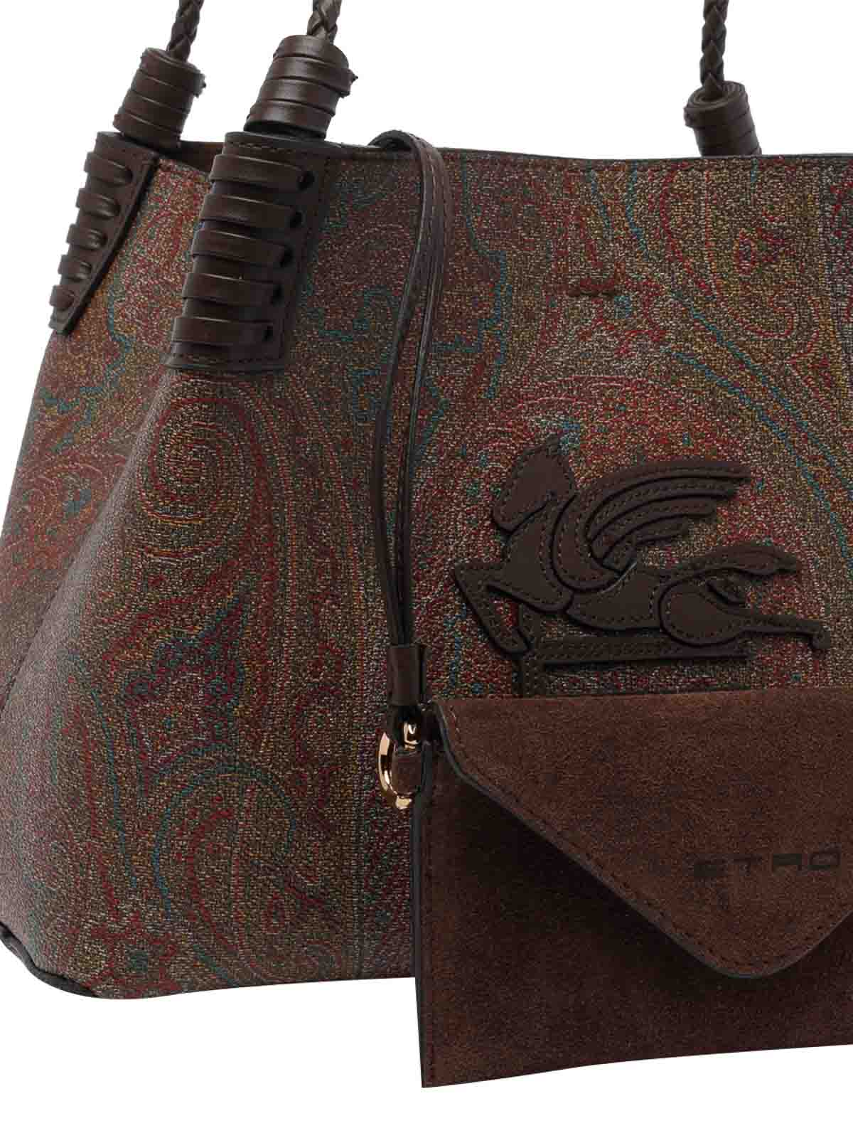 Etro braune kleine Einkaufstasche mit Arnika-Muster, Karabinerverschluss, herausnehmbare Innentasche, 2 Schulterriemen, Paisley-Print, Logo auf der Vorderseite