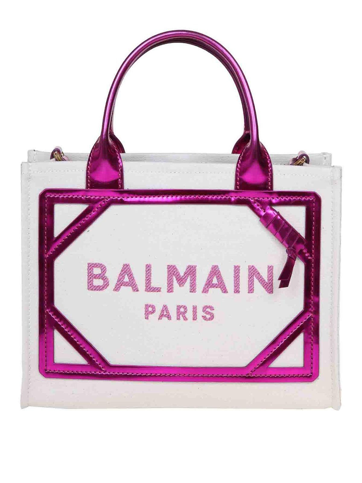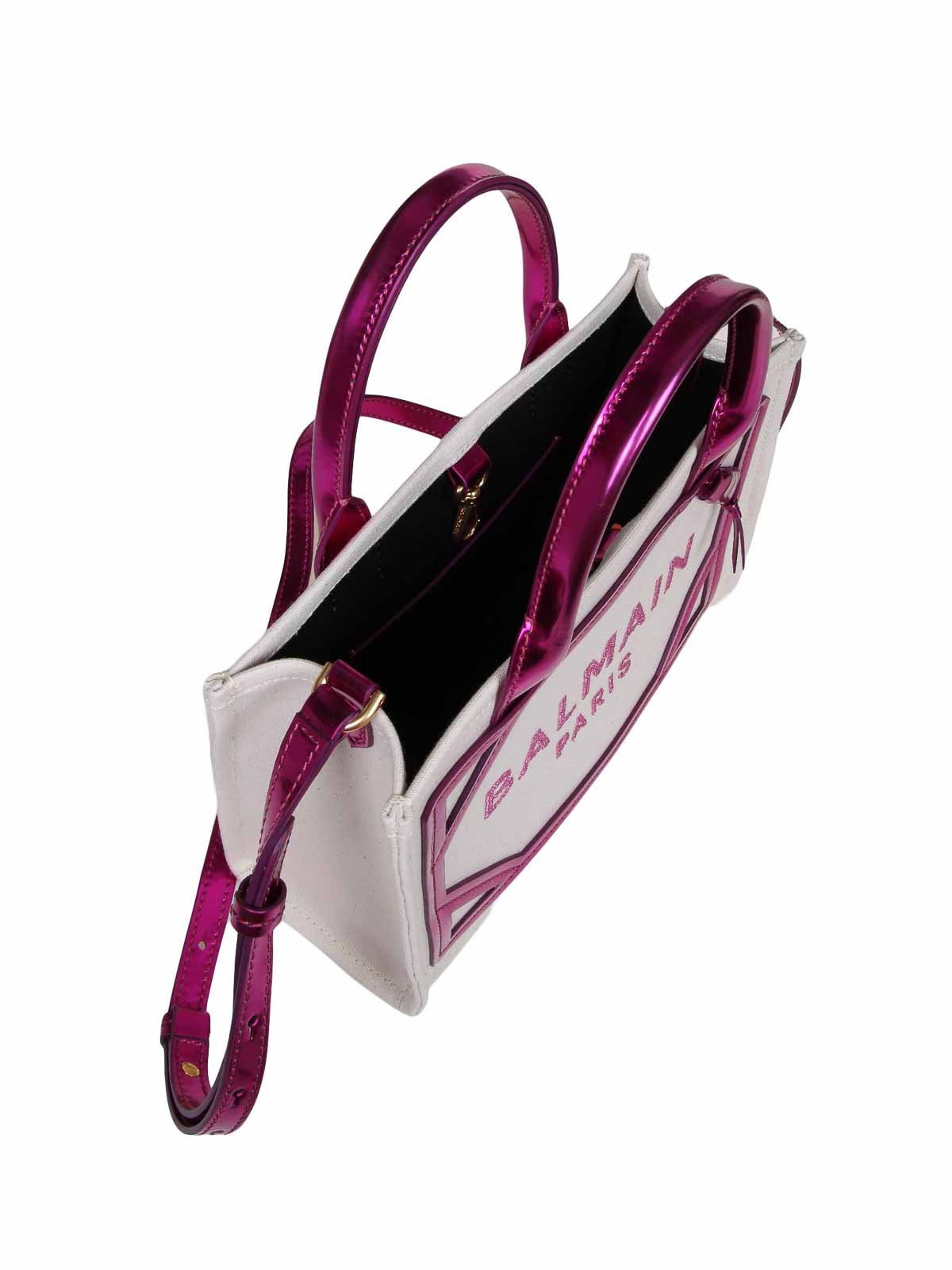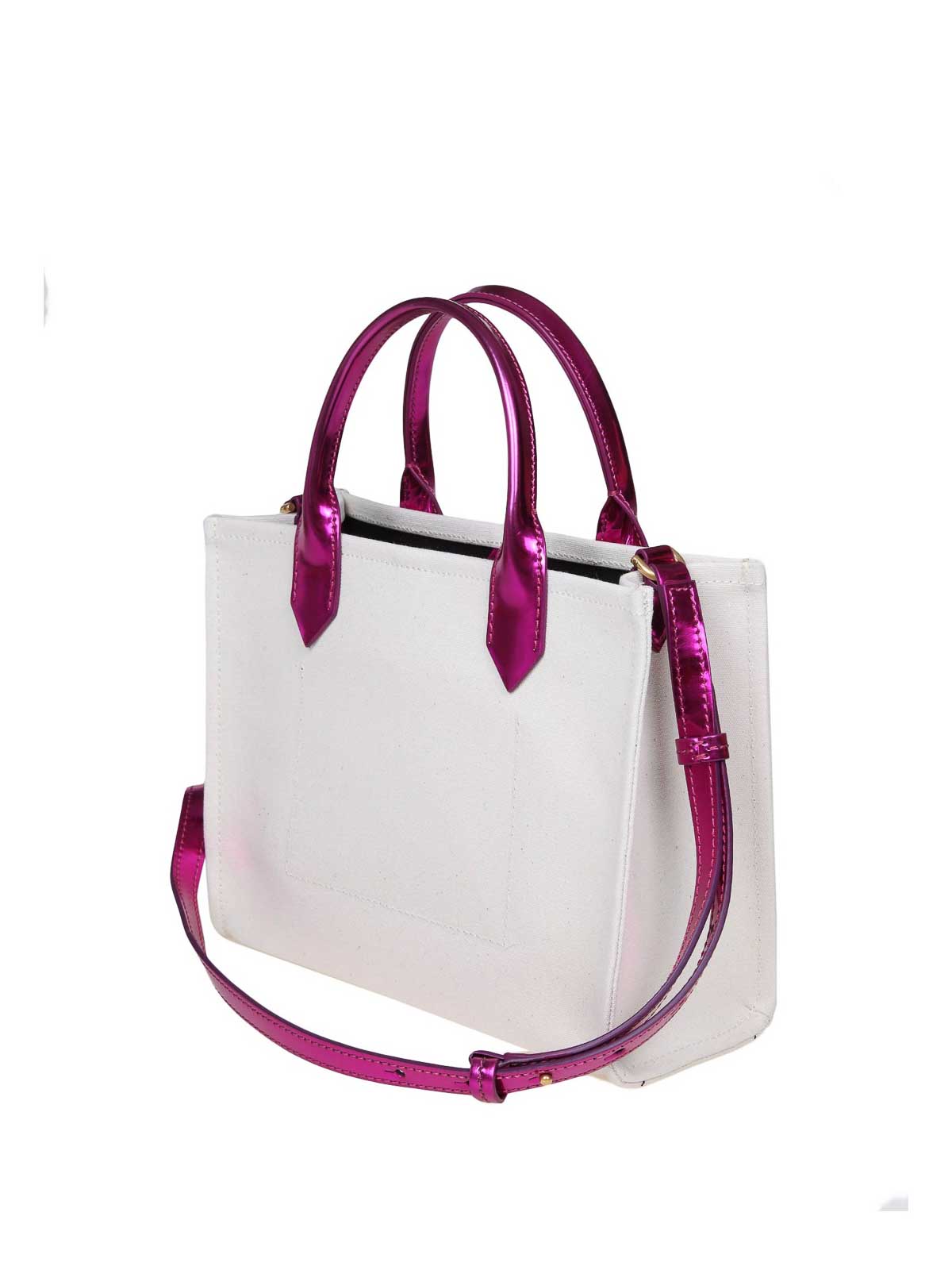 Handtasche aus Canvas und pinkfarbenem Logo auf der Vorderseite, auf der verstellbaren, laminierten Innentasche aufgestickt