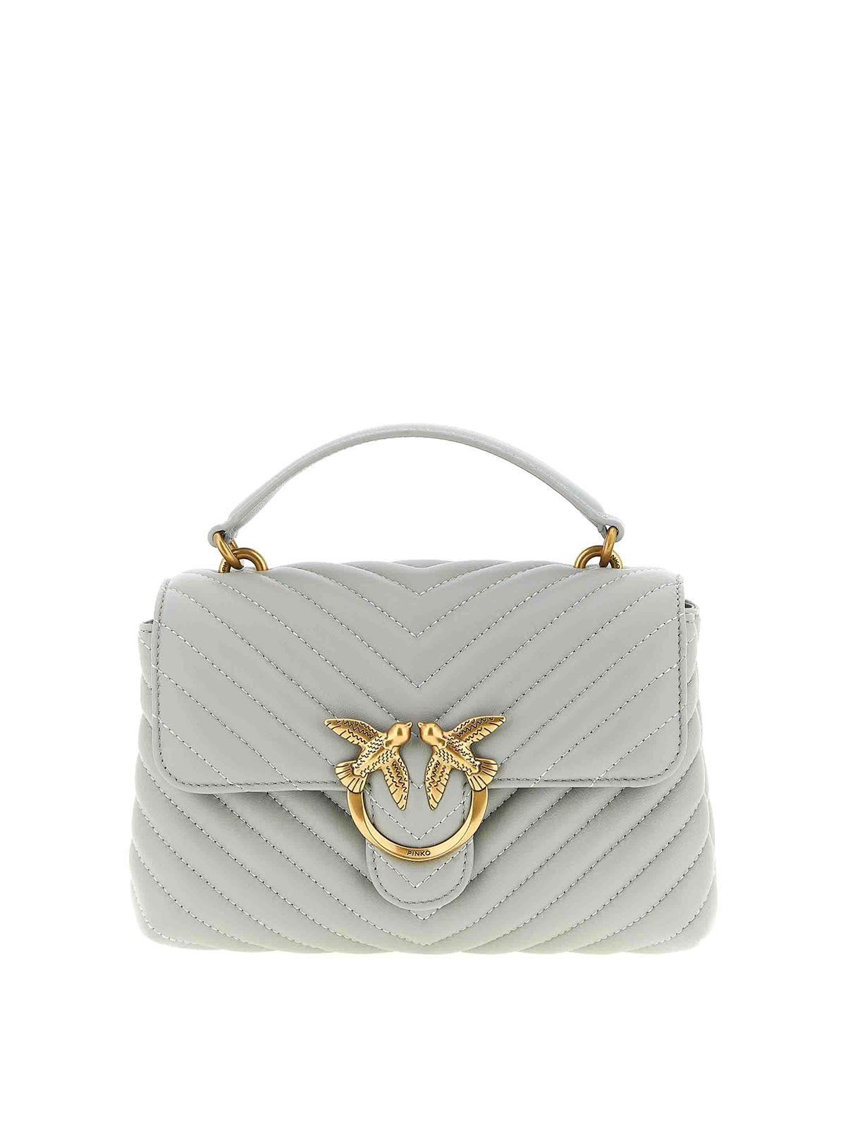 Mini Lady Love Puff Handtasche aus gestepptem Nappaleder mit Chevron-Muster, Magnetverschluss mit ikonischer Metallschnalle „Love Birds Diamond Cut“, fester Griff, Futter aus Mikrofaser-Veloursleder, Kettenschulterriemen mit abnehmbarem Schultergurt aus Nappaleder.