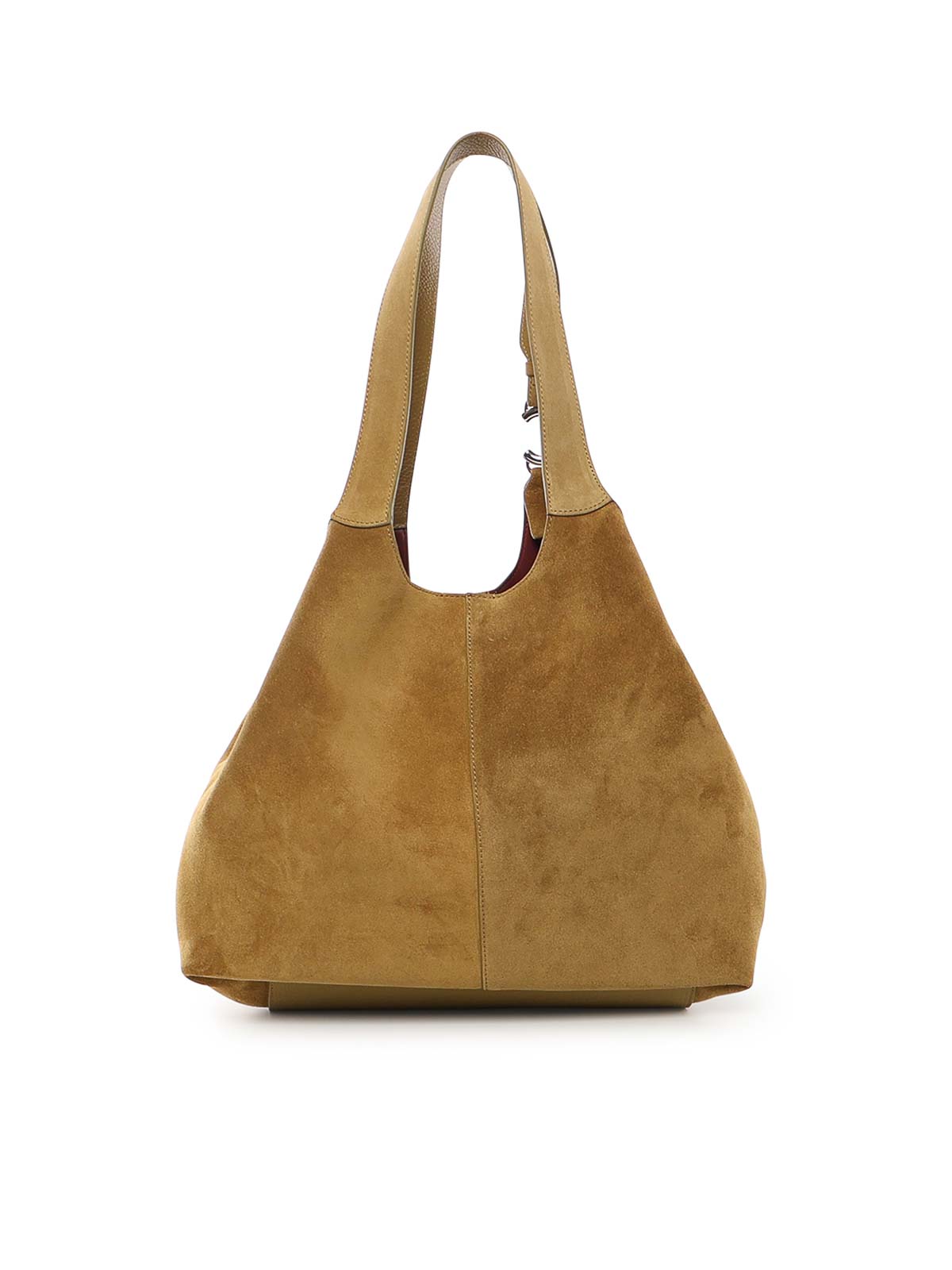 aus Veloursleder, Knopfverschluss oder horizontaler Verschluss mit Manschettenknopf, Clutch mit abnehmbarem Reißverschluss, Tragbarkeit auf der Schulter, Maße: 35 x 27 x 13 cm, Designerfarbe: Seegras