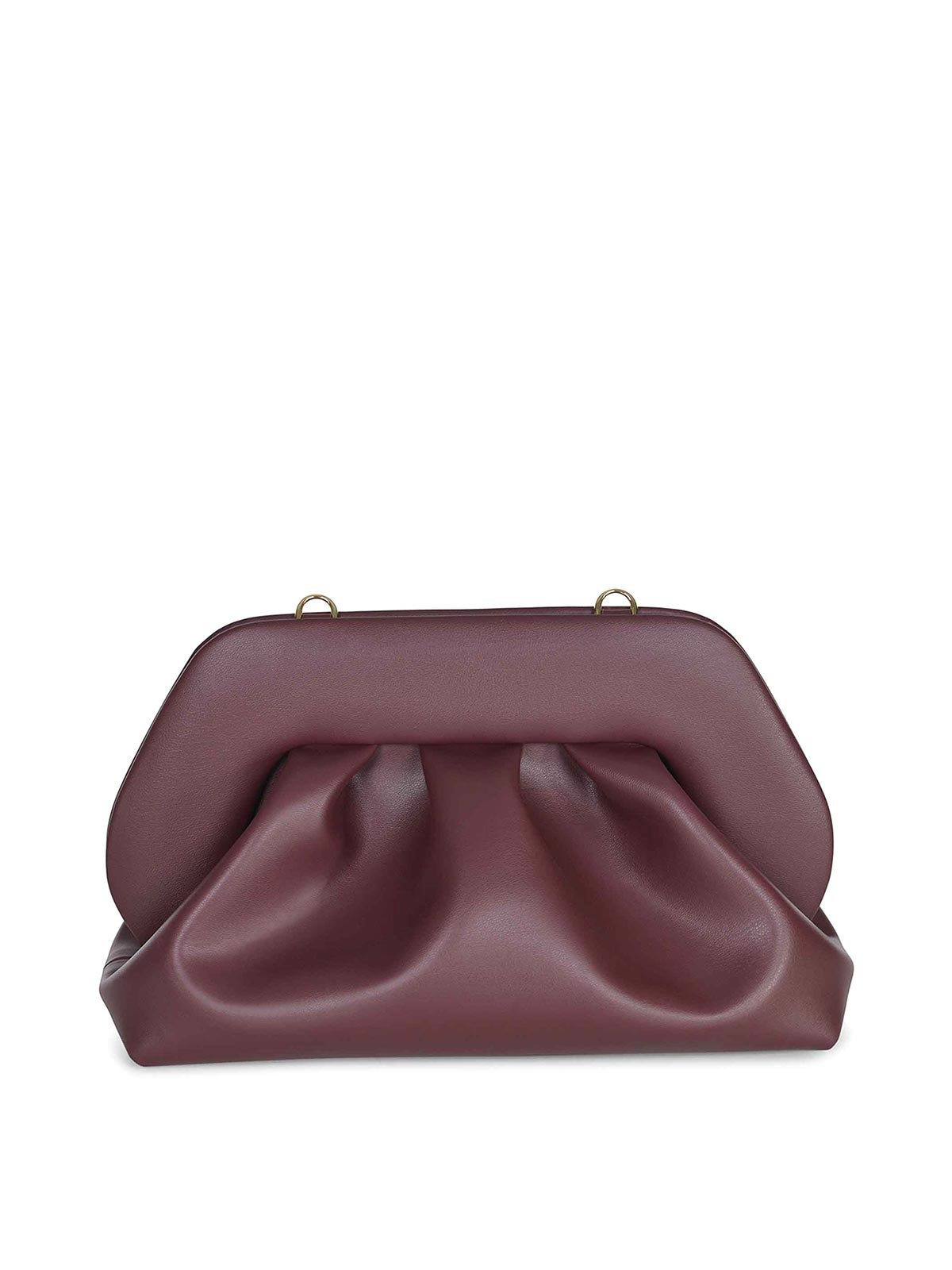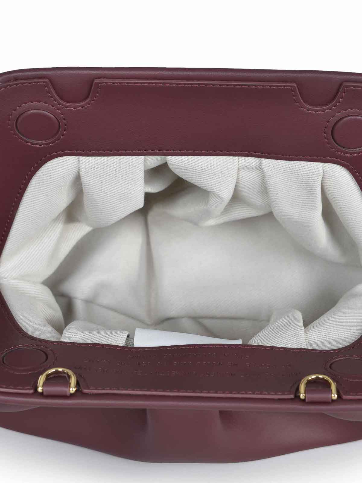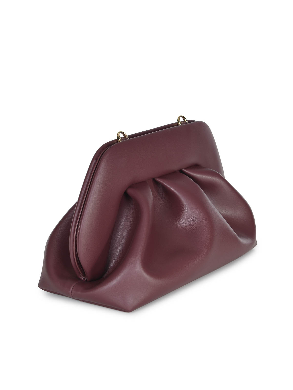 Themoir Tia Tasche aus weinrotem Kunstleder. Hergestellt aus recycelten und umweltfreundlichen Materialien. Goldfarbene Metallbeschläge. Riffeldetail. Magnetverschluss oben. Innenfutter aus Bio-Baumwolle. Verstellbarer, abnehmbarer Schultergurt. Höhe 16 cm, Breite 30 cm, Tiefe 11 cm. 100% PU, hergestellt in Italien