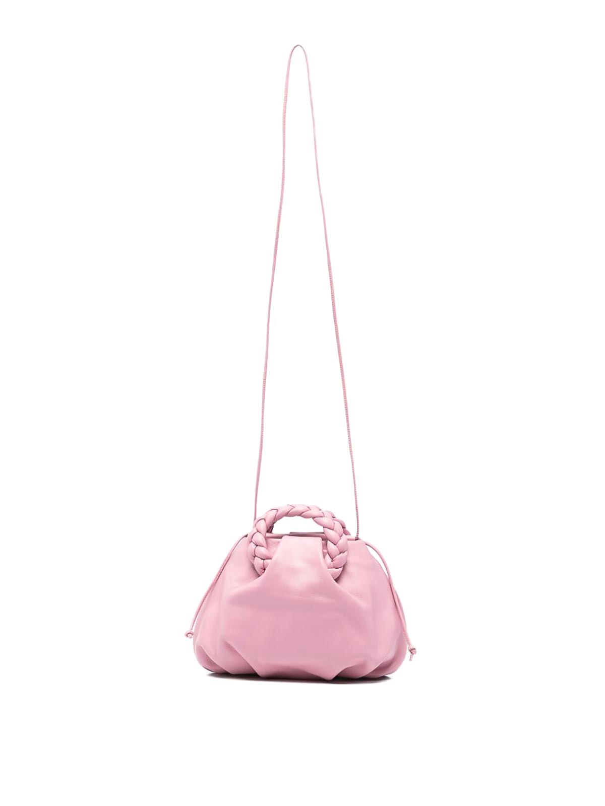 Rosafarbener Schultergurt mit geflochtenen Griffen und Kordelzug. Dieses Modell wird komplett mit einem schützenden Staubbeutel geliefert.