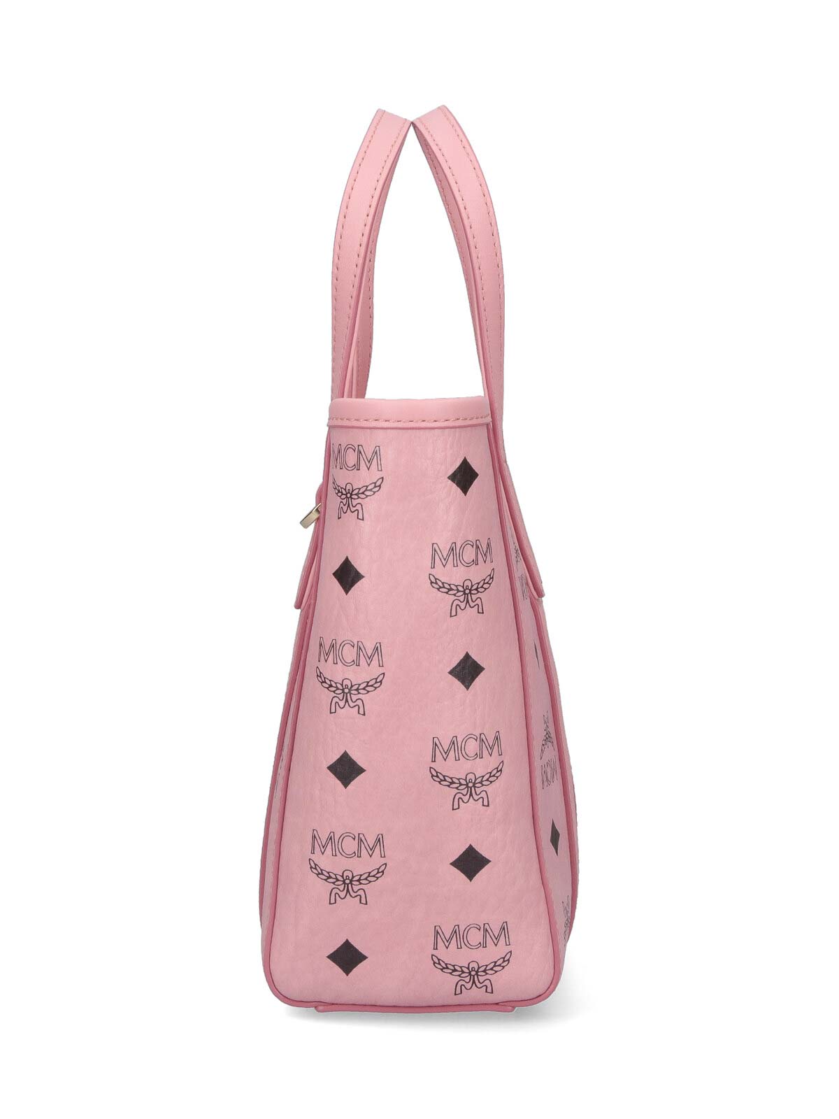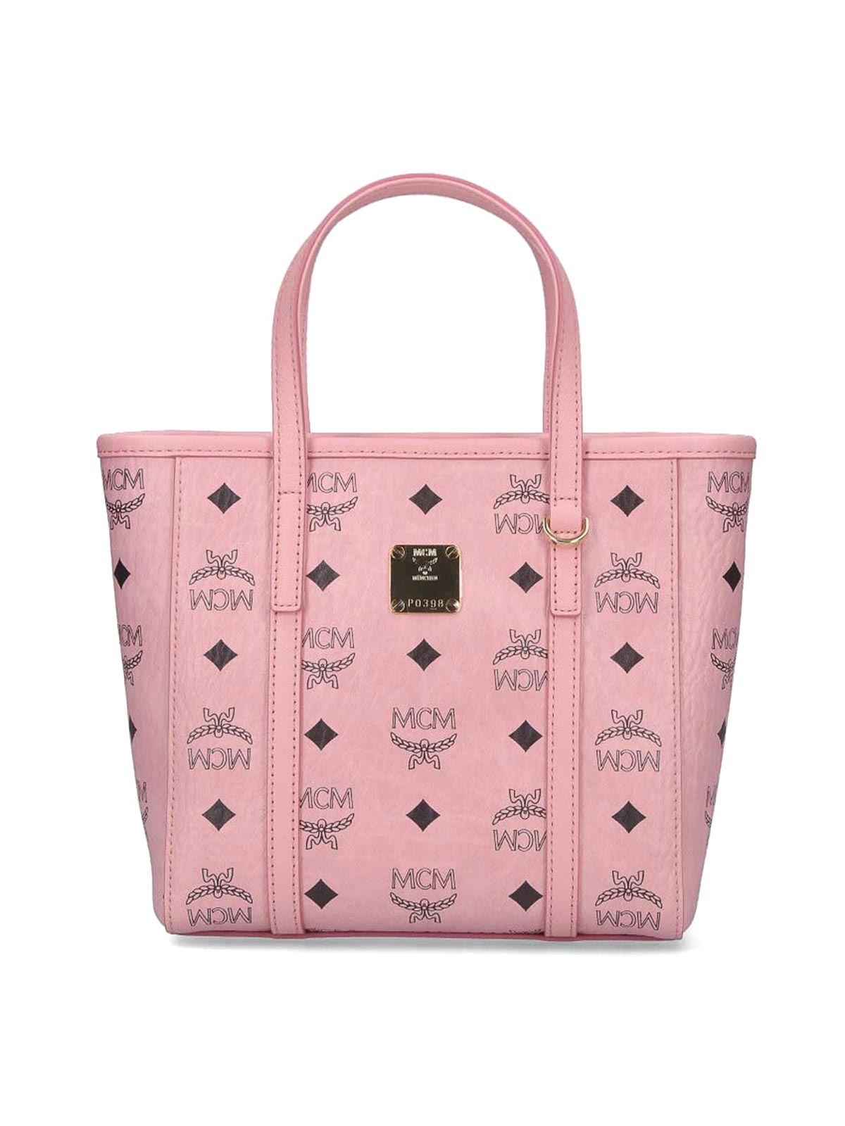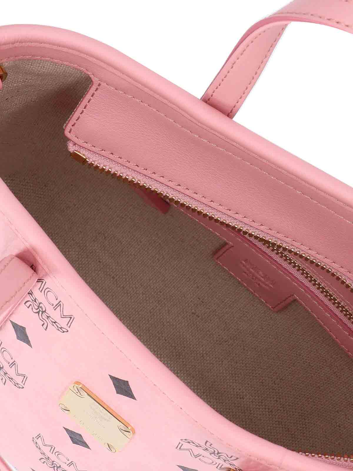 Kleine Toni Shopper MCM Tragetasche in rosa Visetos, Logo-Print, zwei Henkel, abnehmbarer und verstellbarer Schultergurt, Reißverschluss, Logoplatte aus Metall auf der Vorderseite, ein Innenfach.