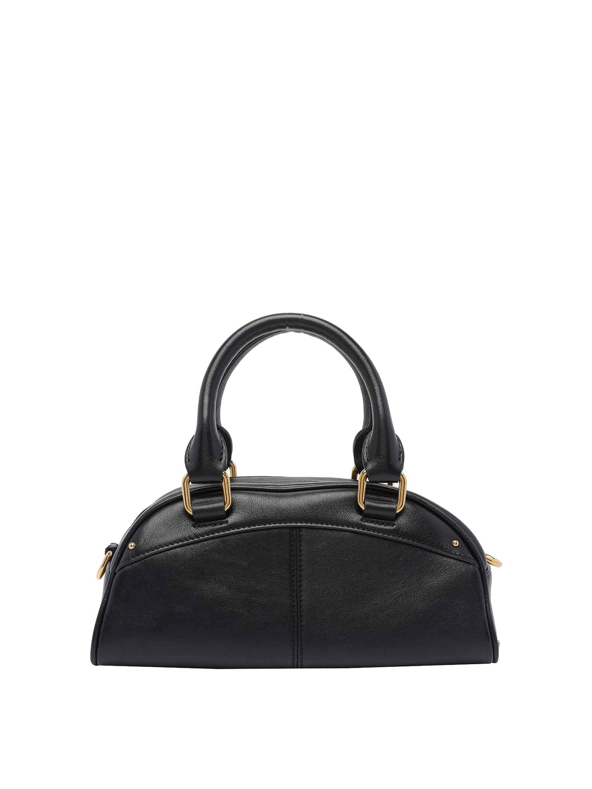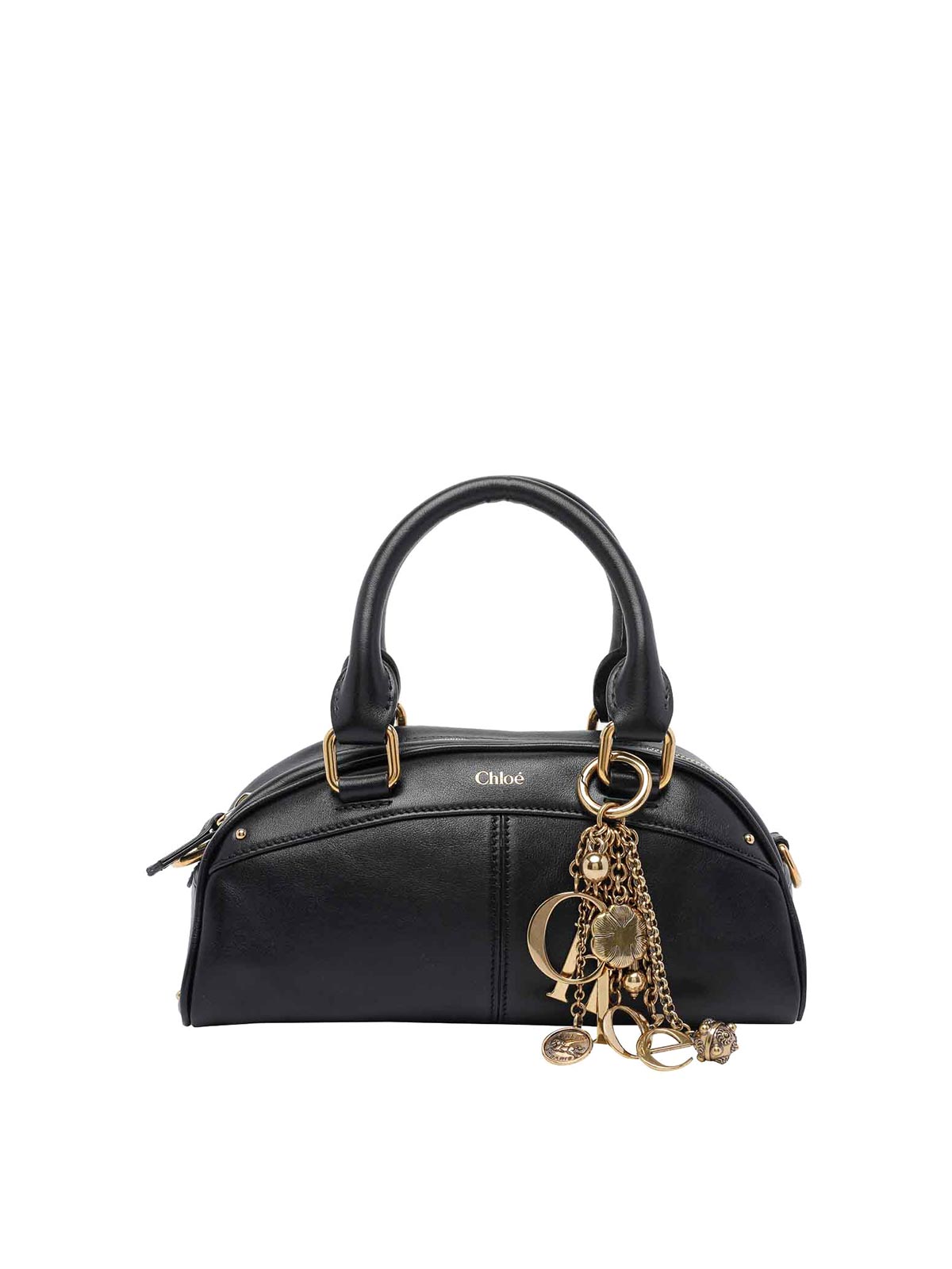 Kleine Chloe Bowlinghandtasche in Schwarz, Reißverschluss, offene Innentasche, verstellbarer und abnehmbarer Riemen, Charm-Detail