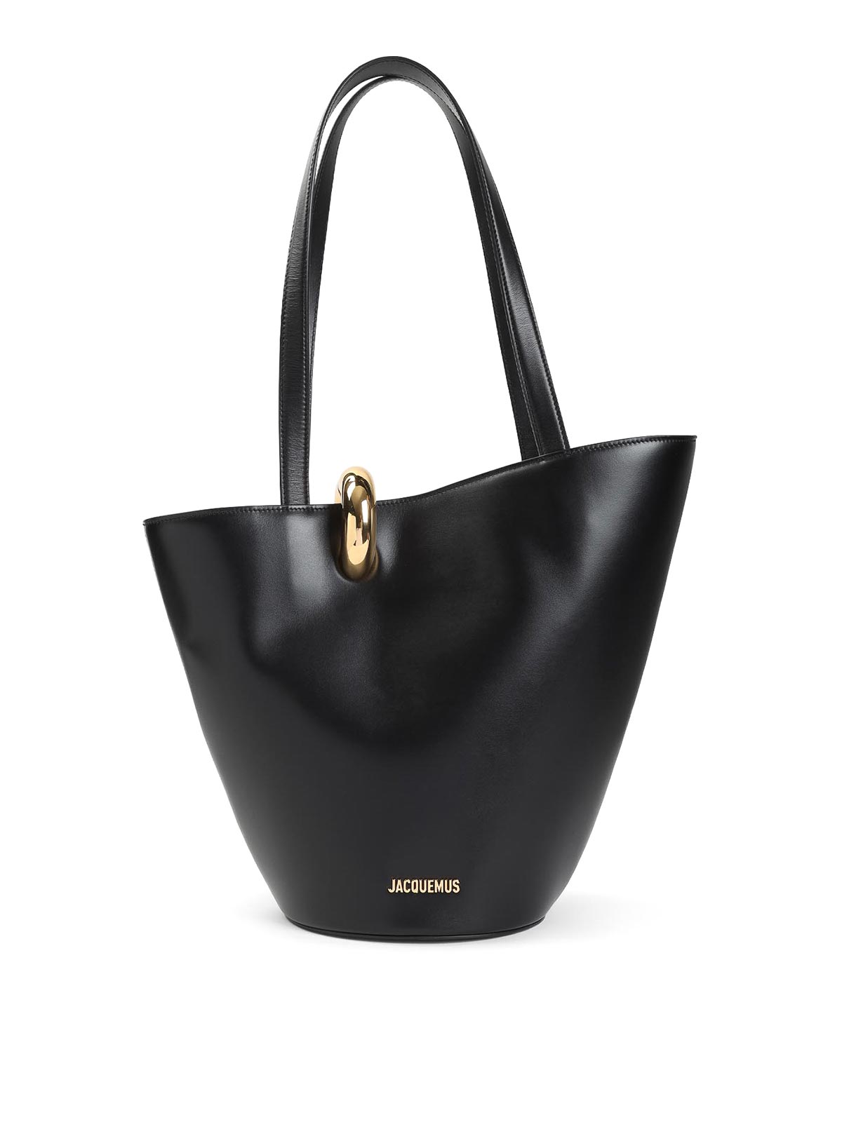 Jacquemus la bambola moyen Handtasche aus schwarzem Kalbsleder. Hergestellt aus schwarzem Kalbsleder, asymmetrisches Beuteltaschen-Design, goldfarbene Beschläge, obere Henkel, Ringverschluss, gestempeltes Logo auf der Vorderseite, Innentasche mit Reißverschluss, gefüttert.