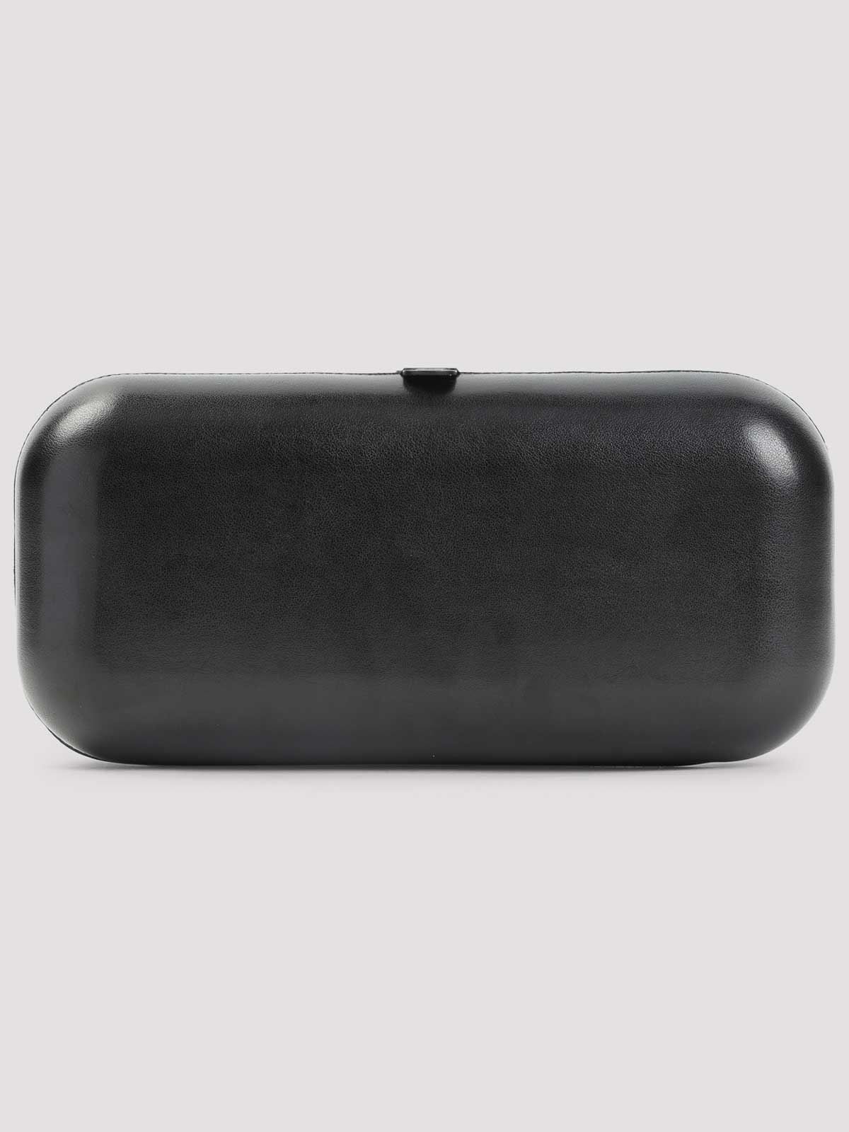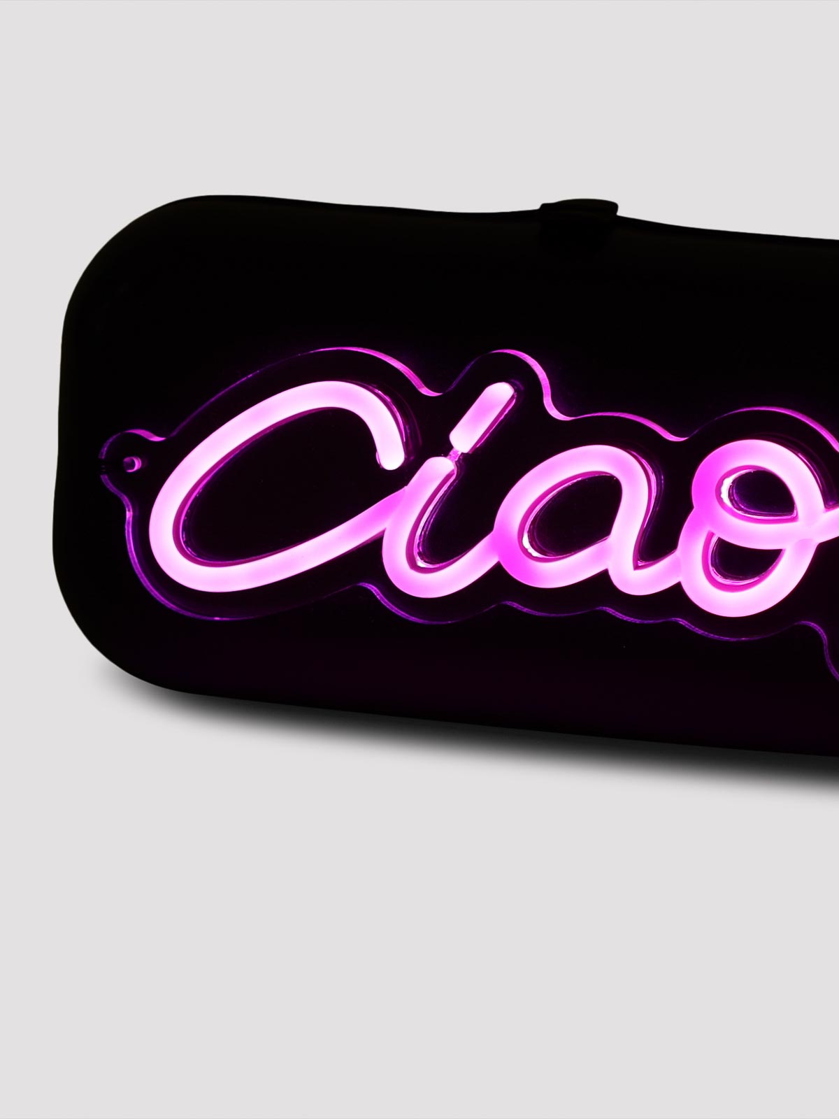 Schwarze Ciao-Tasche von Moschino. Tasche aus schwarzem Polyurethan, Druckknopfverschluss oben, kontrastierendes rosafarbenes Ciao-Schriftzug auf der Vorderseite, tonaler verstellbarer und abnehmbarer Schultergurt, ein Hauptfach.