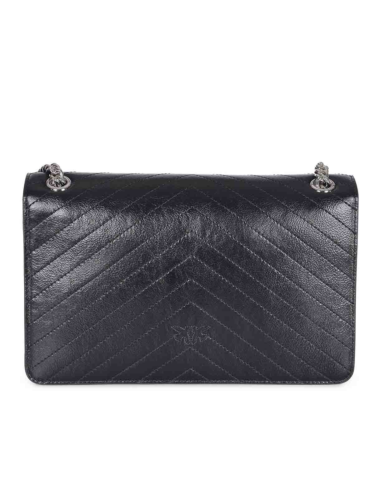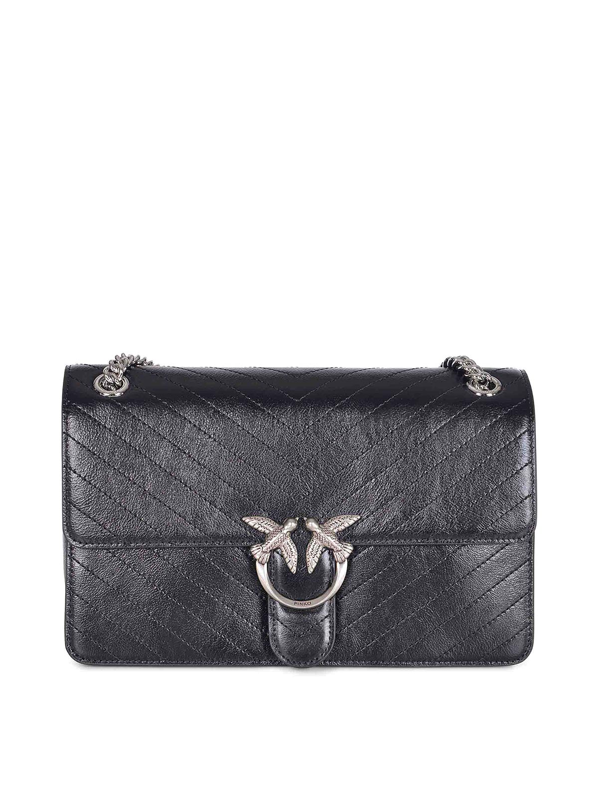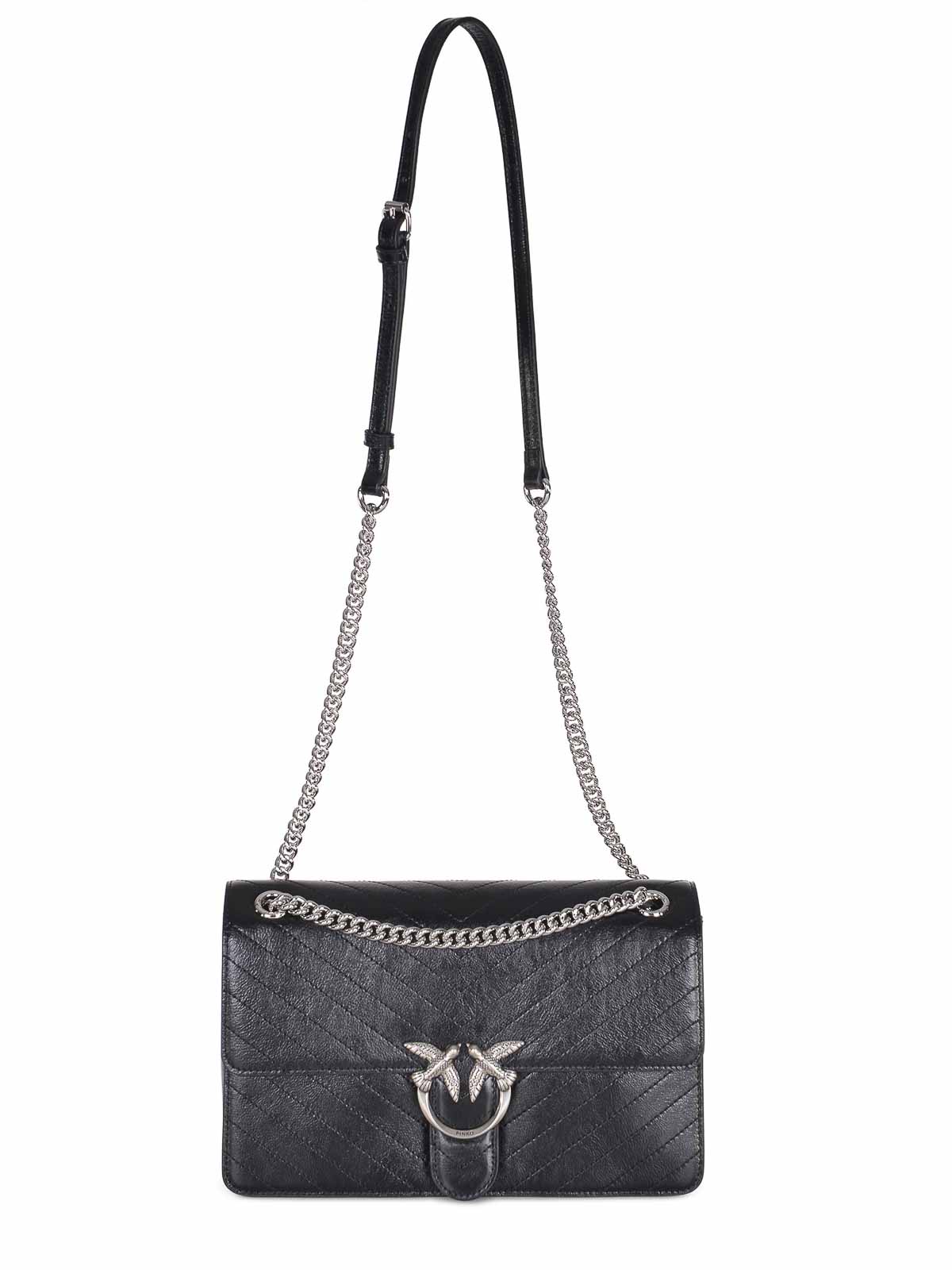 Pinko Tasche Love One Light Classic aus schwarzem Nappaleder. gebrauchter Steppeffekt. Verschluss mit ikonischer Love Birds Diamantschliff silberner Metallschnalle. Innenfutter mit Mikrofaser. Wandtasche. Tasche mit Reißverschluss. Schultergurt kombiniert runde Metallkette mit Nappa-Schulterpolster. Logo von Love Birds Diamond Cut, auf der Rückseite Ton in Ton aufgestickt. Höhe 16 cm, Breite 8 cm, Länge 27 cm. Futter 100% Baumwolle, 100% Leder.