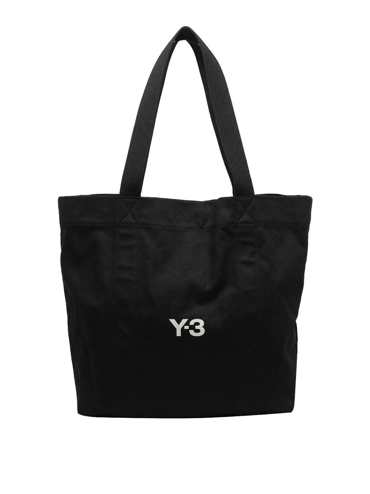 Adidas Y-3 schwarze Tragetasche, Clipverschluss, offene Innentasche, 2 Griffe, Logoprint auf der Vorderseite