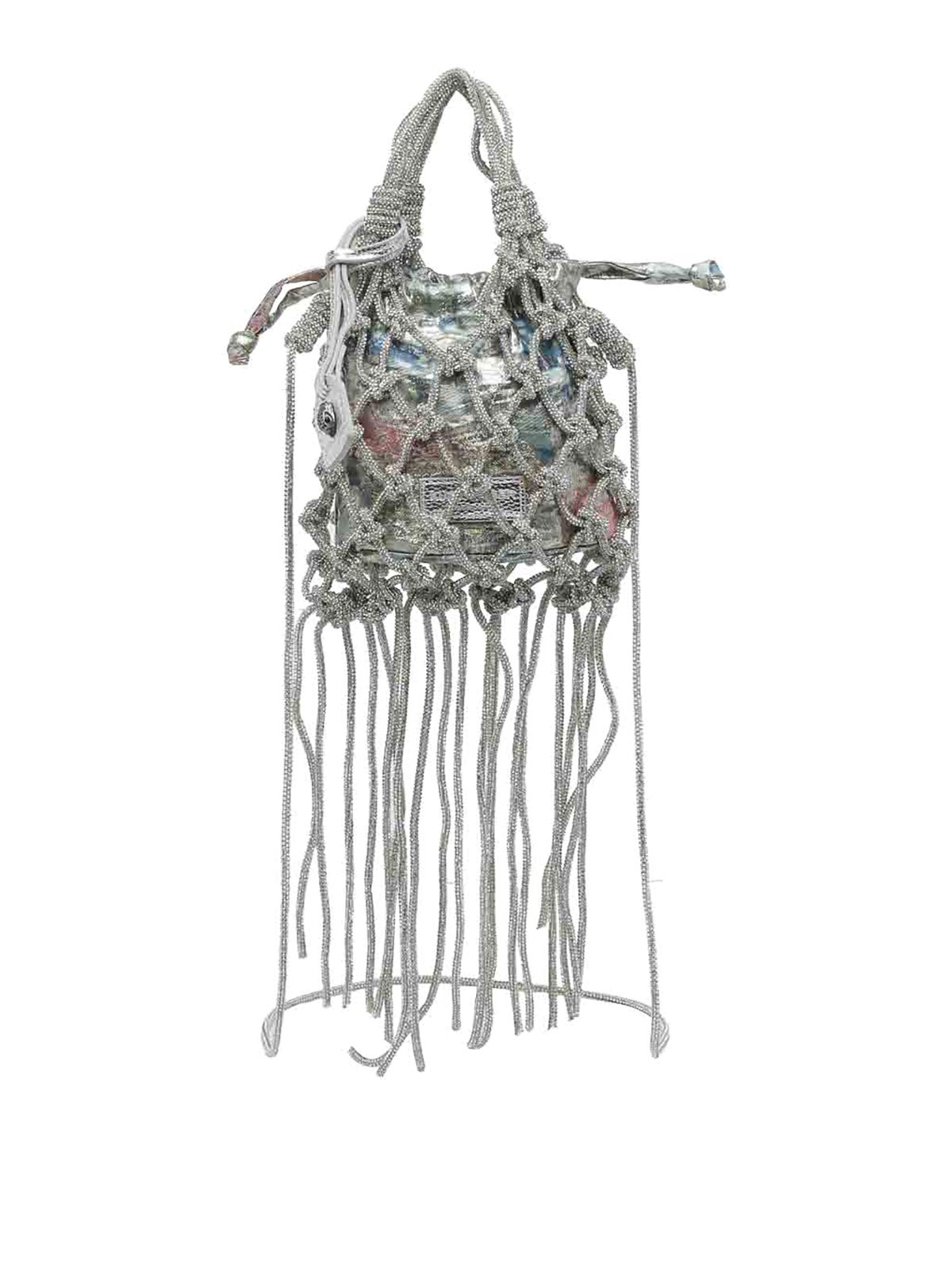Kurt Geiger Mini-Makramee-Handtasche, silberfarbener Verschluss, durchgehende Kristalle, 2 Griffe, Schulterriemen