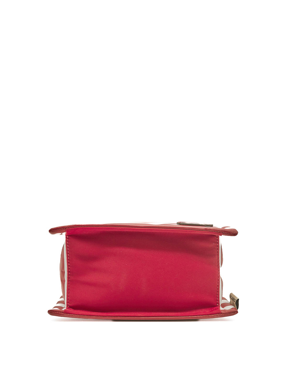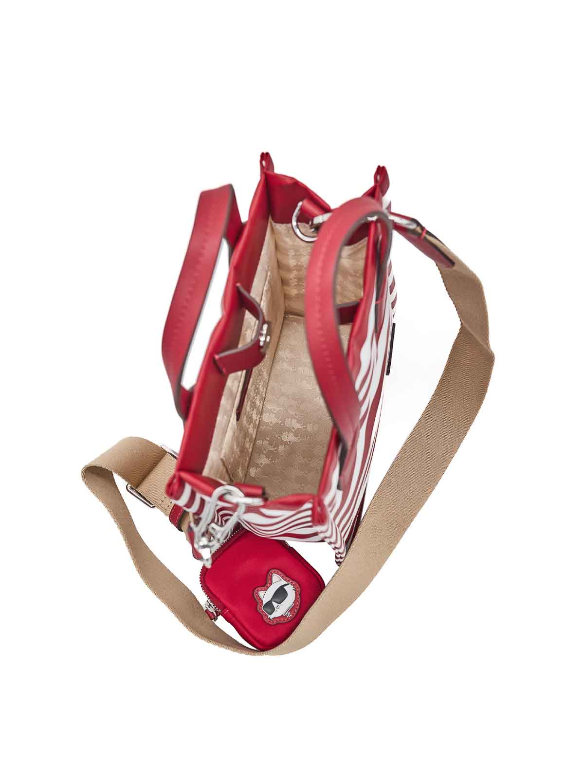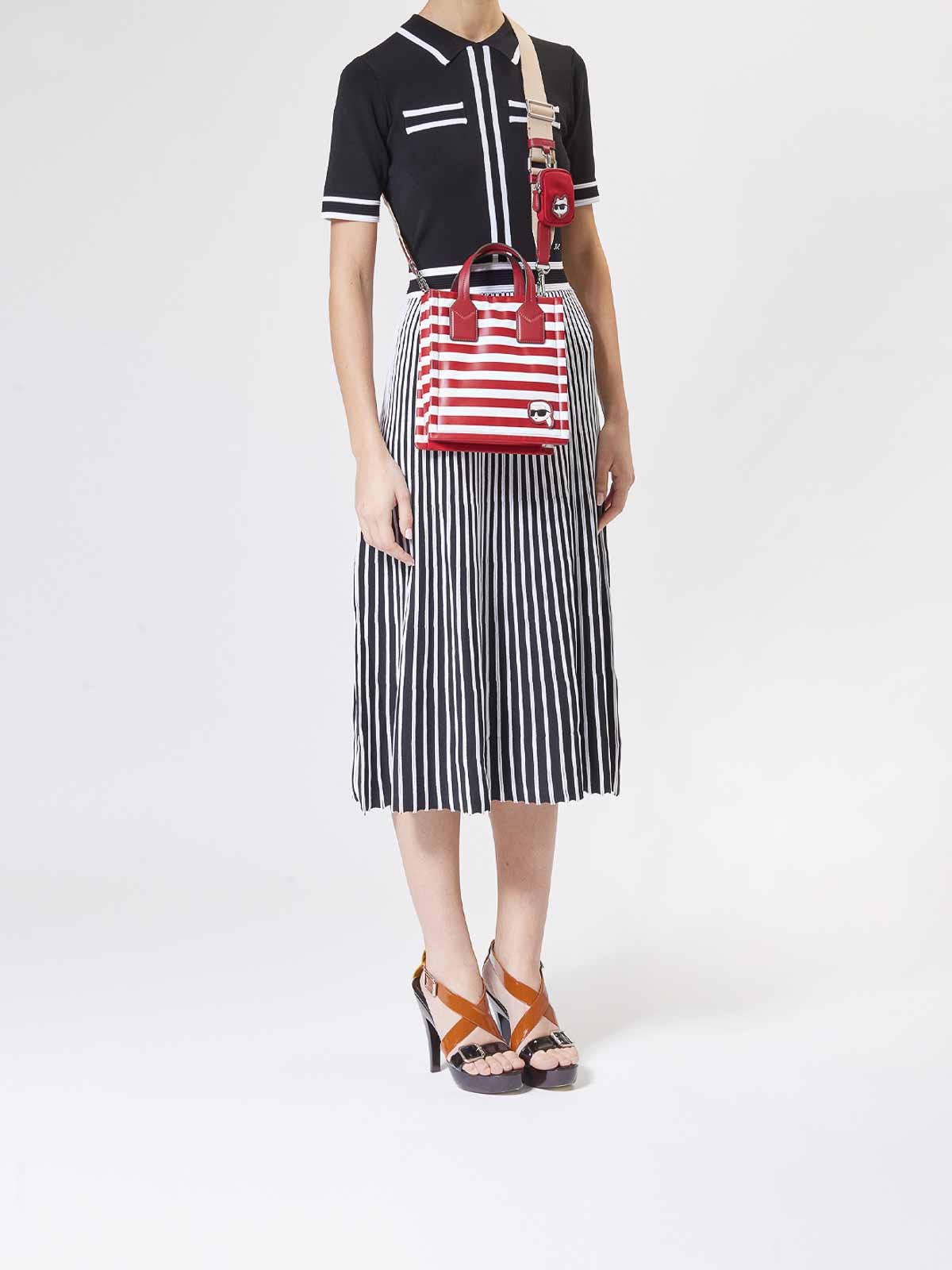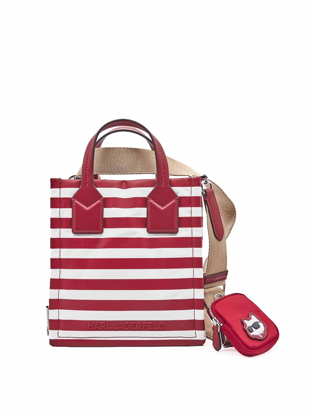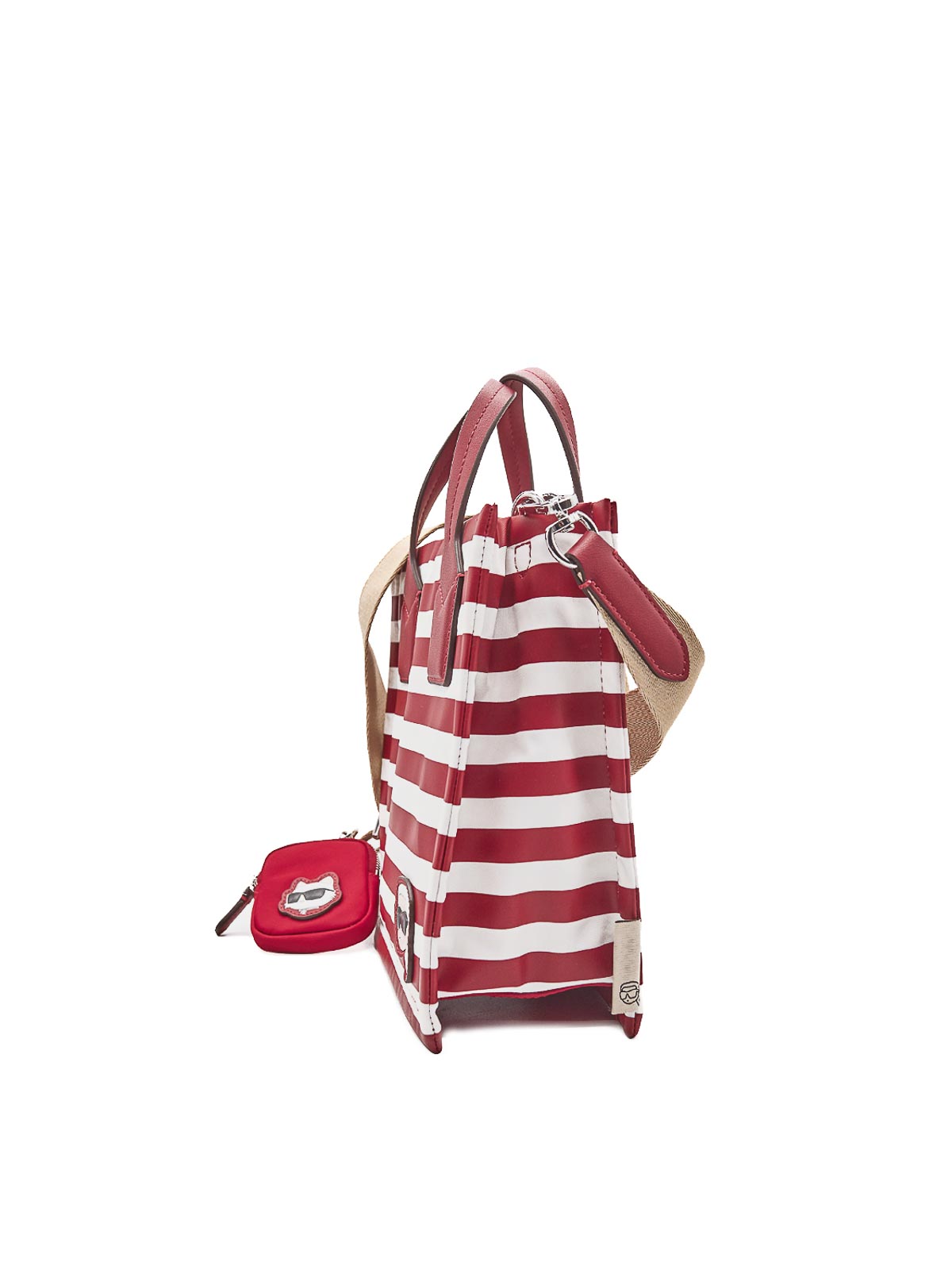 Kleine quadratische Tragetasche von Ikon in Rot/Weiß Diese Tragetasche von Karl Lagerfeld aus der Frühjahr-Sommer-Kollektion zeichnet sich durch das rote, bretonische und weiße Bodenmotiv aus. Sie hat eine geometrische Silhouette mit hochwertigem Scharnier und minimalistischem Motiv auf der Seite, ist mit doppelten Griffen ausgestattet und in der Farbe Beige abnehmbar und bietet verschiedene Transportmöglichkeiten. Die kleine Tasche mit Haken an der Rückseite sorgt für einen funktionalen und unverwechselbaren Streifenprint. Breton reason Ikon abnehmbare Mini-Tasche mit Scharnieren, Innentaschen, Signatur Karl Lagerfeld in Reliefform auf der Rückseite/recyceltes Weiß