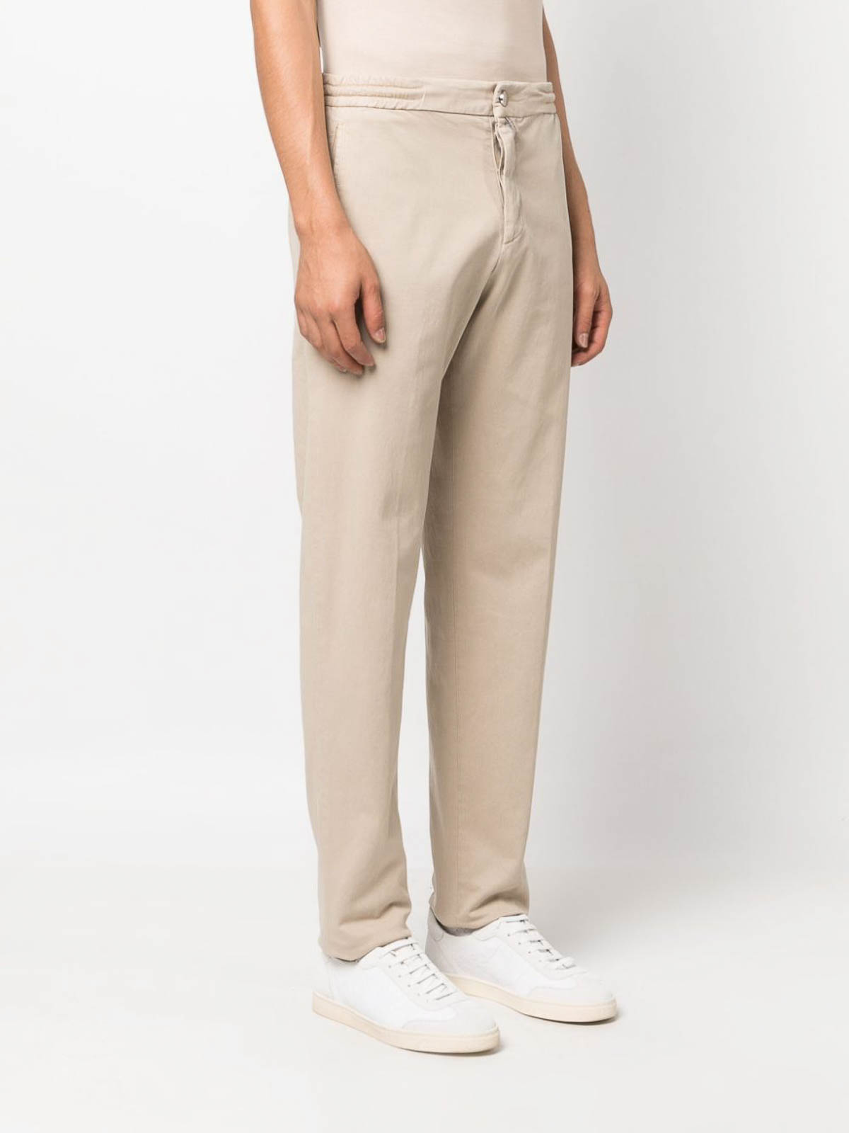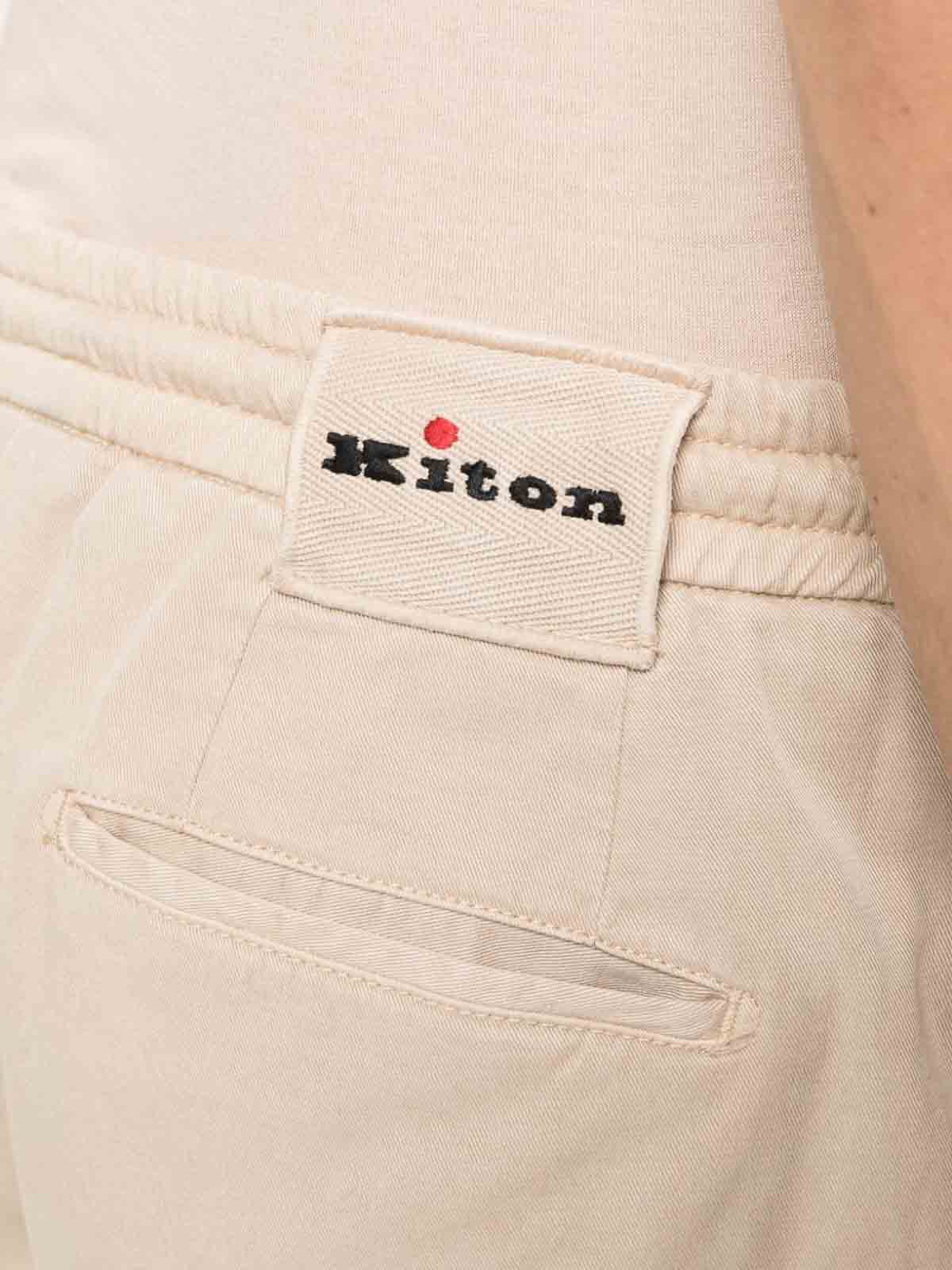 Chinohose mit Logo-Patch von Kiton mit hellbeigem Baumwoll-Lyocell-Mischgewebe, Logo-Patch auf der Rückseite, farblich abgestimmte Nähte, elastischer Bund, Knopfleiste, gerades Bein, zwei seitliche Einschubtaschen und zwei Leistentaschen auf der Rückseite. Dieser Artikel enthält mindestens diejenigen, die zertifiziert oder allgemein anerkannt sind, weil sie durch Produktions- und/oder Herstellungsprozesse, die den Wasserverbrauch und den Einsatz schädlicher Chemikalien reduzieren oder Nebenprodukte des Produktionsprozesses wiederverwenden, weniger Umweltbelastung haben Erfahre mehr darüber, was ein Produkt in unserem Bewusstsein bewusst macht Seite mit den Kriterien