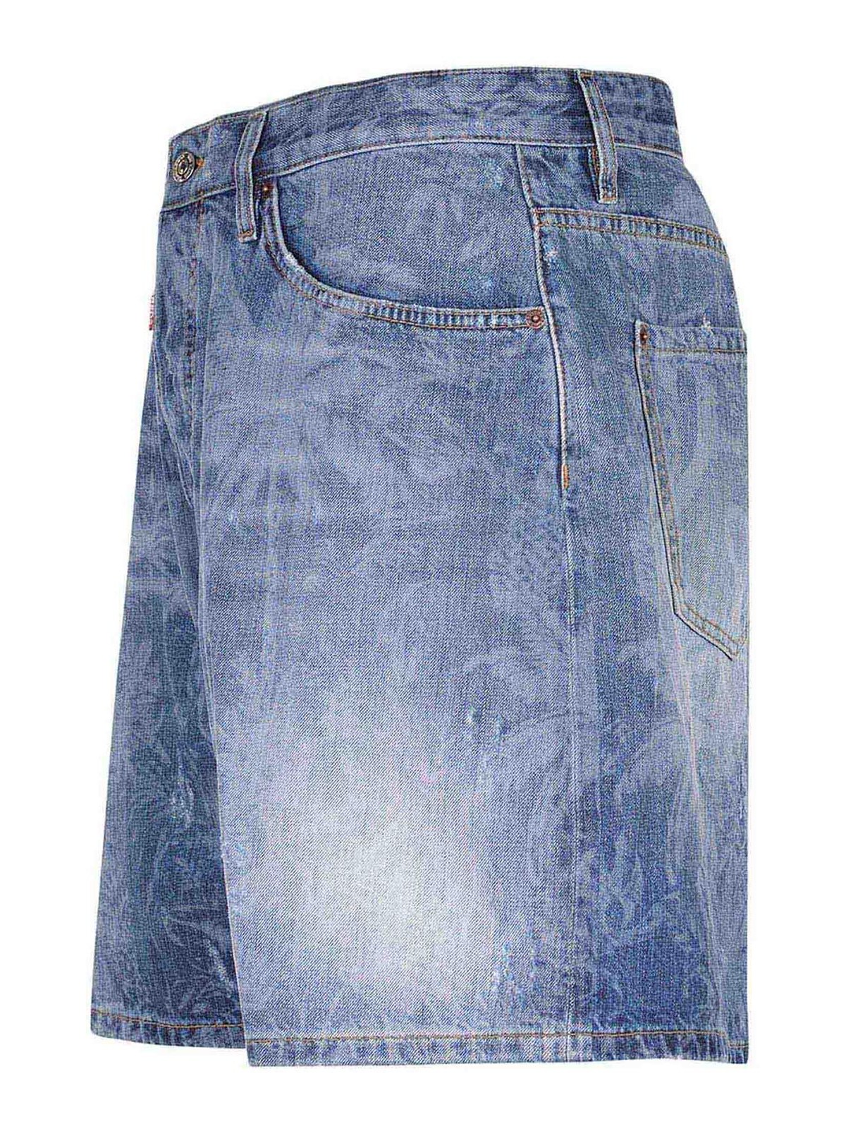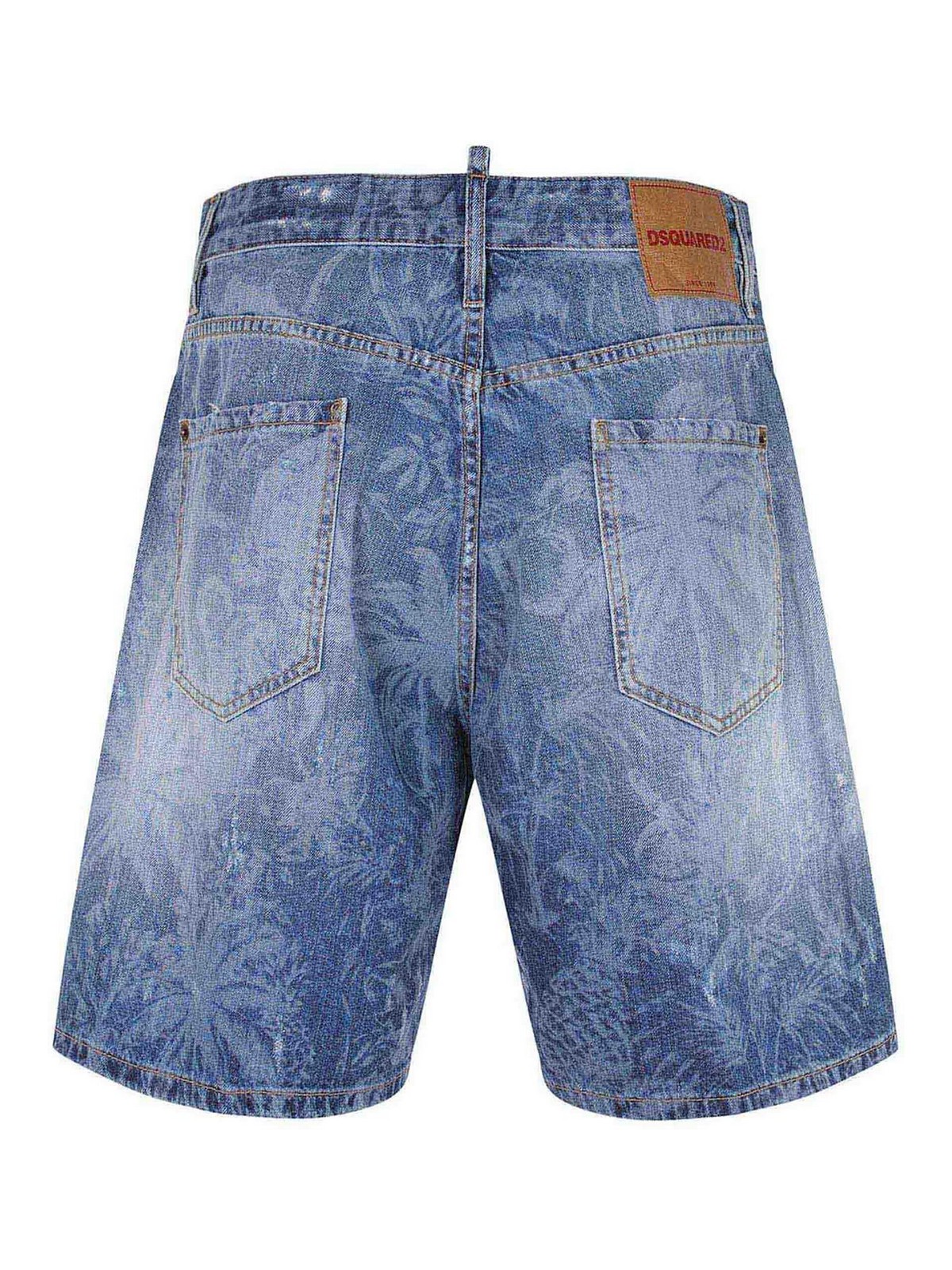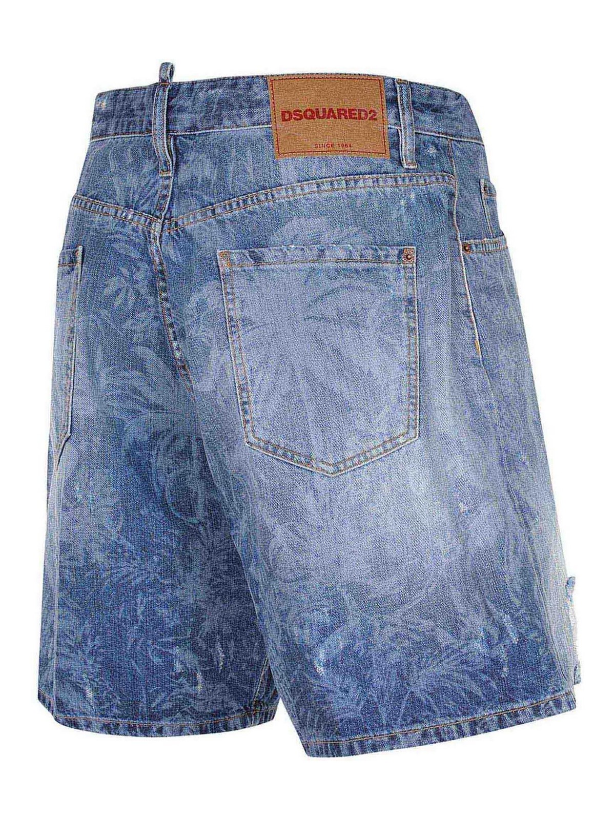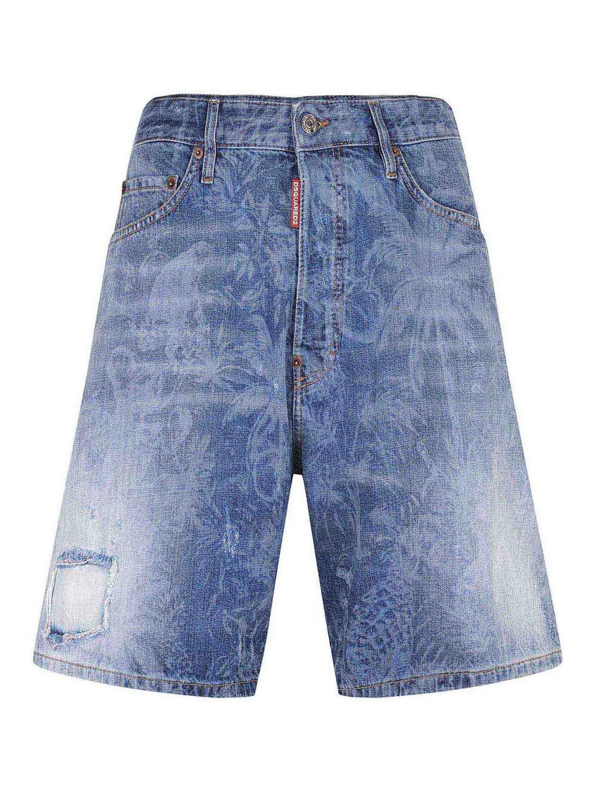 Dsquared2 Bermudashorts aus mittelblauem Denim, Knopfverschluss, Gürtelschlaufen an der Taille, fünf Taschen, Allover-Print, Rippen, ikonisches Kontrastetikett auf der Vorderseite, lederfarbenes Logo-Etikett auf der Rückseite, 100% Baumwolle