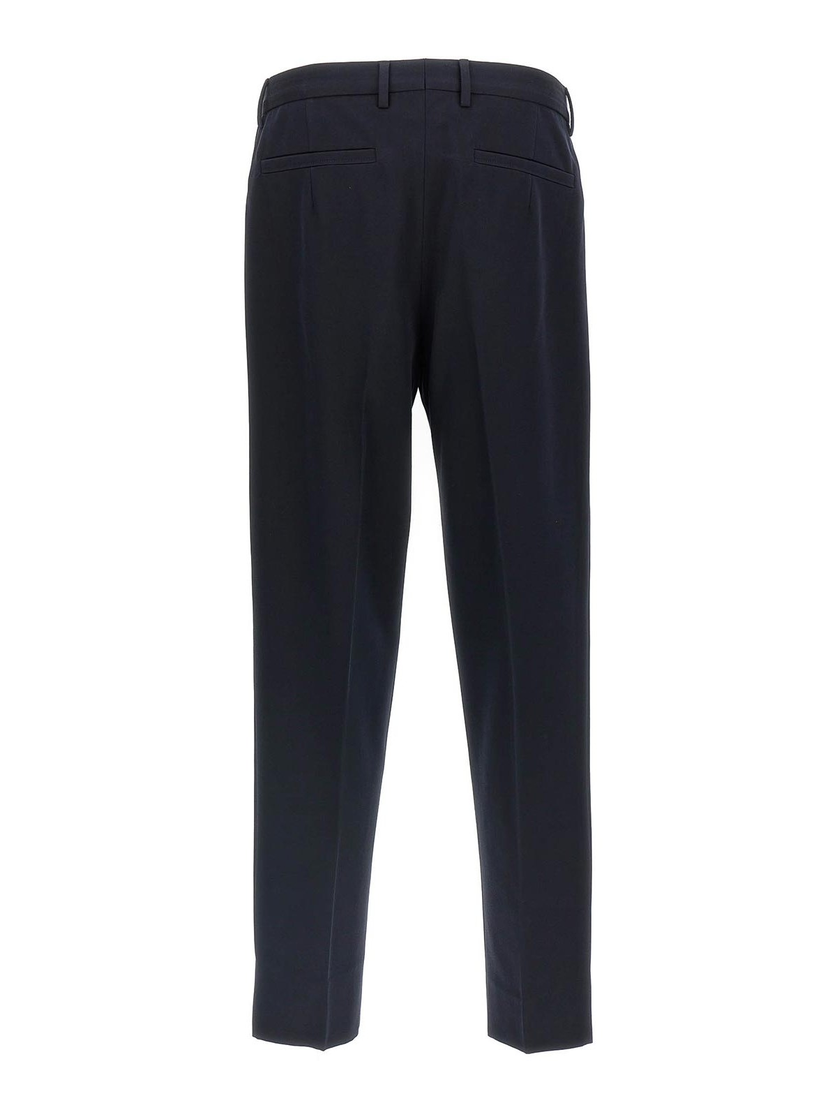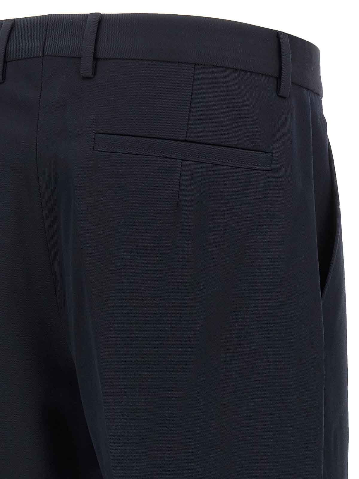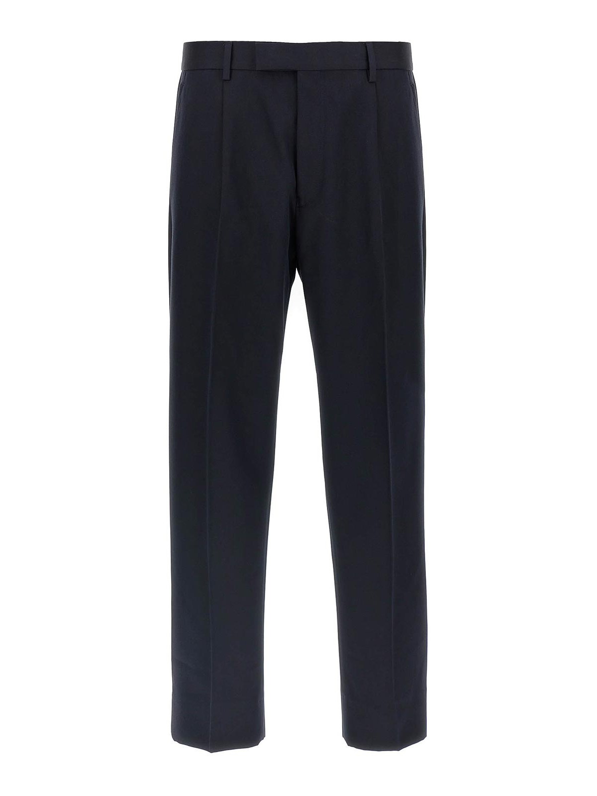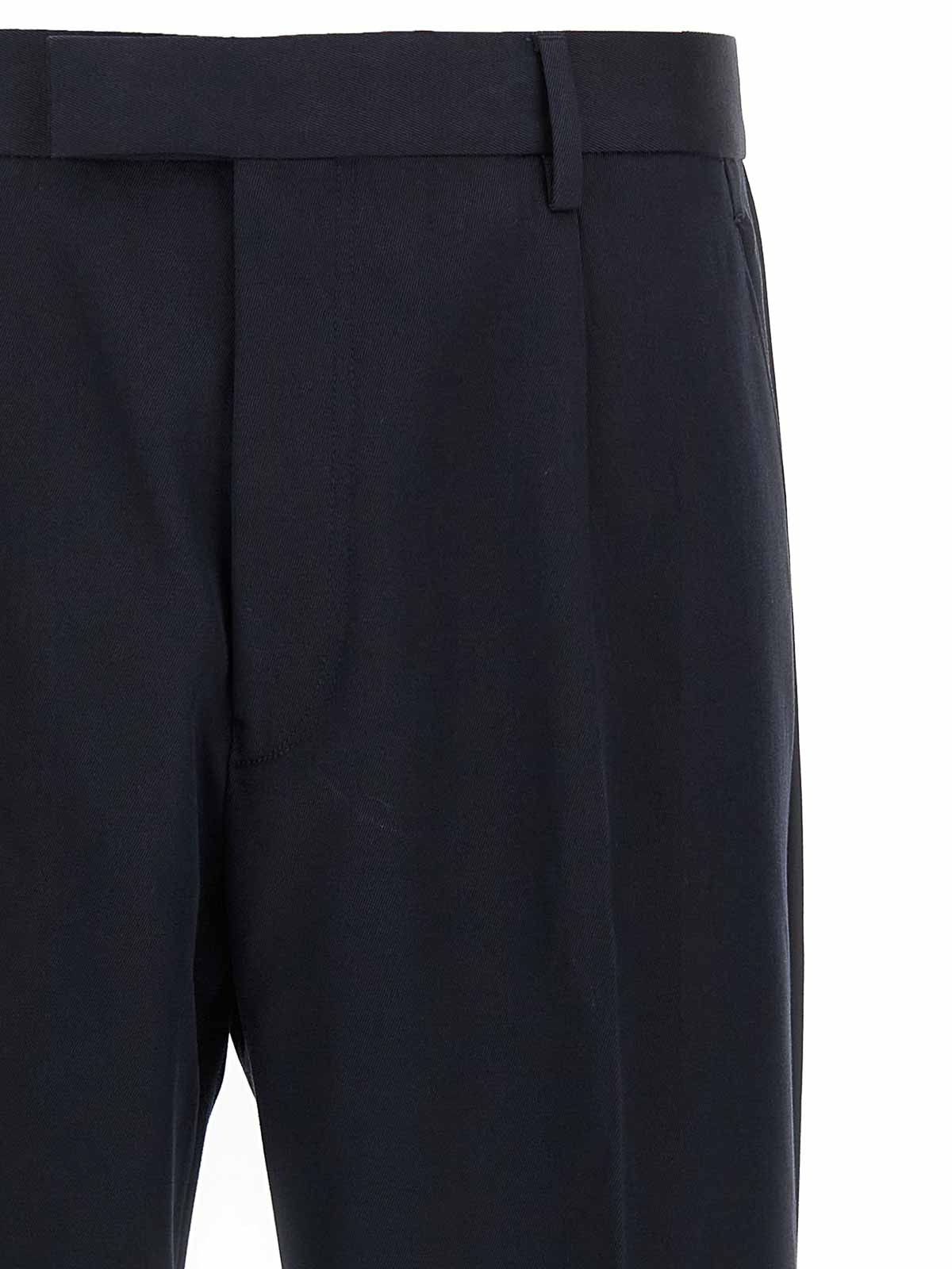 Hose aus Baumwoll- und Wollmischung, gerades Bein, gebügelte Falte und Bügelfalte, Reißverschluss mit Haken und Knopf, amerikanische Vordertasche, Leistentasche hinten.