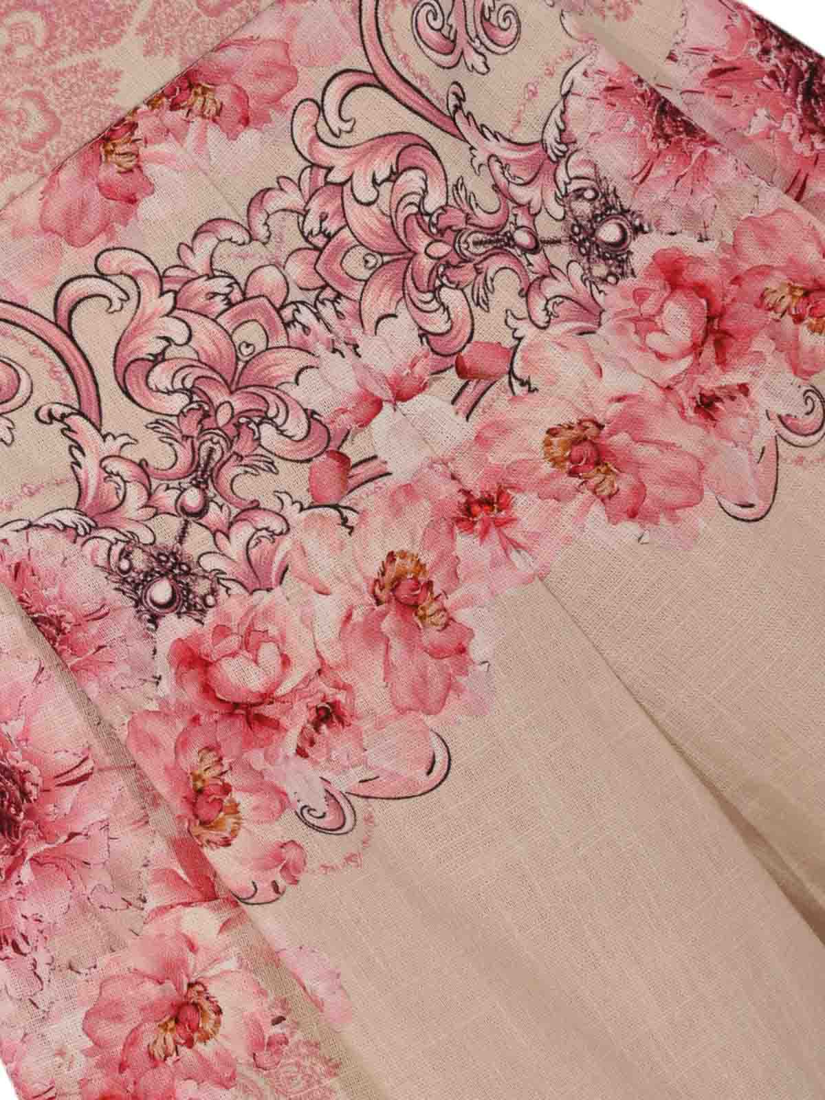 Damenshorts aus Leinen- und Baumwollmischung, Amosa, Modell mit Blumendruck, Stoff: Leinen- und Baumwollmischung, Muster: Blumendruck mit Ornamentmotiven, Taille: hoch mit glattem Band, Verschluss: Reißverschluss mit Haken, Taschen: nicht sichtbar, Länge: kurz, Details: Abnäher vorne, Unterkante mit perforiertem Einsatz, platzierter Druck, gefüttert: nein, Passform: normal