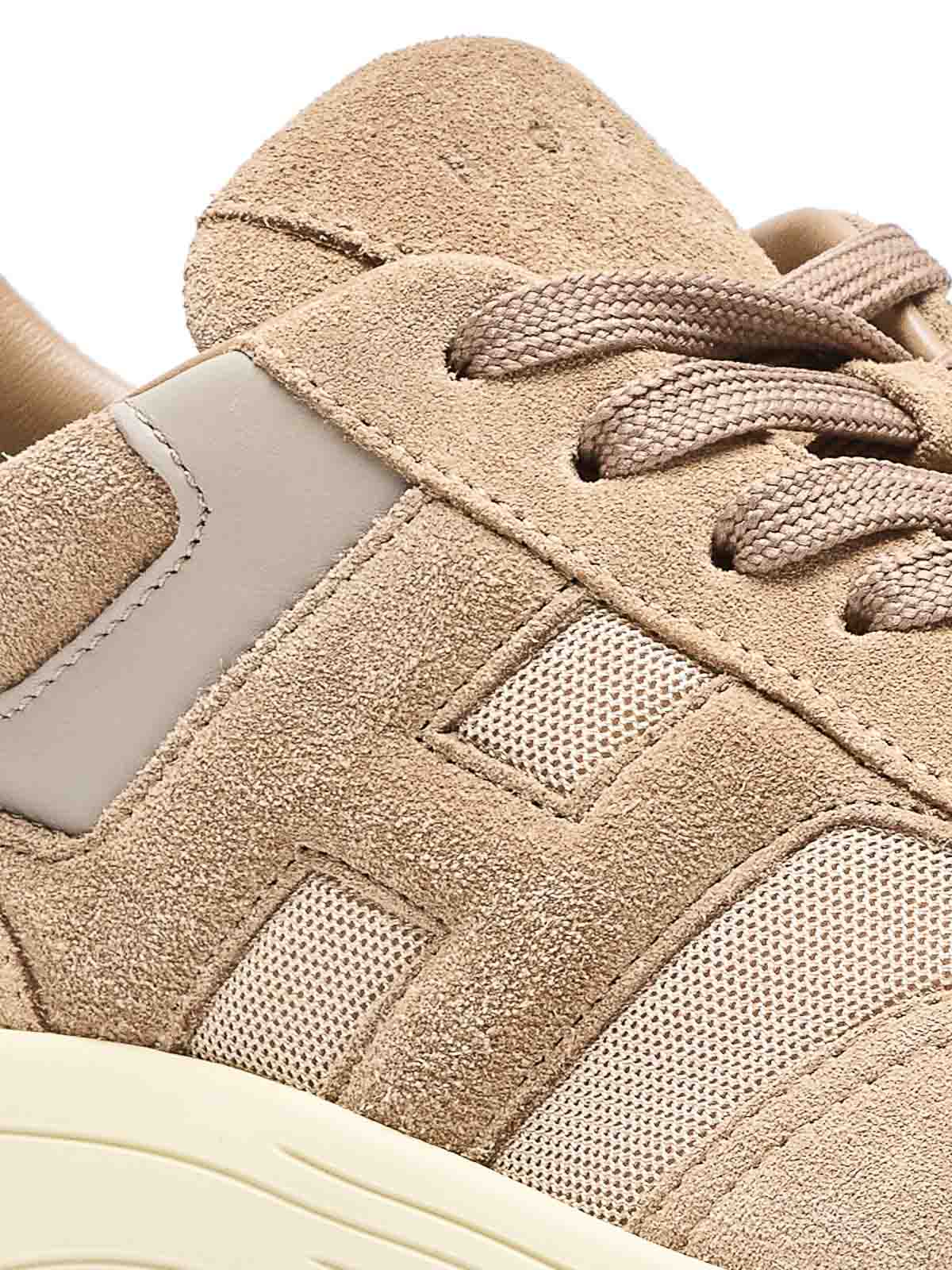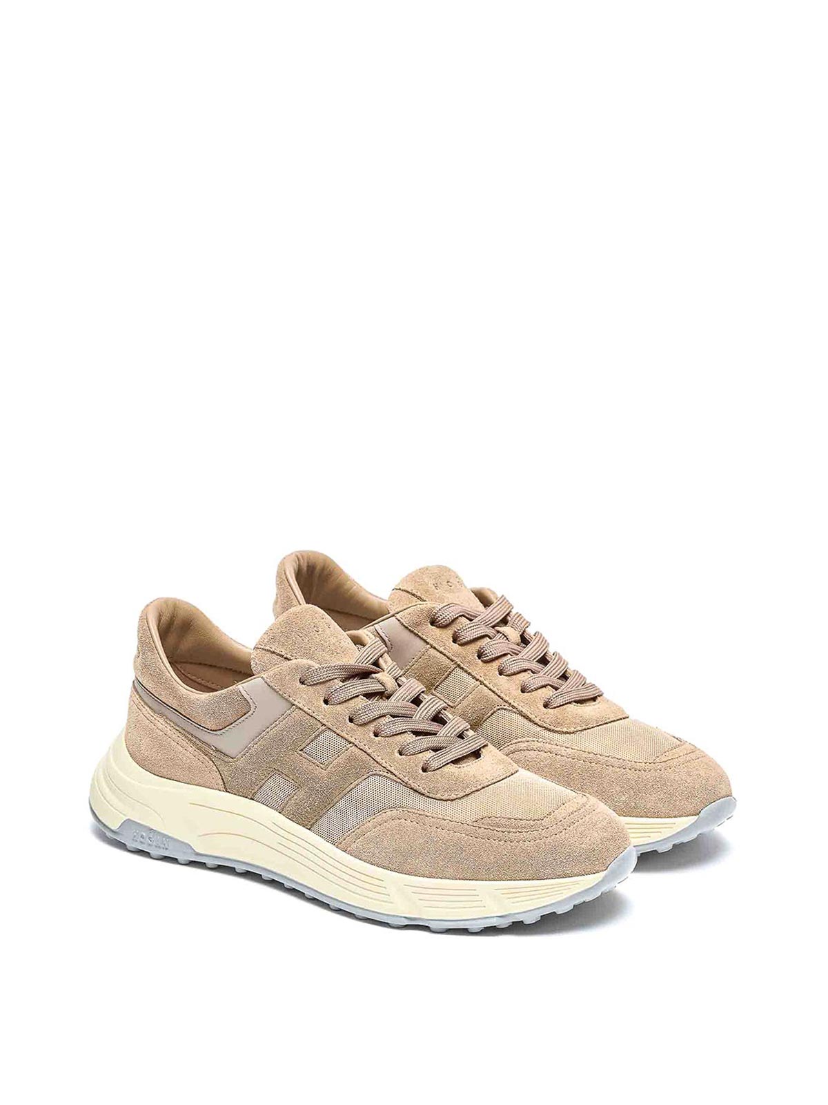 Hyperlight-Sneakers von Hogan in Beige, Obermaterial aus Veloursleder und Leder, Schnürverschluss, runde Spitze, seitliches Logo