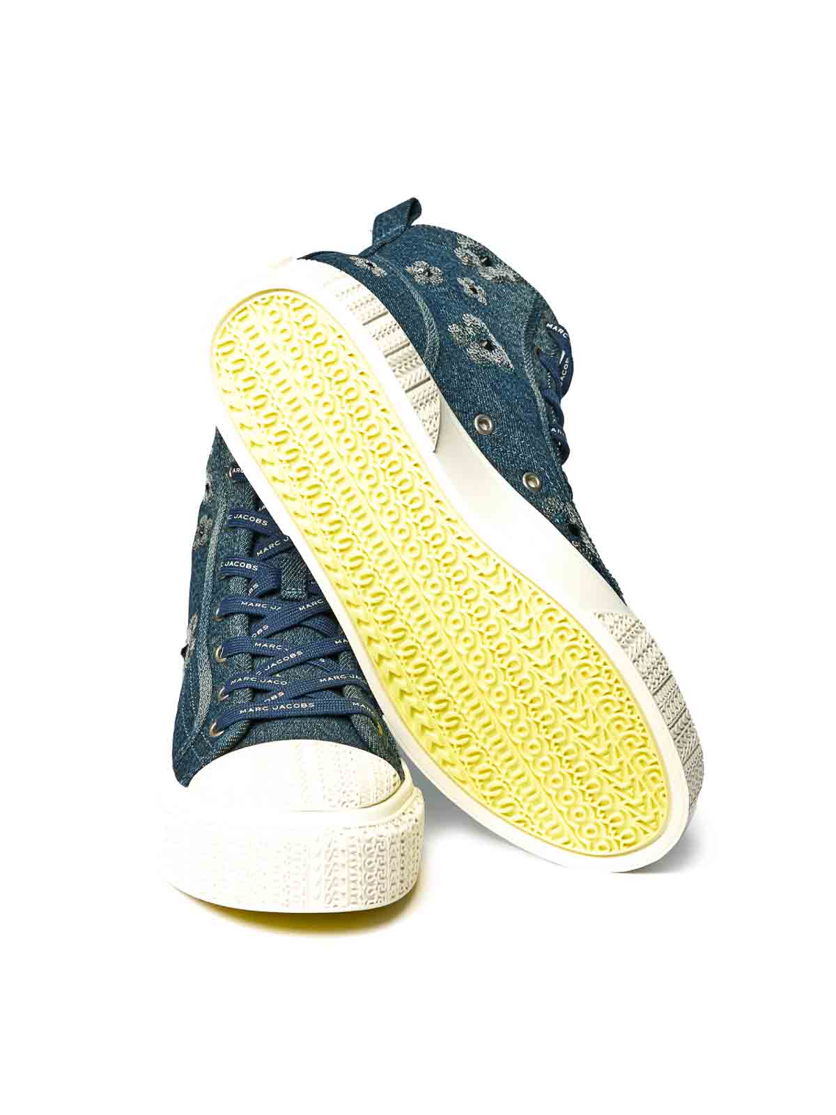 Der High-Top-Sneaker aus Denim. High-Top-Sneaker von Marc Jacobs mit einer Außenseite aus Denim, verziert mit gänseblümchenförmigen Pailletten, die an das saisonale Motiv erinnern. Er ist mit einem Schnürverschluss mit Logo-Schnürsenkeln, einer strukturierten Gummisohle mit Monogramm und der ikonischen kontrastierenden Außensohle ausgestattet.