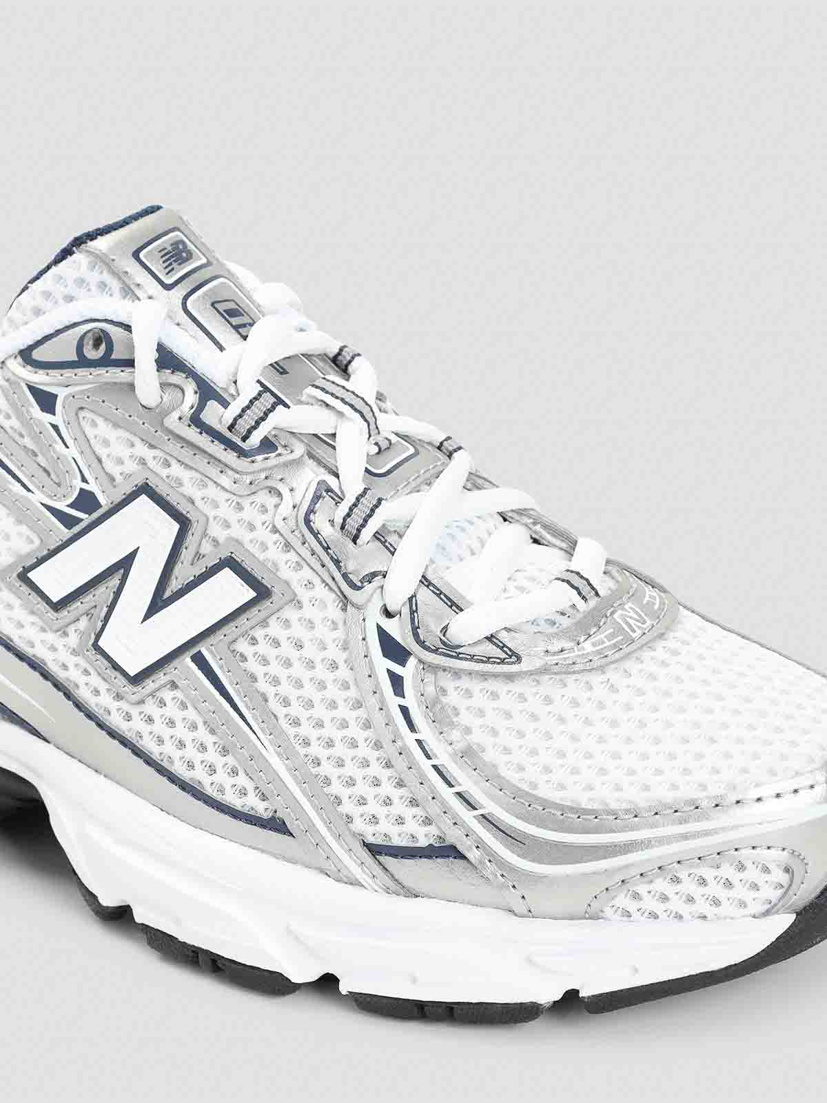 New Balance 740 Sneakers aus weißem und blauem Leder. Hergestellt aus silberfarbenem Leder, weißem Mesh und blauen Details. Runde Zehenpartie, Schnürverschluss, Markenetikett an der Zunge. Signatur-N an der Seite. Innensohle aus Textil mit Markenlogo, weiße Gummiaußensohle.