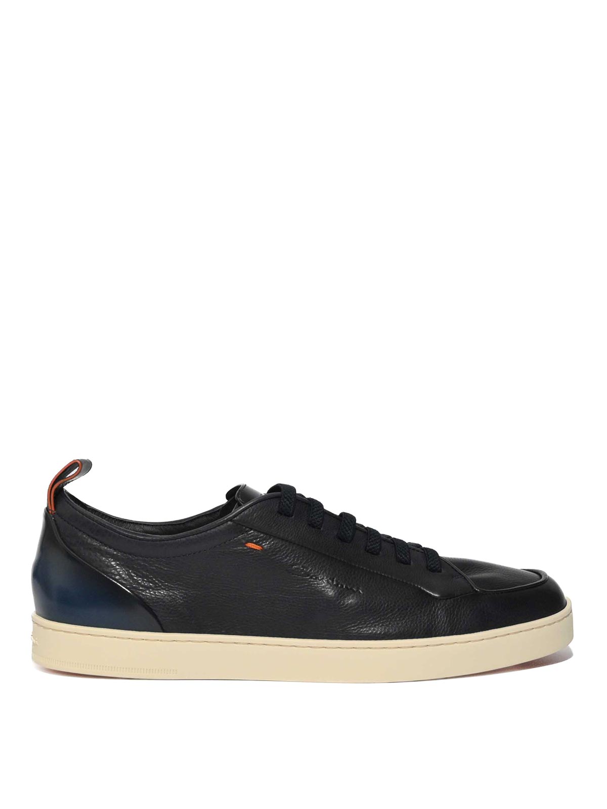 Herren-Sneaker aus strukturiertem Leder, Santoni, Low-Top-Modell, Obermaterial: strukturiertes Leder mit glatter Oberfläche und schattiertem Hintereinsatz, Verschluss: Schnürsenkel, Sohle: Gummi, Details: minimalistisches Design, hintere Zunge mit kontrastierenden Details, dezentes Seitenlogo, Futter: Leder, Absatz: niedrig