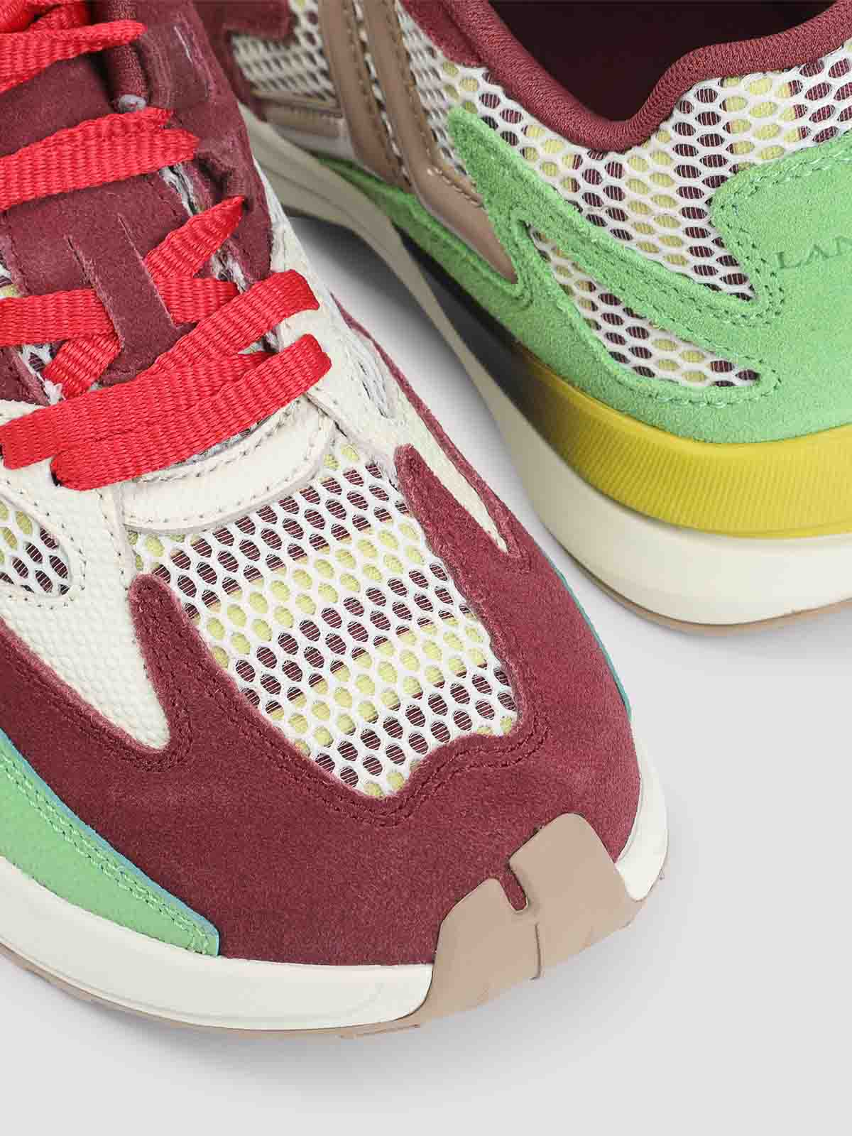 Lanvin Jla Sneakers aus burgunderfarbenem und grünem Kalbsleder. Hergestellt aus weißem Mesh mit Details aus burgunderfarbenem und grünem Veloursleder. Sie verfügen über eine mandelfarbene Zehenpartie, einen Schnürverschluss, ein Markenlabel auf der Zunge, ein gepolstertes Futter, eine Innensohle aus Leder und eine Laufsohle aus Gummi.
