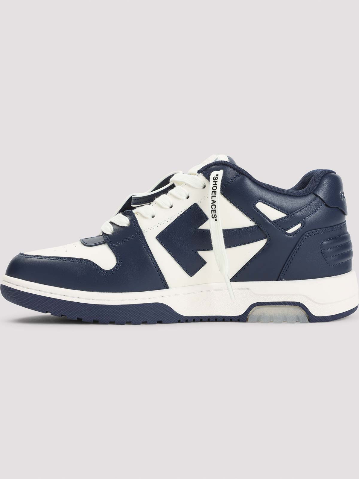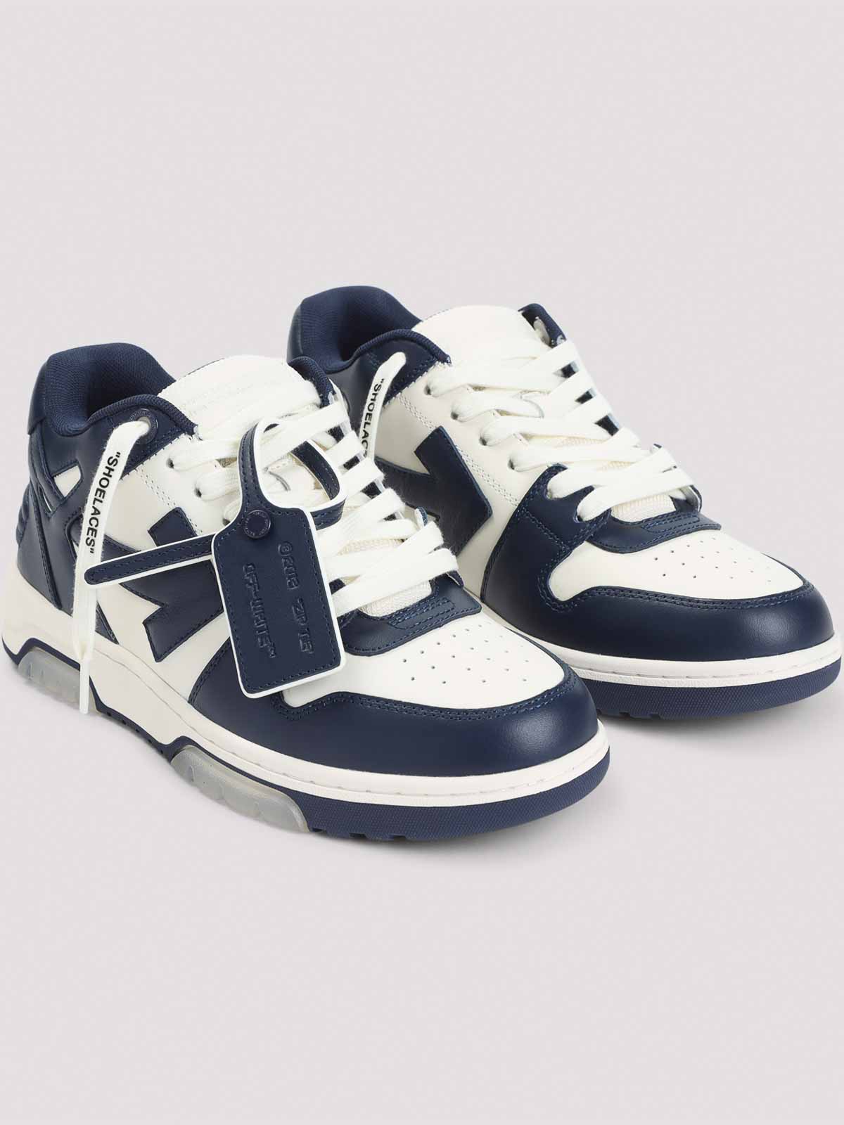 Cremefarbenes Cremefarbenes heraus, aus, Office Sneakers gefertigt und rundes Zehenoberteil perforiert Top aus, weiße Spitze, Oberseite blaues Logo-Tag blau an der Seite blauer Pfeil Rückseite kontrastierendes weißes Logo blau und weiß mit transparentem