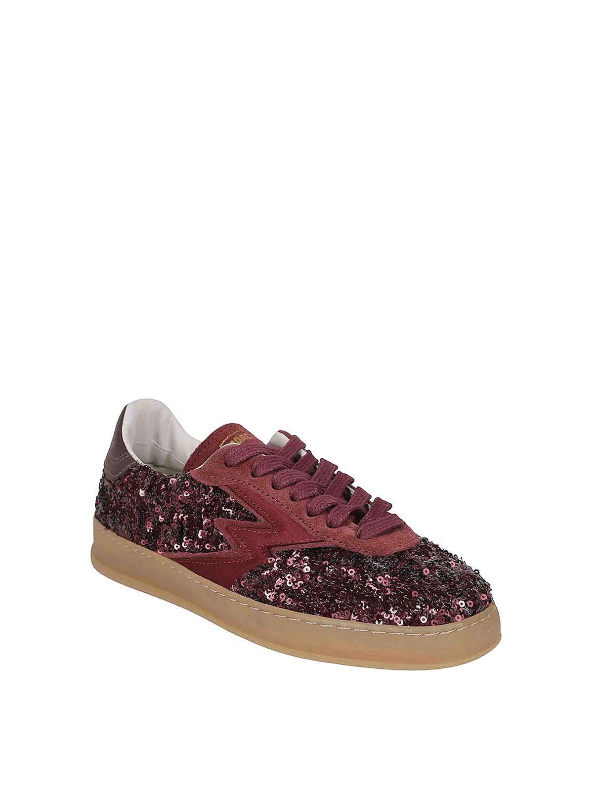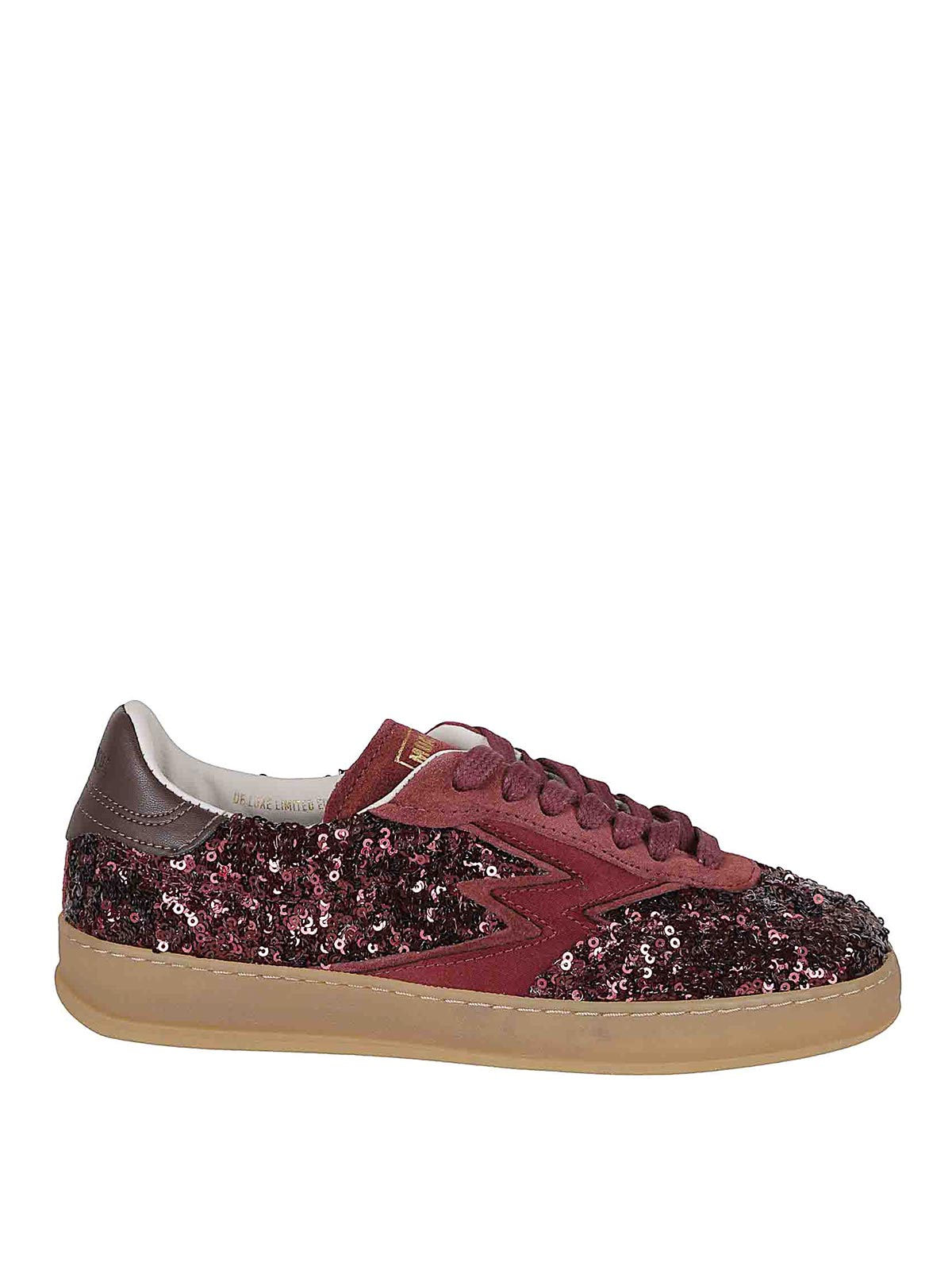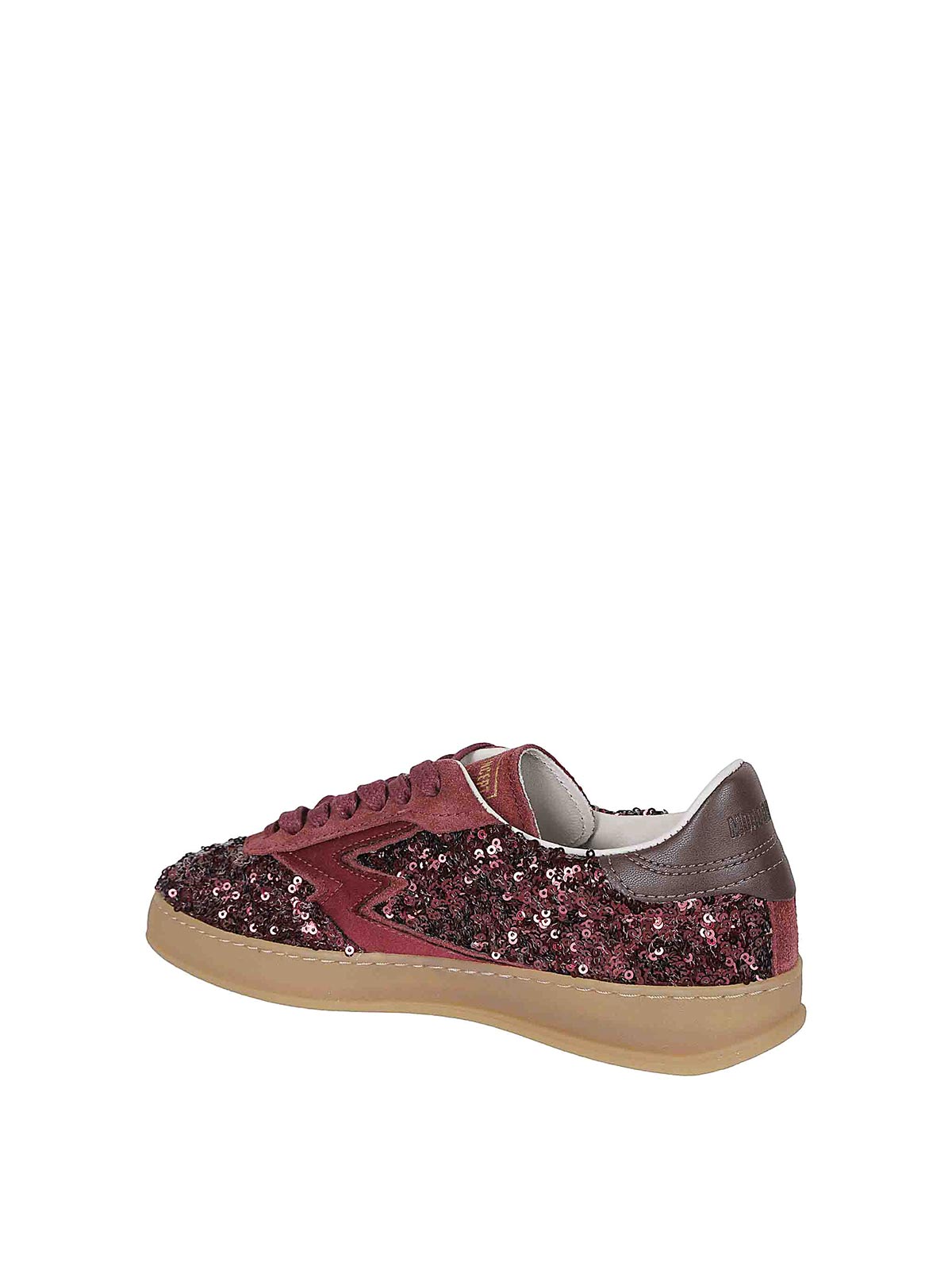 Obermaterial aus burgunderroten Pailletten, rückseitiges Detail aus braunem Leder, ikonisches Logo aus Satin und Veloursleder, Gummisohle.