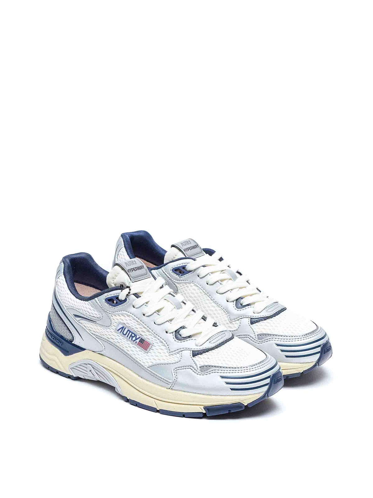 Autry Hyperway-Sneakers in Weiß und Blau, Schnürverschluss, runde Spitze, seitliches Logo, Obermaterial aus Stoff und Leder