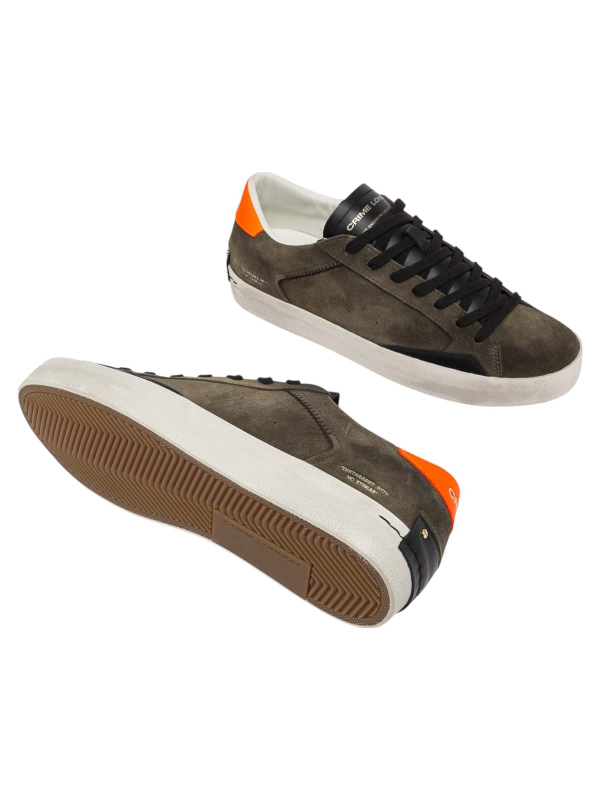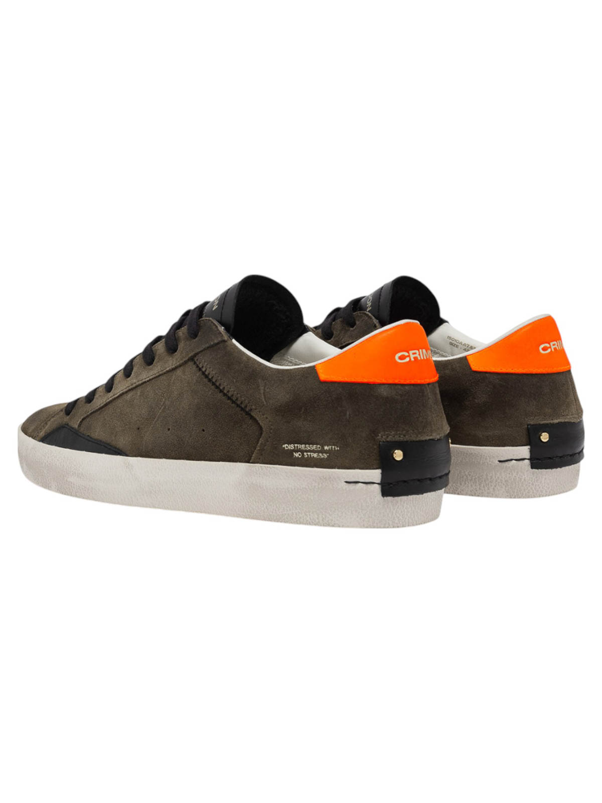 Crime London DISTASED AA Militärgrüner Sneaker Der Sneaker Crime London Distresses AA steht für einen Lincontro zwischen Artisanalit Italia Na und Contemporary Urban Style. Militärgrün mit Schwarz hat eine lebendige Oberfläche, die ihm einen authentischen Vintage-Look verleiht. Der fluoreszierende orangefarbene Absatz verleiht ihm einen Hauch von Charakter und Lebendigkeit mit raffinierter Verarbeitung. Hoher Komfort und Widerstandsfähigkeit, während er die tägliche Atmungsaktivität garantiert. Die schwarzen Schnürsenkel runden ein modernes und vielseitiges Design ab, ideal für lässige urbane Outfits. Hauptmerkmale Militär grünes Obermaterial mit schwarzem fluoreszierend orangefarbener Absatz mit innenliegenden und atmungsaktiven schwarzen Schnürsenkeln.