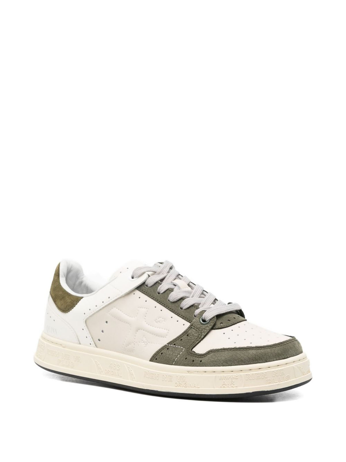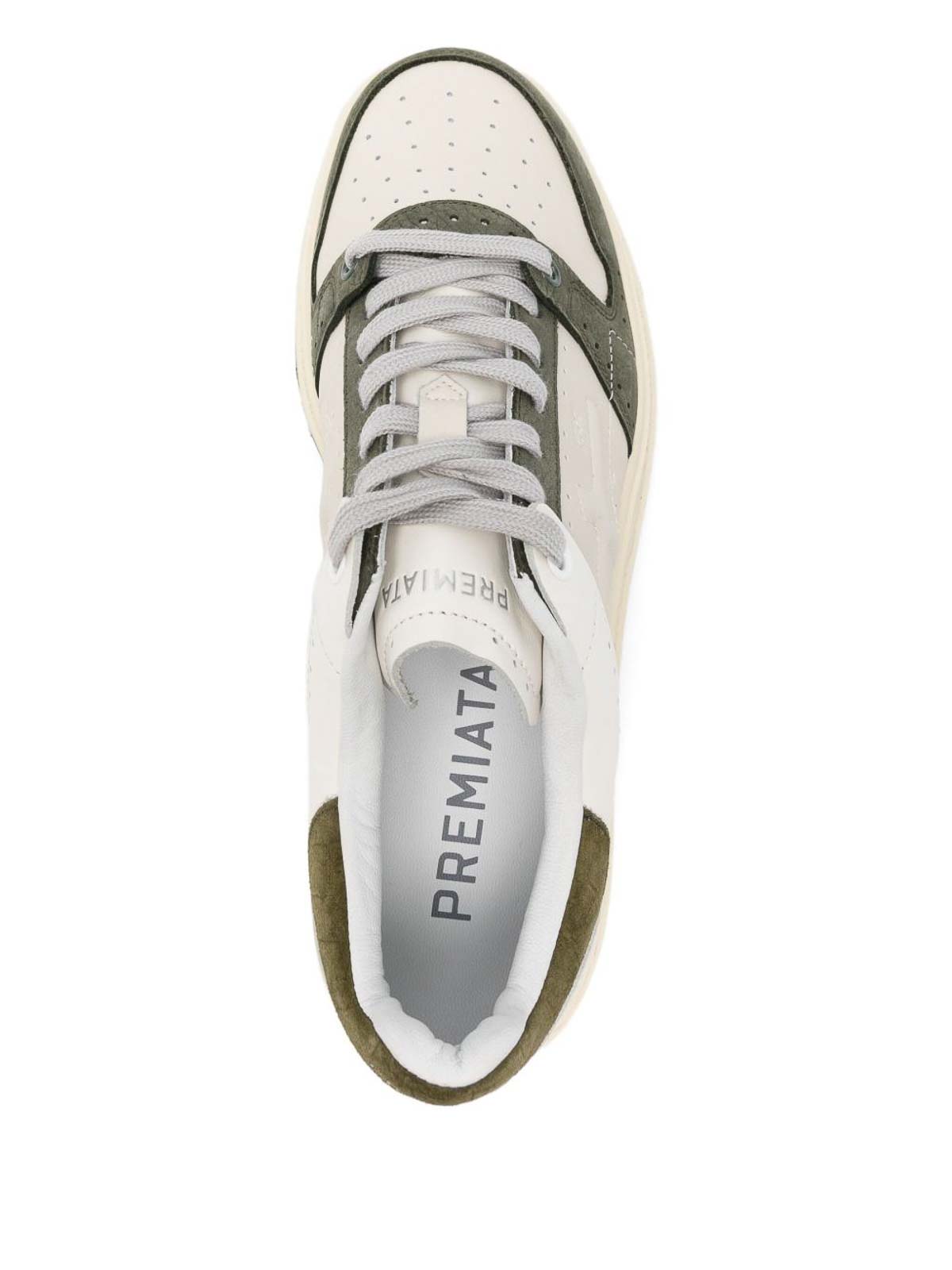 Ikonischer weiß/grüner Sneaker. Detail: ikonische Perforationen Diese Perforationen sind von den Brogues der klassischen Welt inspiriert, in der Premiata seine Wurzeln hat.