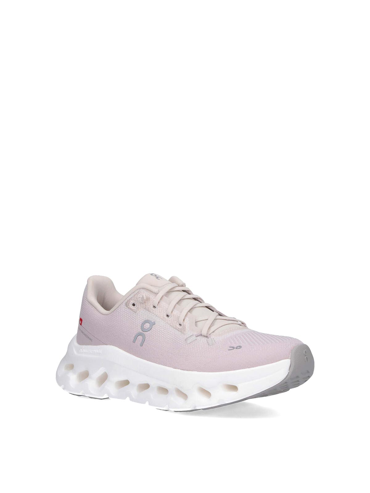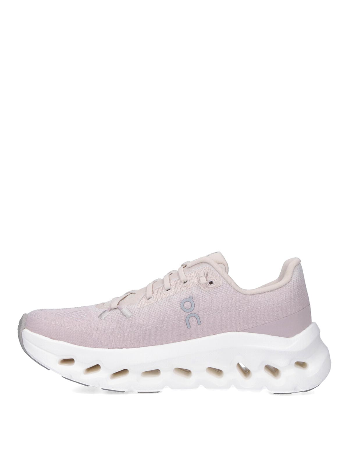 Sneakers mit Wolkenneigung, aus rosafarbenem Stoff, runde Spitze, kontrastierendes Logostickerei, Schnürverschluss, Logostickerei auf der Zunge, Logostickerei an der Seite und am Rücken, Mini-Label aus Schweizer Technik auf der Rückseite, strukturierte Gummisohle, geprägtes Logodetail an der Seite.