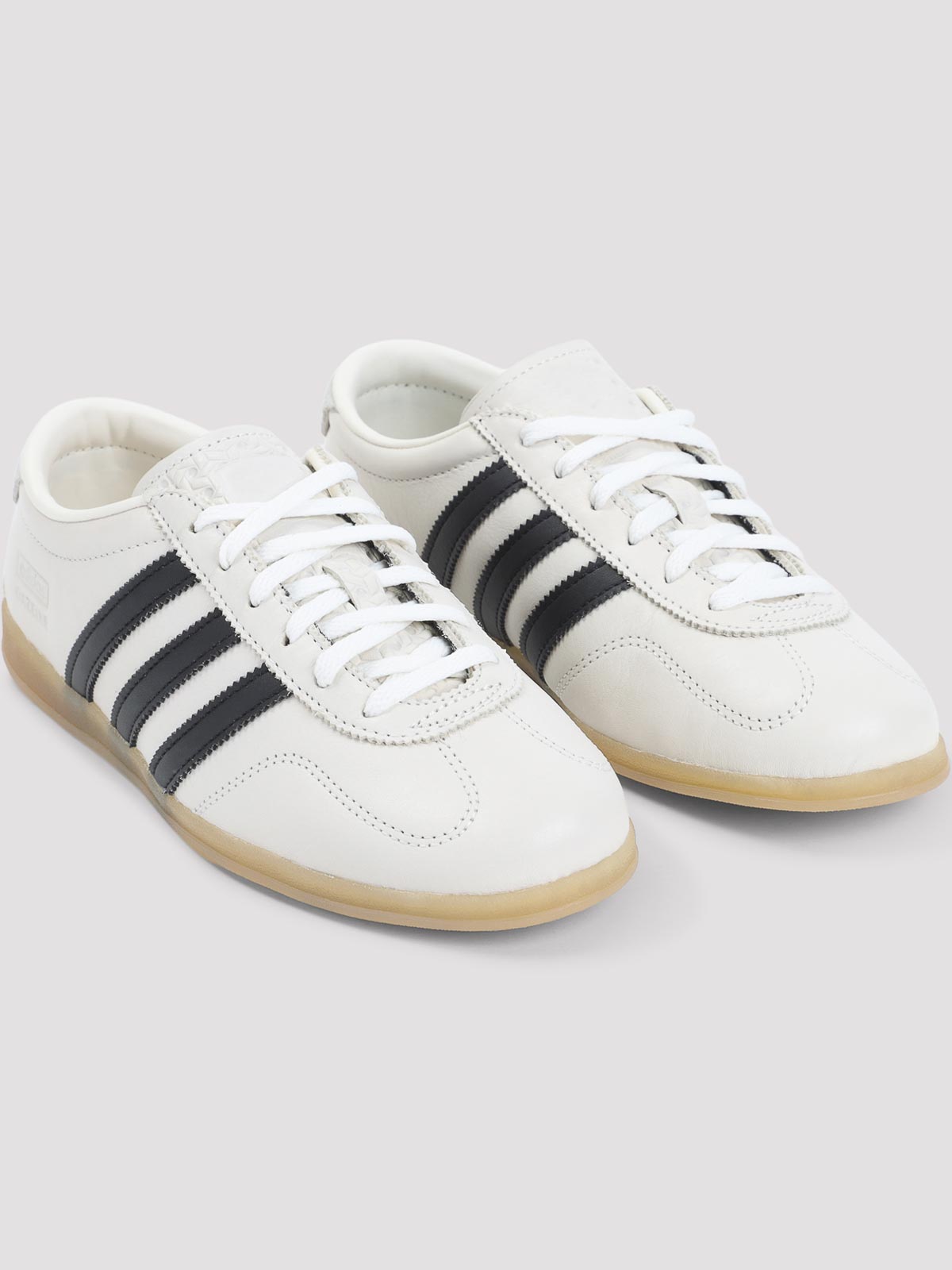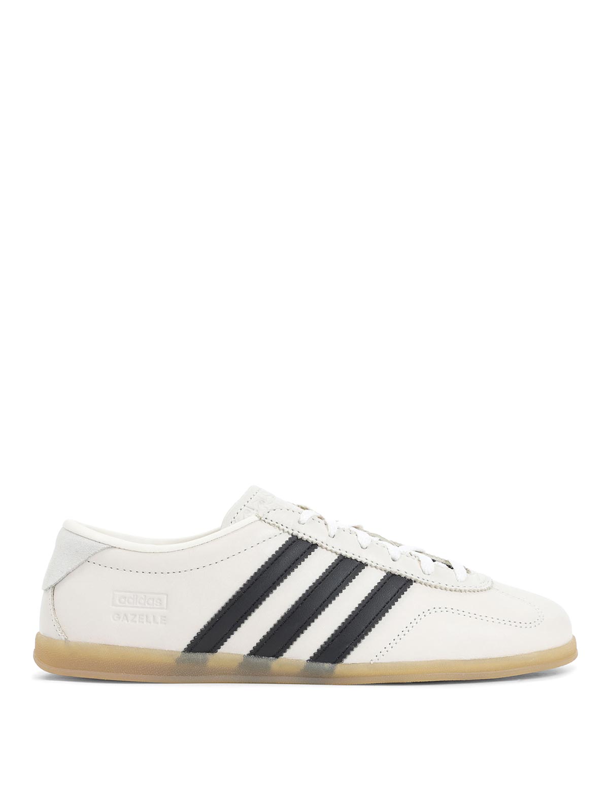 Adidas Gazelle Lo Pro weiße Lederturnschuhe. vamp aus weißem Leder gefertigt, mit runder Zehenpartie, Schnürverschluss, geprägtem Logo auf der Zunge und an der Seite, kontrastierende schwarze Signaturstreifen an den Seiten, geprägtes Logo auf der Rückseite, Textilfutter und Innensohle, flache durchsichtige Gummiaußensohle.