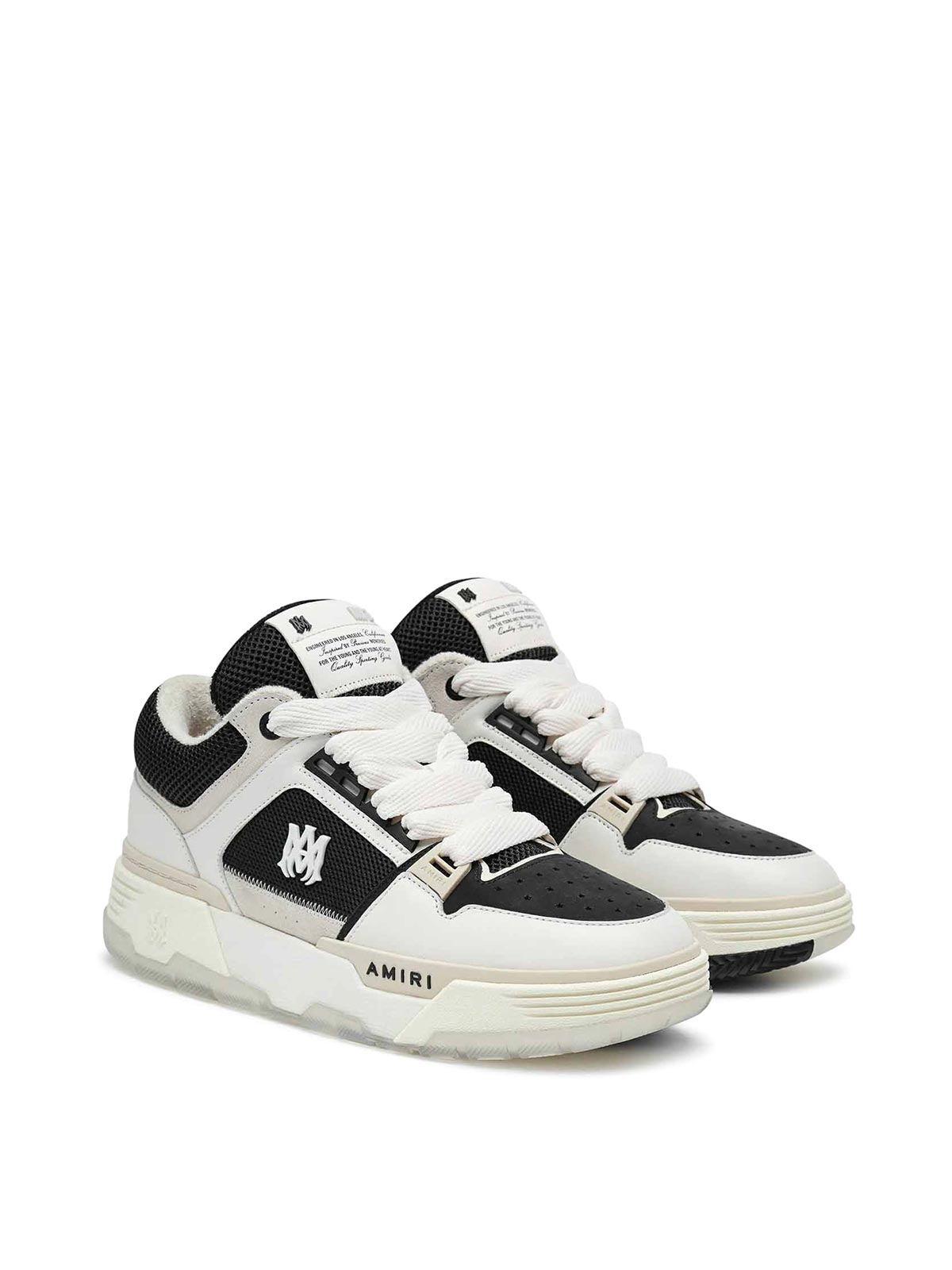 Sneakers Amiri Ma1 aus Leder und Stoff, übergroße Gummisohle, aus weichem Leder, Schwamm und perforierten Einsätzen, doppelter Schnürverschluss mit Logo-Ösen, seitliches Logo, gesteppte Nubuk-Zunge, signiert mit Mike Amiris Worten, Farbe: schwarz/alabaster