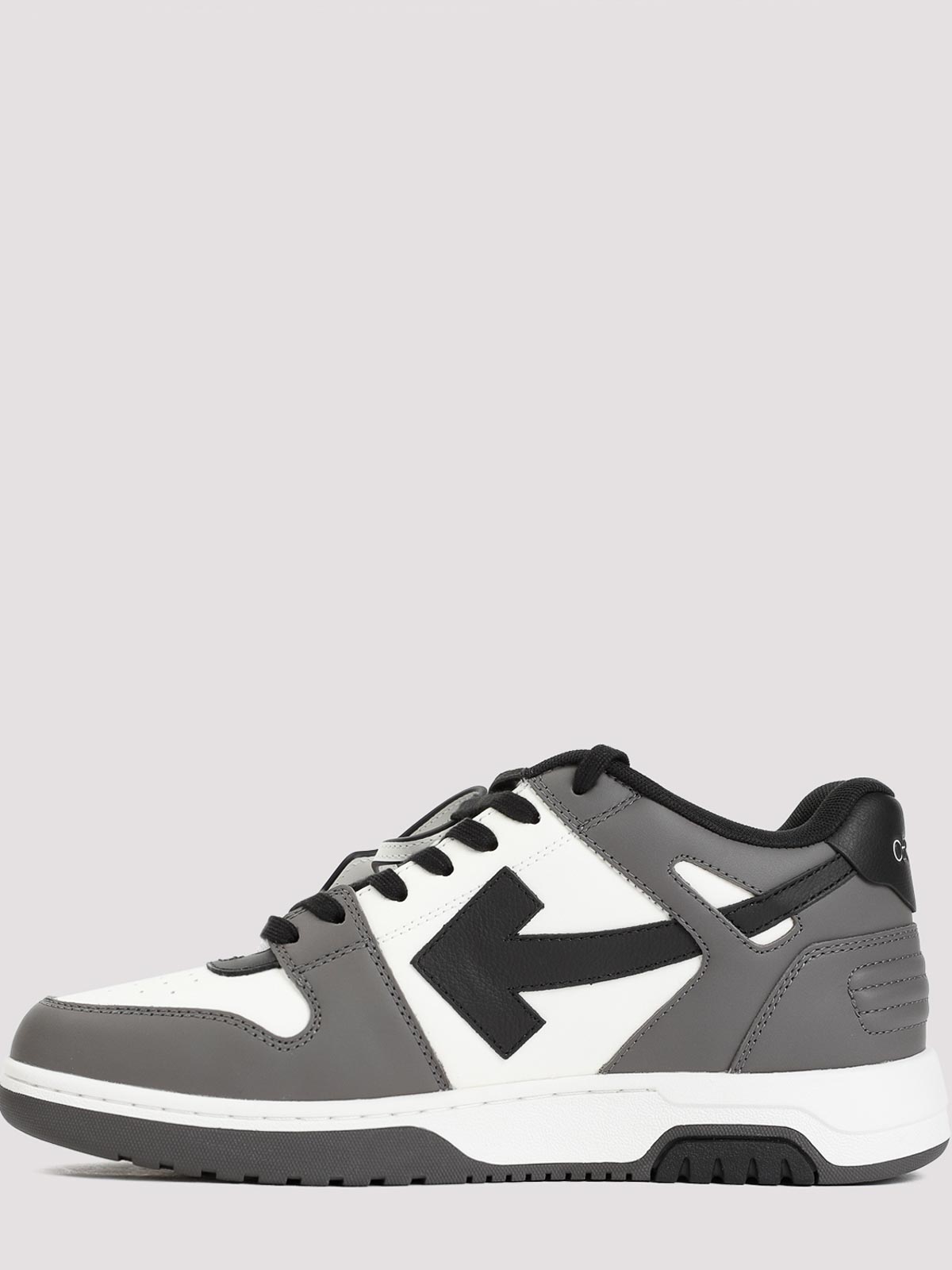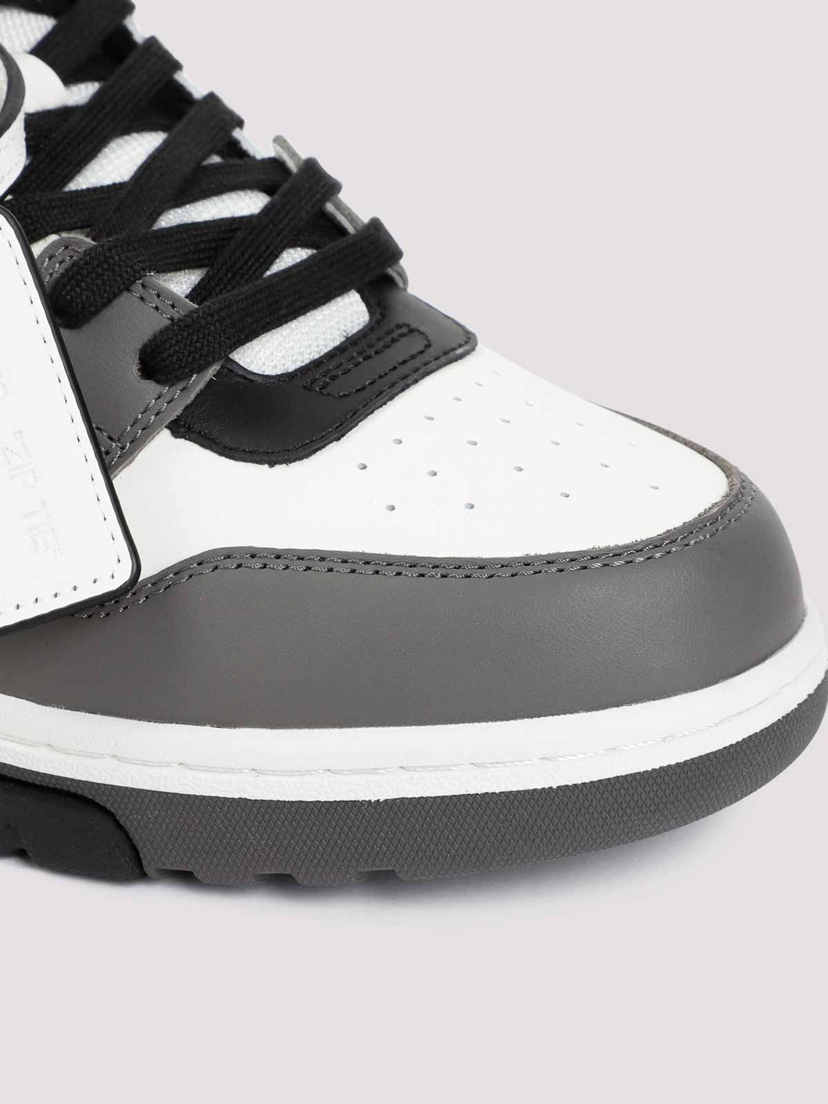 Cremefarbene Out-of-Büro-Sneaker aus dunkelgrauem Leder. Dunkelgraues, weißes und schwarzes Leder, Einsätze, ikonischer Pfeil an den Seiten, runde Zehenpartie mit perforierten Details auf der Oberseite, Schnürverschluss mit Markenlogo, charakteristischer Schlüsselbund, weiße Logoprägung an der Ferse, Markeninnensohle und Gummiaußensohle.
