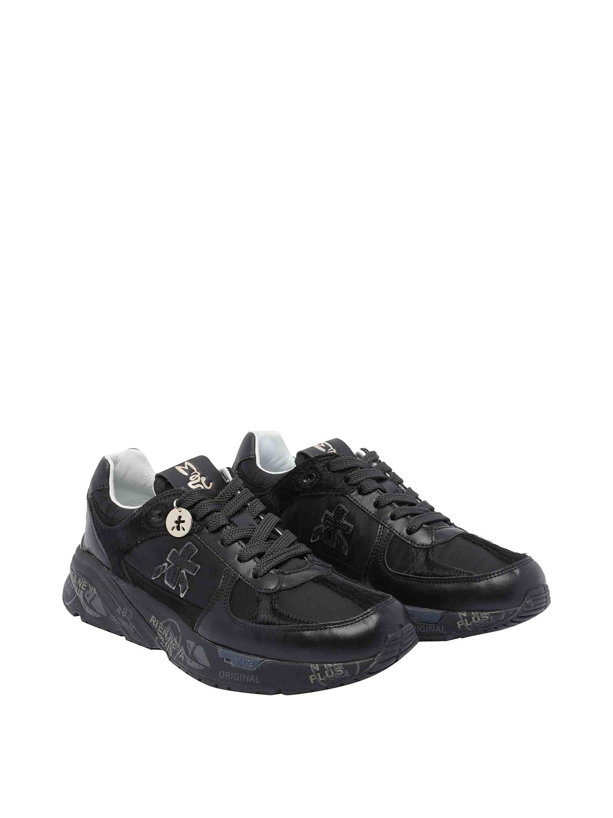 Premiata Sneakers aus schwarzem Masse-Material, Obermaterial aus Stoff, runde Spitze, Logo