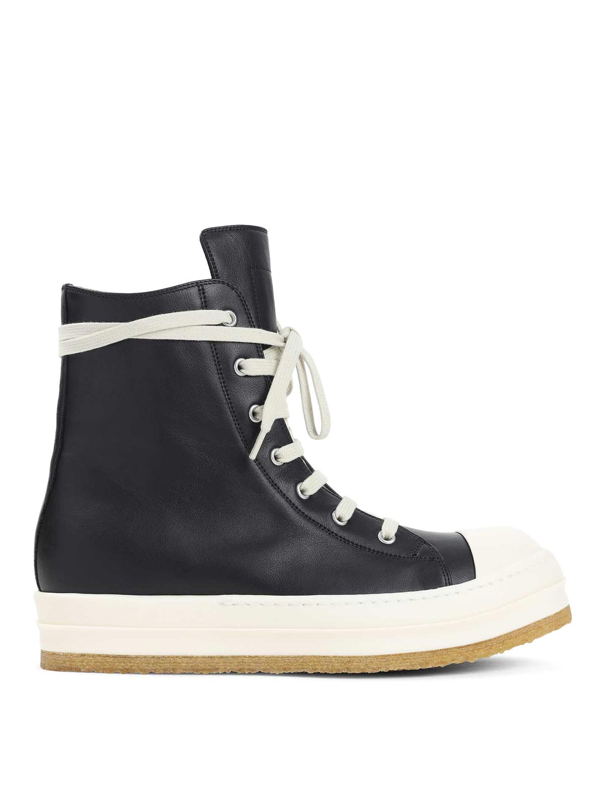 Schwarze Creep-Sneaker aus Leder von Rick Owens. Sneakers aus reinem schwarzem Leder, kontrastierende weiße runde Gummikappe, weißer Schnürverschluss oben, knöchelhohe, weiße Gummisohle.