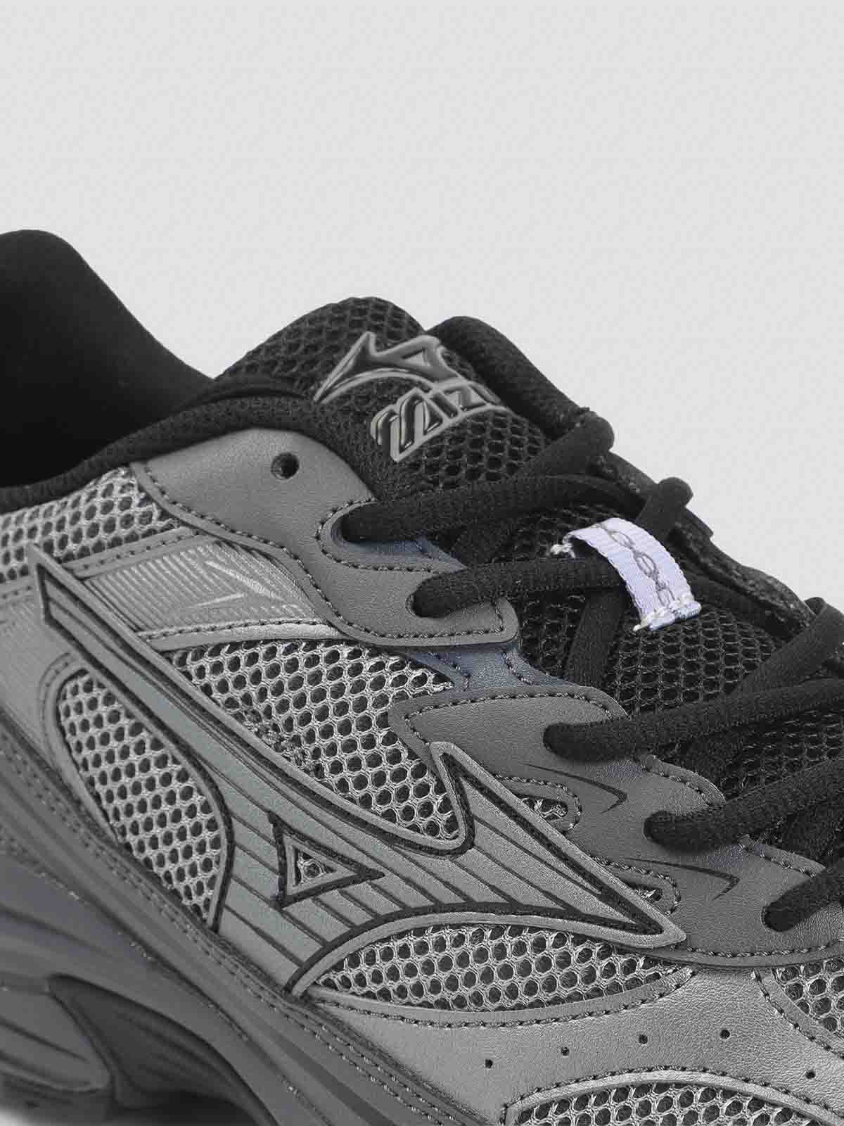 Mizuno MXR-Sportschuhe aus Leder in Quiet Shade Grey. Hergestellt aus Leder und Mesh. Runde Zehenpartie, Schnürverschluss in Eisentorgrau, Logopatch in Grau und Schwarz auf der Zunge, farblich abgestimmte Textildetails auf dem Obermaterial, seitliches graues Lederlogo, seitliche Details aus Leder in Silvangrün, tonaler Riemen hinten. Gummisohle in Quiet Shade Grau und Iron Gate Grey.