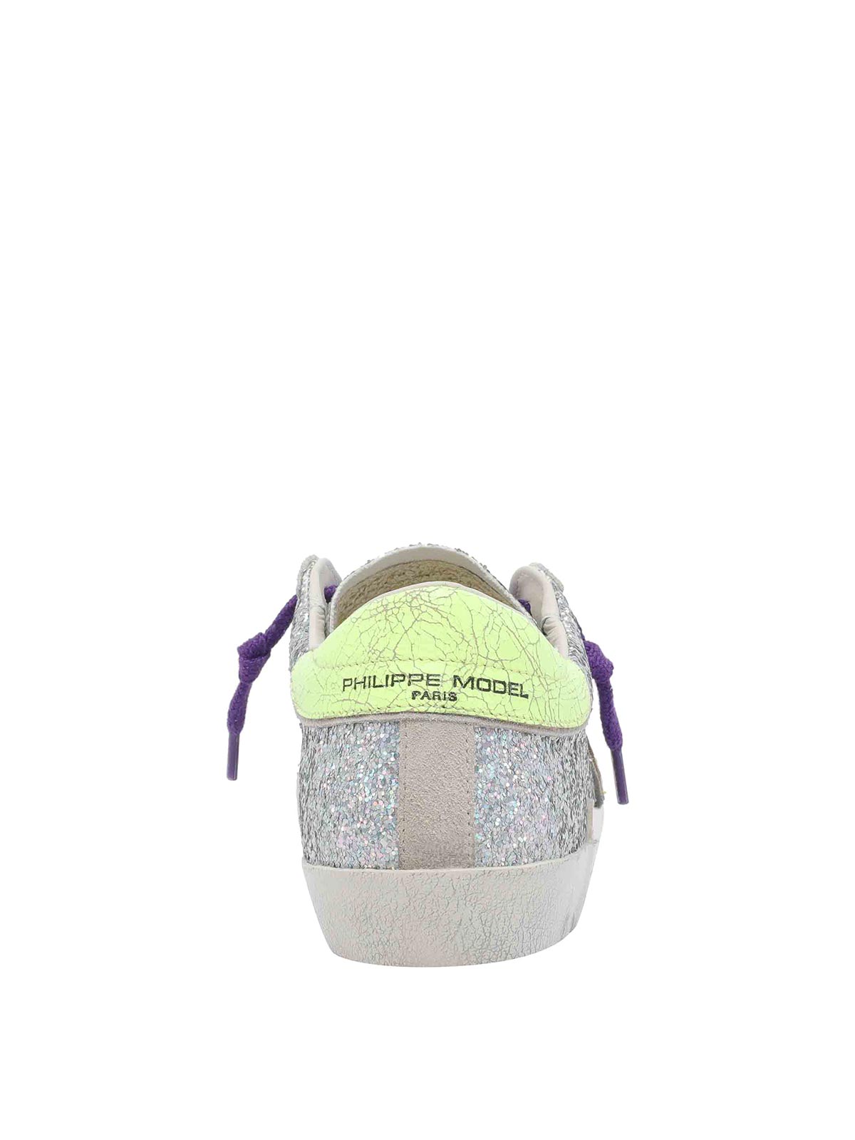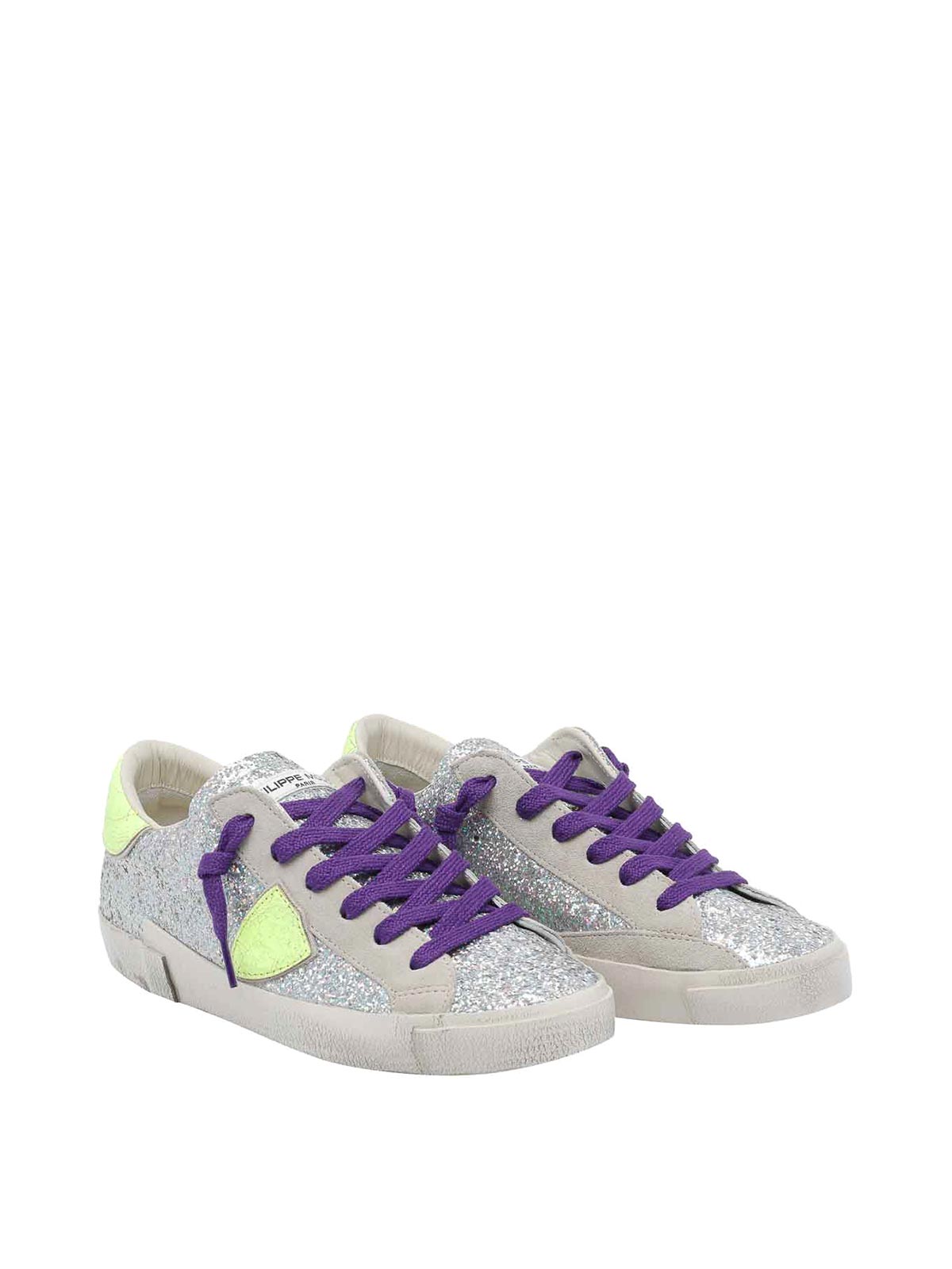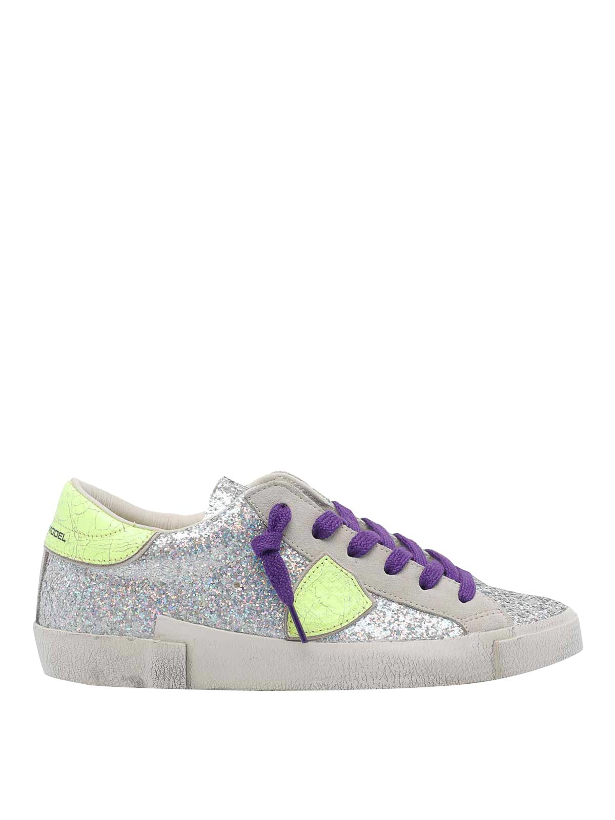 Silberne Prsx-Sneaker, Modell Philippe, runde Spitze, seitliches Logo, glitzerndes Obermaterial, Schnürverschluss