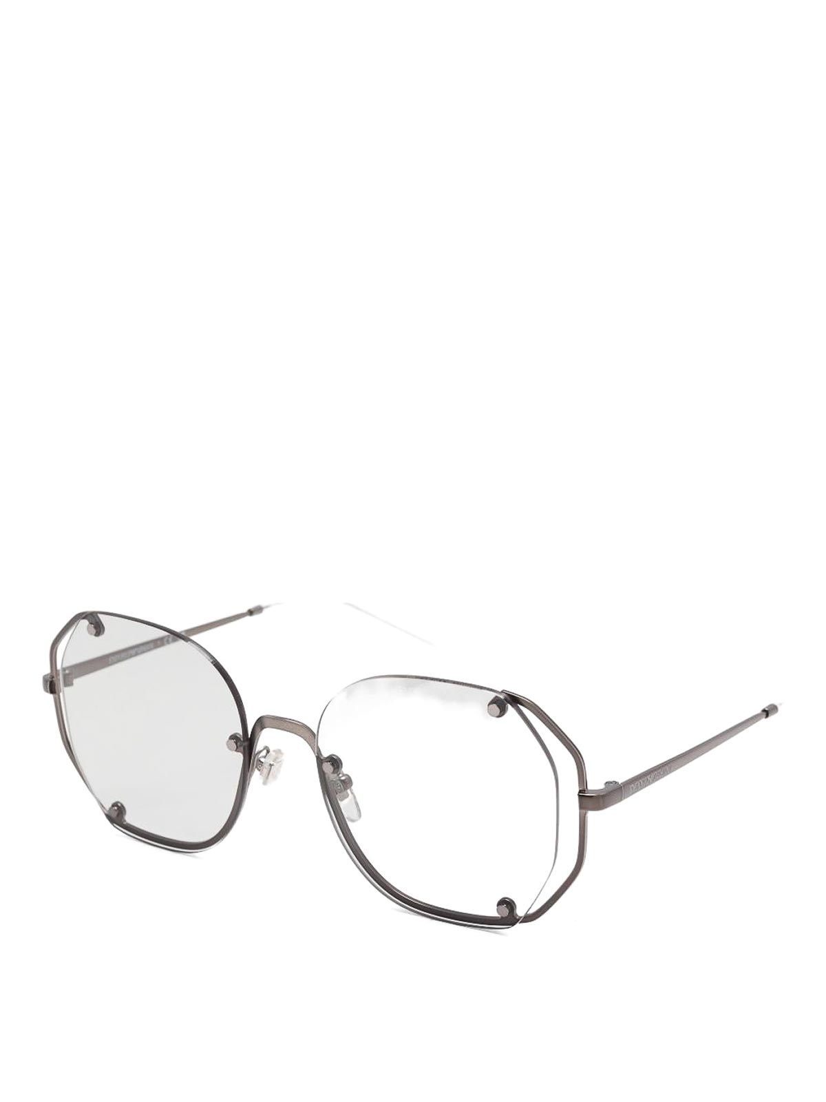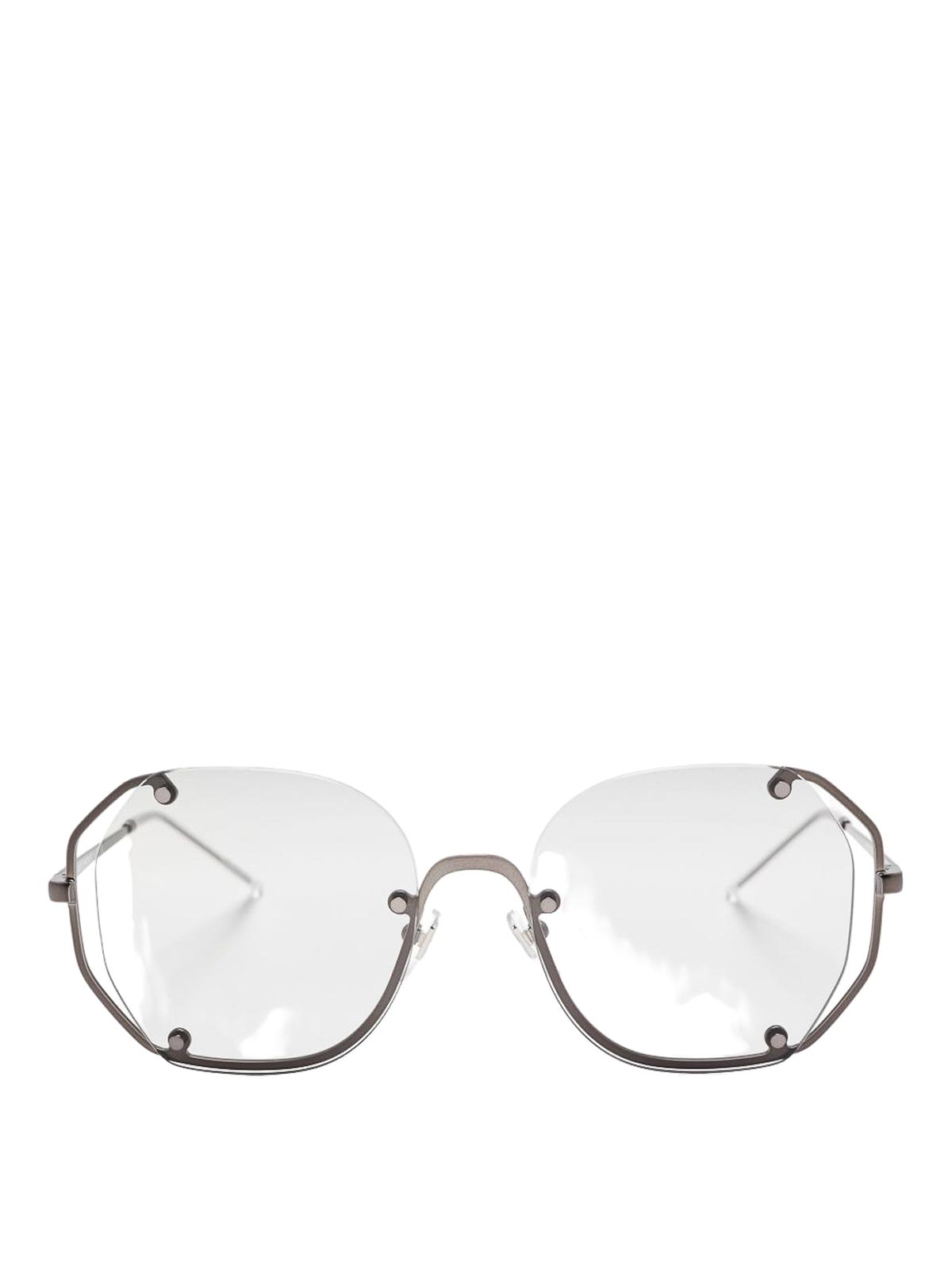 Hellgrauer geometrischer Rahmen. Diese Brille wird mit einer Schutzhülle geliefert.