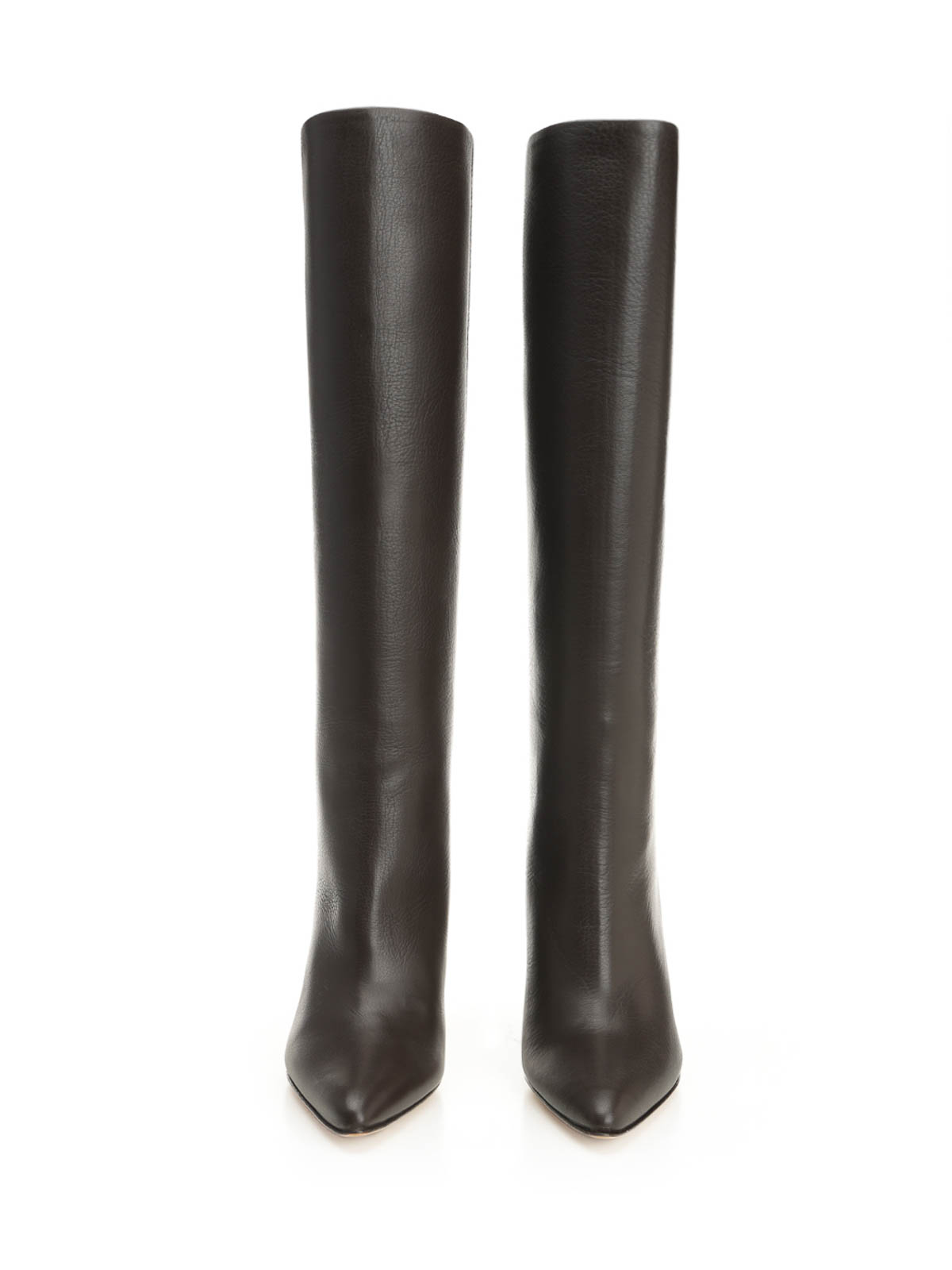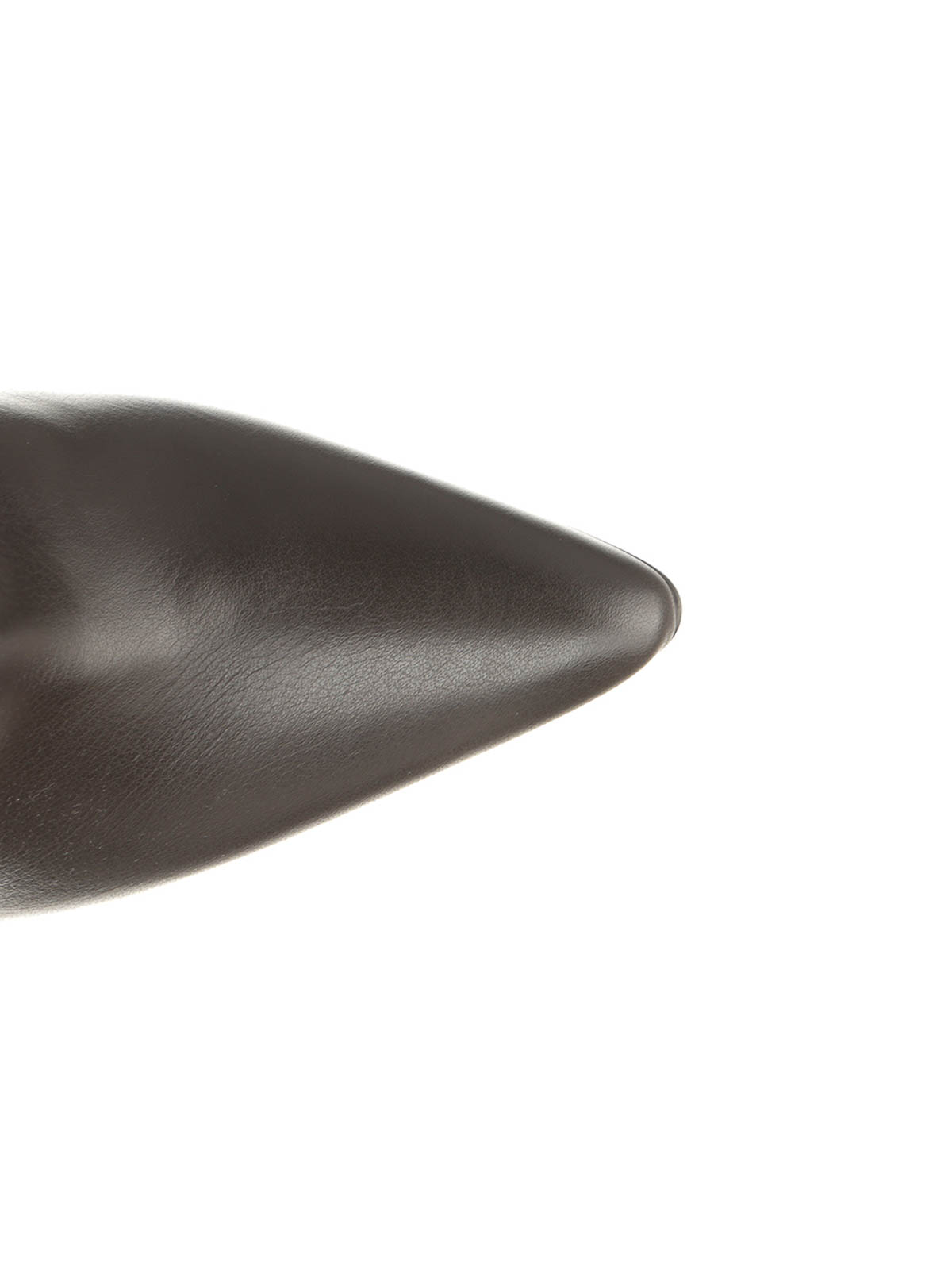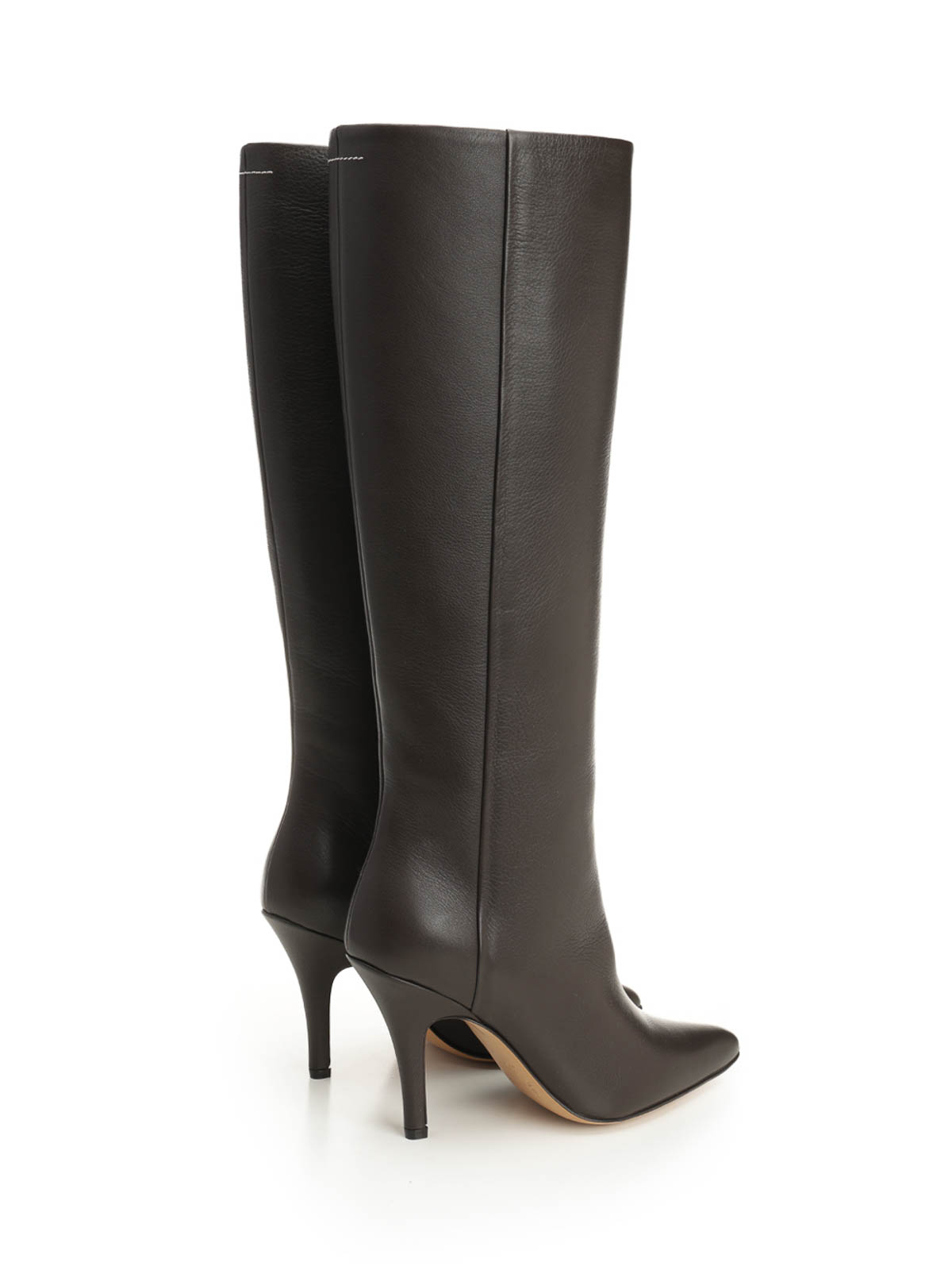 Hohe Stiefel Architype aus Kalbsleder von mm Maison Margiela mit Stiletto und weißen Nähten auf der Rückseite, Symbol der Maison