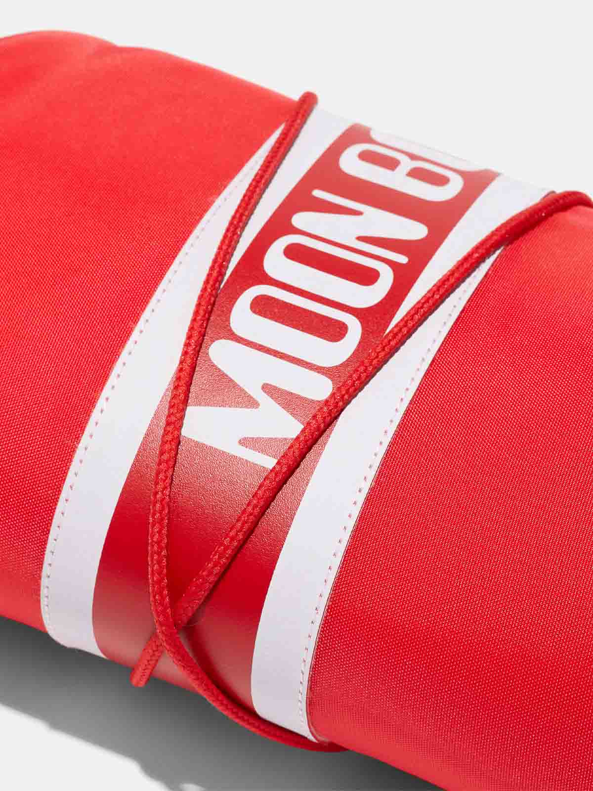 Moon Boot Icon aus Nylon in Rot. Diese Mondstiefel aus Nylon mit einer Silhouette, die von der Mondlandung 1969 inspiriert ist, verfügen über einen hohen Schaft und kreuzförmige röhrenförmige Schnürsenkel. Die Außenseite ist mit einem Logoband und PVC-Besatz verziert, während die Innenseite mit isolierendem Stoff ausgekleidet ist. Hoher Schaft, beidhändig tragbares Design, 100% wasserabweisend, Logoband, Absatz und PVC-Besatz, Metallösen, kreuzförmige Schnürsenkel, verstellbarer Kordelzug, Zwischensohle aus thermoplastischem Gummi und rutschfestes Gummiprofil.