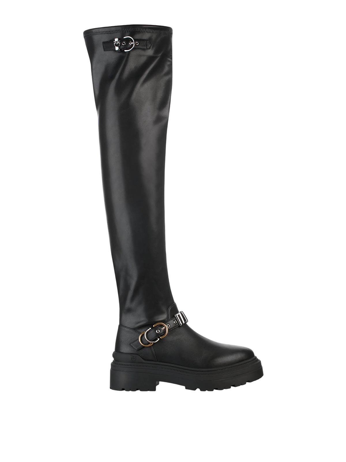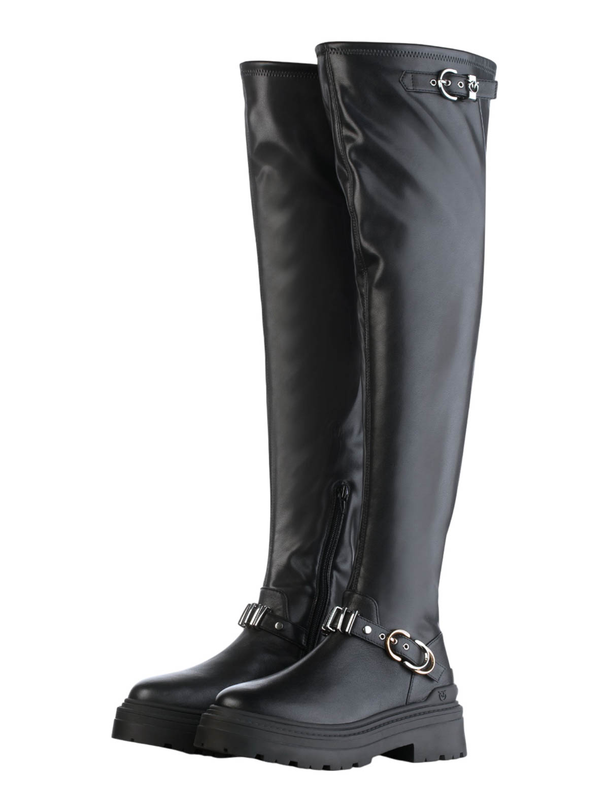 Pinko Cuissard Boots mit Metallici Mia Boots Over, The, Knee mit einem entschiedenen und raffinierten Design gemacht Stretch mit hohen Beinen und von dem Modell unterscheidet sich für den kühnen essentiellen Stil bereichert durch Metall und verstellbare Riemen mit Schnalle, von denen einer ausgestattet mit einem Passanten aus Metall mit Love Birds Logo ikonisches Symbol der Marke Der seitliche Reißverschluss sorgt für eine praktische und bequeme Socke. haftend und die schlanke Linie verbessern die ideale Silhouette für diejenigen, die wollen einen Rock und zeitgemäßer Look, der jedem lässigen oder urbanen Outfit Charakter verleiht Tragbarkeit gemacht Stretch mit metallisch hohen Beinen aus seitlichem Reißverschluss für ein einfaches Schuhwerk verstellbare Riemen mit Schnalle einer im Love Birds-Stil Rock-Stil, schick und entscheidend regulär Anziehbarkeit