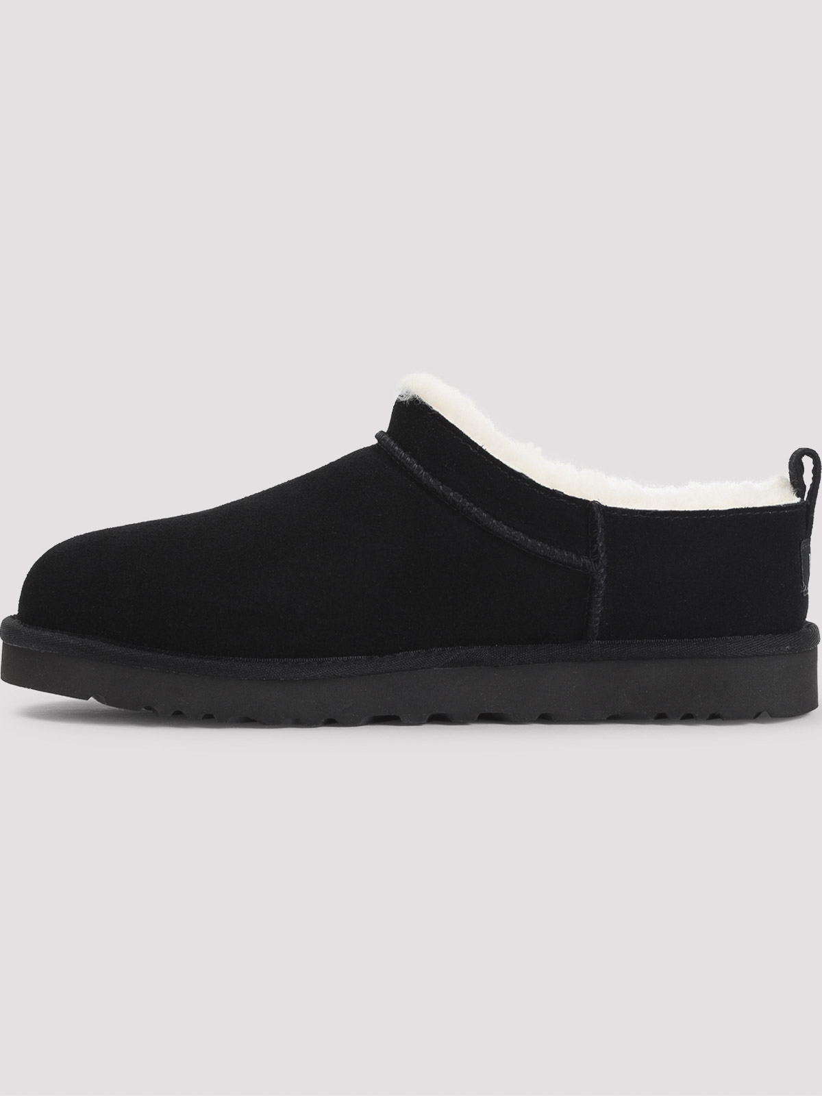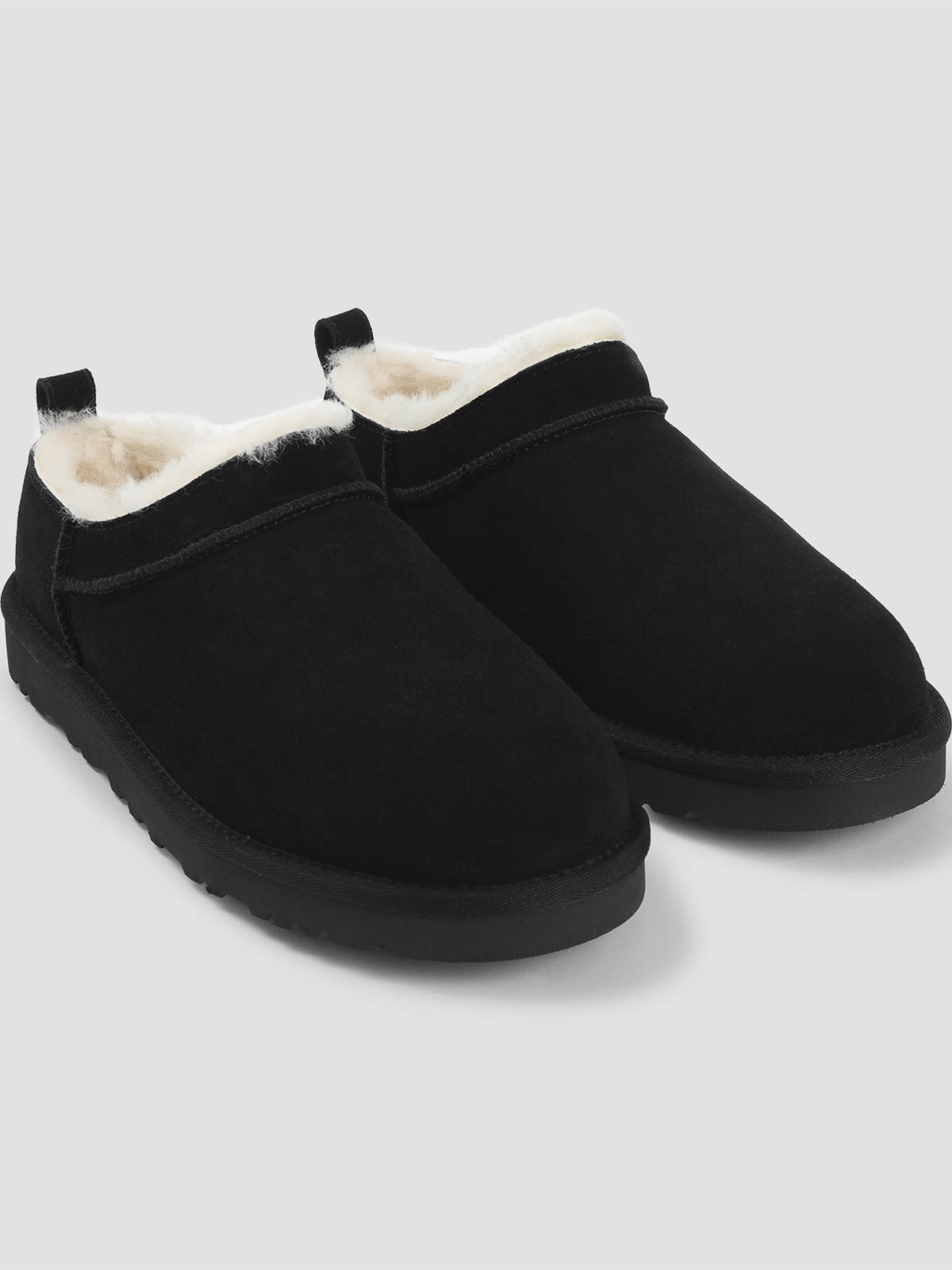 Klassische schwarze Stiefel aus Hammelleder von Ugg. Ultraniedrige Stiefel aus schwarzem Wildleder-Hammelleder. Sie zeichnen sich durch eine runde Zehenpartie, einen Ziehverschluss an der Ferse, ein Markenlabel auf der Rückseite, ein Innenfutter und eine Innensohle aus Wolle sowie eine Gummiaußensohle aus Gummi aus.