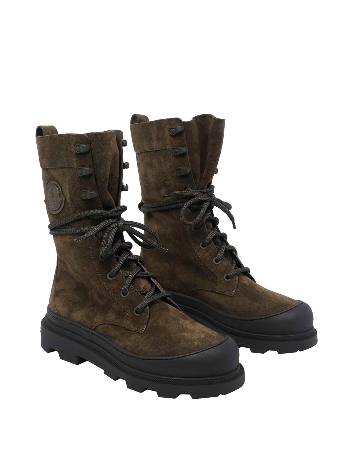 Moncler Stiefeletten aus braunem Vera mit hohem Oberteil, Schnürverschluss, Obermaterial aus Veloursleder und Gummisohle, seitliches Logo-Patch, Ton sur Tone