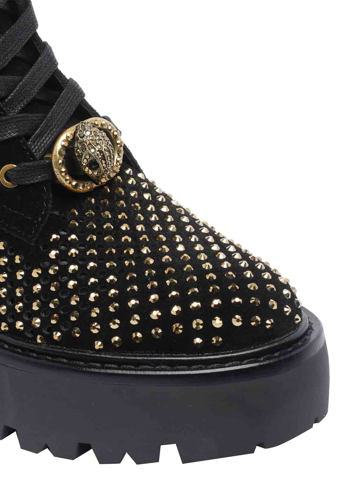 Kurt Geiger schwarze Stiefeletten, runde Zehenpartie, Vorderseite, goldenes Logo, Schnürsenkel, überall, Nieten, Designer-Farbbezeichnung: Schwarz