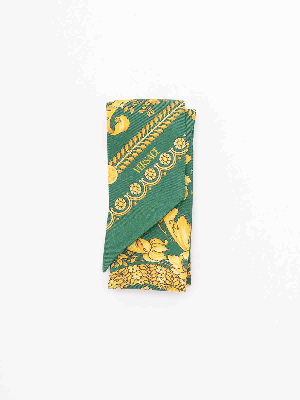 Bandeau aus bedruckter Seide Barocco 92, gekennzeichnet durch ikonische und raffinierte Grafiken. Die Farbkombination Smaragdgold unterstreicht das dekorative Design und macht das Accessoire ideal zum Verschönern von Outfits und Frisuren.
