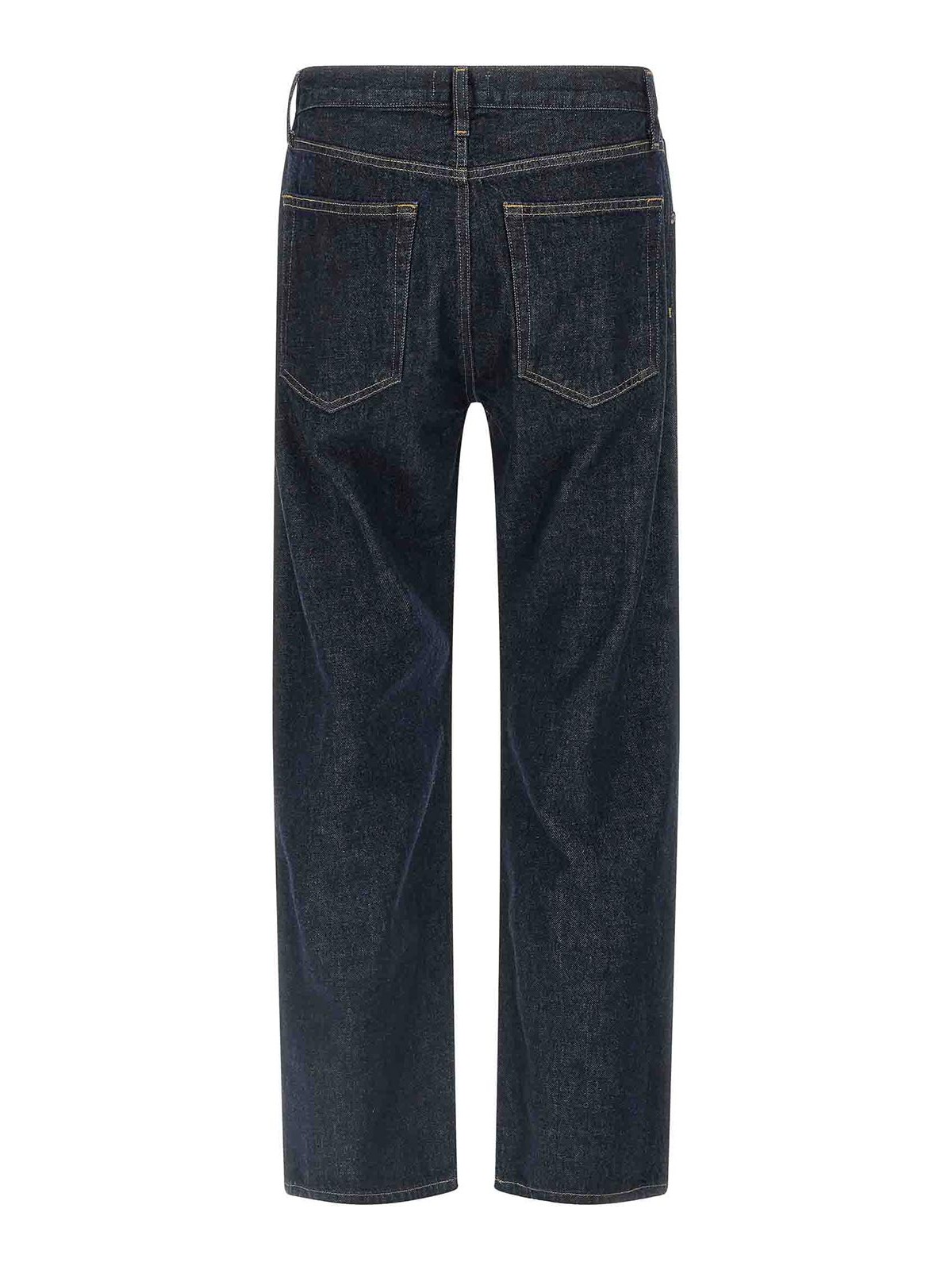 Magnus-Jeans aus waschgewaschenem Baumwolldenim mit Kontrastnähten, weitem geradem Bein, Knopfverschluss auf der Vorderseite, fünf Taschen